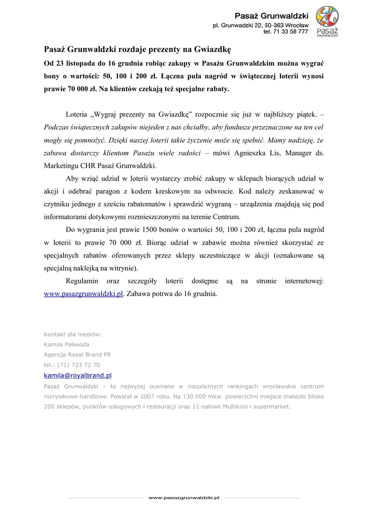 Pasaż Grunwaldzki rozdaje prezenty na Gwiazdkę Od 23 listopada do 16 grudnia robiąc zakupy w Pasażu Grunwaldzkim można wygrać bony o wartości: 50, 100 i 200 zł. Łączna pula nagród w świątecznej loterii wynosi prawie 70 000 zł. Na klientów czekają też specjalne rabaty. Loteria „Wygraj prezenty na Gwiazdkę” rozpocznie się już w najbliższy piątek. – Podczas świątecznych zakupów niejeden z nas chciałby, aby fundusze przeznaczone na ten cel mogły się pomnożyć. Dzięki naszej loterii takie życzenie może się spełnić. Mamy nadzieję, że zabawa dostarczy klientom Pasażu wiele radości – mówi Agnieszka Lis, Manager ds. Marketingu CHR Pasaż Grunwaldzki. Aby wziąć udział w loterii wystarczy zrobić zakupy w sklepach biorących udział w akcji i odebrać paragon z kodem kreskowym na odwrocie. Kod należy zeskanować w czytniku jednego z sześciu rabatomatów i sprawdzić wygraną – urządzenia znajdują się pod informatorami dotykowymi rozmieszczonymi na terenie Centrum. Do wygrania jest prawie 1500 bonów o wartości 50, 100 i 200 zł, łączna pula nagród w loterii to prawie 70 000 zł. Biorąc udział w zabawie można również skorzystać ze specjalnych rabatów oferowanych przez sklepy uczestniczące w akcji (oznakowane są specjalną naklejką na witrynie). Regulamin oraz szczegóły loterii dostępne są na stronie internetowej: www.pasazgrunwaldzki.pl. Zabawa potrwa do 16 grudnia. Kontakt dla mediów: Kamila Paliwoda Agencja Royal Brand PR tel.: (71) 723 72 70 [email protected] Pasaż Grunwaldzki – to najwyżej oceniane w niezależnych rankingach wrocławskie centrum rozrywkowo-handlowe. Powstał w 2007 roku. Na 130 000 mkw. powierzchni miejsce znalazło blisko 200 sklepów, punktów usługowych i restauracji oraz 11-salowe Multikino i supermarket.
