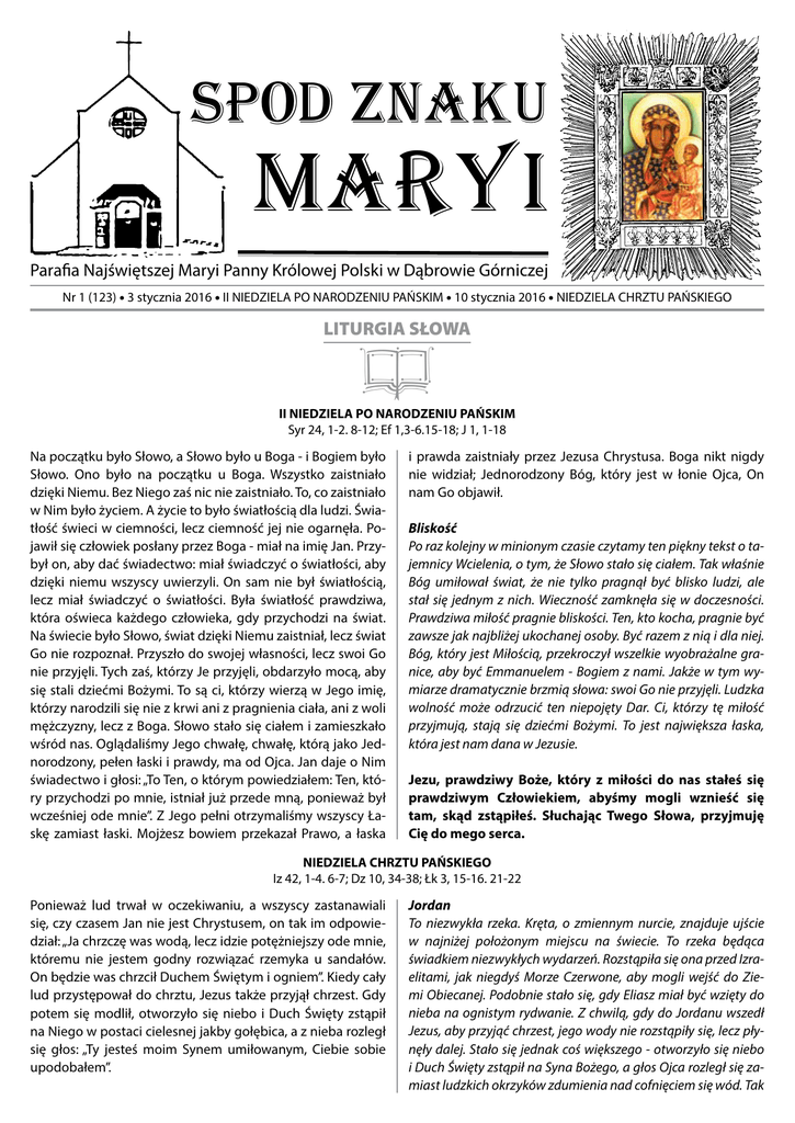 SPOD ZNAKU MARYI Parafia Najświętszej Maryi Panny Królowej Polski w Dąbrowie Górniczej Nr 1 (123) • 3 stycznia 2016 • II NIEDZIELA PO NARODZENIU PAŃSKIM • 10 stycznia 2016 • NIEDZIELA CHRZTU PAŃSKIEGO LITURGIA SŁOWA | II NIEDZIELA PO NARODZENIU PAŃSKIM Syr 24, 1-2. 8-12; Ef 1,3-6.15-18; J 1, 1-18 Na początku było Słowo, a Słowo było u Boga - i Bogiem było Słowo. Ono było na początku u Boga. Wszystko zaistniało dzięki Niemu. Bez Niego zaś nic nie zaistniało. To, co zaistniało w Nim było życiem. A życie to było światłością dla ludzi. Światłość świeci w ciemności, lecz ciemność jej nie ogarnęła. Pojawił się człowiek posłany przez Boga - miał na imię Jan. Przybył on, aby dać świadectwo: miał świadczyć o światłości, aby dzięki niemu wszyscy uwierzyli. On sam nie był światłością, lecz miał świadczyć o światłości. Była światłość prawdziwa, która oświeca każdego człowieka, gdy przychodzi na świat. Na świecie było Słowo, świat dzięki Niemu zaistniał, lecz świat Go nie rozpoznał. Przyszło do swojej własności, lecz swoi Go nie przyjęli. Tych zaś, którzy Je przyjęli, obdarzyło mocą, aby się stali dziećmi Bożymi. To są ci, którzy wierzą w Jego imię, którzy narodzili się nie z krwi ani z pragnienia ciała, ani z woli mężczyzny, lecz z Boga. Słowo stało się ciałem i zamieszkało wśród nas. Oglądaliśmy Jego chwałę, chwałę, którą jako Jednorodzony, pełen łaski i prawdy, ma od Ojca. Jan daje o Nim świadectwo i głosi: „To Ten, o którym powiedziałem: Ten, który przychodzi po mnie, istniał już przede mną, ponieważ był wcześniej ode mnie”. Z Jego pełni otrzymaliśmy wszyscy Łaskę zamiast łaski. Mojżesz bowiem przekazał Prawo, a łaska i prawda zaistniały przez Jezusa Chrystusa. Boga nikt nigdy nie widział; Jednorodzony Bóg, który jest w łonie Ojca, On nam Go objawił. Bliskość Po raz kolejny w minionym czasie czytamy ten piękny tekst o tajemnicy Wcielenia, o tym, że Słowo stało się ciałem. Tak właśnie Bóg umiłował świat, że nie tylko pragnął być blisko ludzi, ale stał się jednym z nich. Wieczność zamknęła się w doczesności. Prawdziwa miłość pragnie bliskości. Ten, kto kocha, pragnie być zawsze jak najbliżej ukochanej osoby. Być razem z nią i dla niej. Bóg, który jest Miłością, przekroczył wszelkie wyobrażalne granice, aby być Emmanuelem - Bogiem z nami. Jakże w tym wymiarze dramatycznie brzmią słowa: swoi Go nie przyjęli. Ludzka wolność może odrzucić ten niepojęty Dar. Ci, którzy tę miłość przyjmują, stają się dziećmi Bożymi. To jest największa łaska, która jest nam dana w Jezusie. Jezu, prawdziwy Boże, który z miłości do nas stałeś się prawdziwym Człowiekiem, abyśmy mogli wznieść się tam, skąd zstąpiłeś. Słuchając Twego Słowa, przyjmuję Cię do mego serca. NIEDZIELA CHRZTU PAŃSKIEGO Iz 42, 1-4. 6-7; Dz 10, 34-38; Łk 3, 15-16. 21-22 Ponieważ lud trwał w oczekiwaniu, a wszyscy zastanawiali się, czy czasem Jan nie jest Chrystusem, on tak im odpowiedział: „Ja chrzczę was wodą, lecz idzie potężniejszy ode mnie, któremu nie jestem godny rozwiązać rzemyka u sandałów. On będzie was chrzcił Duchem Świętym i ogniem”. Kiedy cały lud przystępował do chrztu, Jezus także przyjął chrzest. Gdy potem się modlił, otworzyło się niebo i Duch Święty zstąpił na Niego w postaci cielesnej jakby gołębica, a z nieba rozległ się głos: „Ty jesteś moim Synem umiłowanym, Ciebie sobie upodobałem”. Jordan To niezwykła rzeka. Kręta, o zmiennym nurcie, znajduje ujście w najniżej położonym miejscu na świecie. To rzeka będąca świadkiem niezwykłych wydarzeń. Rozstąpiła się ona przed Izraelitami, jak niegdyś Morze Czerwone, aby mogli wejść do Ziemi Obiecanej. Podobnie stało się, gdy Eliasz miał być wzięty do nieba na ognistym rydwanie. Z chwilą, gdy do Jordanu wszedł Jezus, aby przyjąć chrzest, jego wody nie rozstąpiły się, lecz płynęły dalej. Stało się jednak coś większego - otworzyło się niebo i Duch Święty zstąpił na Syna Bożego, a głos Ojca rozległ się zamiast ludzkich okrzyków zdumienia nad cofnięciem się wód. Tak objawił się nam Bóg w Trójcy, gdy w ludzkim ciele przyszedł nad Jordan, by przyjąć chrzest. Jezu, Synu Boży, w dniu chrztu również otwarło się nade mną niebo i zostałem nazwany przez Ojca umiłowanym dzieckiem. Dziękuję za ten dar i chcę zachować wierność łasce sakramentu. PRZED ŚWIATOWYMI DNIAMI MŁODZIEŻY (4) Ambasadorzy ŚDM Znani dziennikarze, aktorzy, muzycy, sportowcy, podróżnicy czy działacze społeczni będą popularyzować spotkanie młodych w Krakowie w lipcu 2016 roku oraz rozpowszechniać idee Światowych Dni Młodzieży. Ambasadorzy to ludzie, którzy swoją postawą inspirują młodych ludzi. Pomagają zapraszać pielgrzymów do Krakowa i przez kolejne 8 miesięcy mówić o tej wielkiej idei Światowych Dni Młodzieży. Dzięki swoim dokonaniom zawodowym Ambasadorzy są również przykładem, że wiara chrześcijańska jest fundamentem dobrego i kreatywnego życia. Ambasadorzy Światowych Dni Młodzieży to osoby wywodzące się z różnych środowisk. Wśród zaszczytnego grona znaleźli się m.in. aktorzy (Radosław Pazura czy Maciej Musiał), muzycy (Patrycja i Grzegorz Markowscy, Łukasz i Paweł Golcowie, Muniek Staszczyk czy Darek Malejonek), dziennikarze (Przemysław Babiarz i Brygida Grysiak-Ciesiołkiewicz), duchowni (bp Rafał Markowski, ks. Jan Kaczkowski), sportowcy (Jerzy Dudek czy Mateusz Ligocki) oraz podróżnicy (Marek Kamiński i Jan Mela). -Moim zdaniem moc całej naszej grupy polega na różnorodności. Na tym, że nie jesteśmy ikonami religijności i świętości, bo generalnie ludzie nie są święci. Są wadliwi, bardzo często słabi, tak jak i my. Sądzę, że przez tą różnorodność wielu innych ludzi może odnaleźć się w his