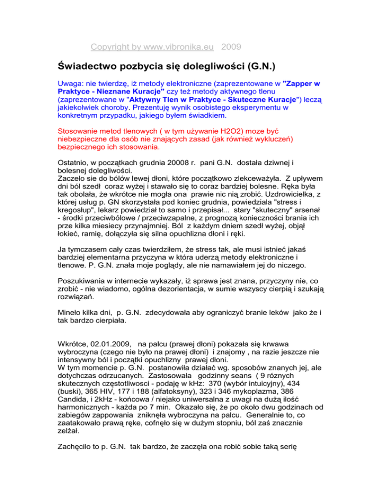 Copyright by www.vibronika.eu 2009 Świadectwo pozbycia się dolegliwości (G.N.) Uwaga: nie twierdzę, iż metody elektroniczne (zaprezentowane w "Zapper w Praktyce - Nieznane Kuracje" czy też metody aktywnego tlenu (zaprezentowane w "Aktywny Tlen w Praktyce - Skuteczne Kuracje") leczą jakiekolwiek choroby. Prezentuję wynik osobistego eksperymentu w konkretnym przypadku, jakiego byłem świadkiem. Stosowanie metod tlenowych ( w tym używanie H2O2) moze być niebezpieczne dla osób nie znających zasad (jak również wykluczeń) bezpiecznego ich stosowania. Ostatnio, w początkach grudnia 20008 r. pani G.N. dostała dziwnej i bolesnej dolegliwości. Zaczelo sie do bólów lewej dłoni, które początkowo zlekceważyła. Z upływem dni ból szedł coraz wyżej i stawało się to coraz bardziej bolesne. Ręka była tak obolała, że wkrótce nie mogła ona prawie nic nią zrobić. Uzdrowicielka, z której usług p. GN skorzystała pod koniec grudnia, powiedziala "stress i kregosłup", lekarz powiedział to samo i przepisał... stary "skuteczny" arsenał - środki przeciwbólowe / przeciwzapalne, z prognozą konieczności brania ich prze kilka miesiecy przynajmniej. Ból z każdym dniem szedł wyżej, objął łokieć, ramię, dołączyła się silna opuchlizna dłoni i ręki. Ja tymczasem cały czas twierdziłem, że stress tak, ale musi istnieć jakaś bardziej elementarna przyczyna w która uderzą metody elektroniczne i tlenowe. P. G.N. znała moje poglądy, ale nie namawiałem jej do niczego. Poszukiwania w internecie wykazały, iż sprawa jest znana, przyczyny nie, co zrobić - nie wiadomo, ogólna dezorientacja, w sumie wszyscy cierpią i szukają rozwiązań. Mineło kilka dni, p. G.N. zdecydowała aby ograniczyć branie leków jako że i tak bardzo cierpiała. Wkrótce, 02.01.2009, na palcu (prawej dłoni) pokazała się krwawa wybroczyna (czego nie było na prawej dłoni) i znajomy , na razie jeszcze nie intensywny ból i początki opuchlizny prawej dłoni. W tym momencie p. G.N. postanowiła działać wg. sposobów znanych jej, ale dotychczas odrzucanych. Zastosowała godzinny seans ( 9 róznych skutecznych częstotliwosci - podaję w kHz: 370 (wybór intuicyjny), 434 (buski), 365 HIV, 177 i 188 (alfatoksyny), 323 i 346 mykoplazma, 386 Candida, i 2kHz - końcowa / niejako uniwersalna z uwagi na dużą ilość harmonicznych - każda po 7 min. Okazało się, że po około dwu godzinach od zabiegów zappowania zniknęła wybroczyna na palcu. Generalnie to, co zaatakowało prawą ręke, cofnęło się w dużym stopniu, ból zaś znacznie zelżał. Zachęcilo to p. G.N. tak bardzo, że zaczęła ona robić sobie taką serię codziennie rano, stwierdzając wyraźne "puszczanie" bólu bezpośrednio po zabiegu, a dodatkowo pić wieczorem po 10 kropli perhydrolu rozpuszczonych w szklance wody. Praktycznie po kilku dniach problem rozpoczynający się w prawej ręce był rozwiązany, dolegliwości minęły, zaś w lewej ręce następowała szybka, systematyczna poprawa. W dwa tygodnie od rozpoczęcia tych zabiegów p. G.N. oceniła, iż ból prawej ręki dawno przeminął, zaś ból lewej ręki zmniejszył się o ok. 70%, i mogła ona juz tą ręką wiele rzeczy zrobić i nie budzić sie z bólu w nocy. Jest pełna optymizmu liczy na to, że w ciagu kilku tygodni będzie juz zupełnie dobrze, a ja mam sądzę, że jeśli zdecyduje sie ona na stałe używanie zappera dwa razy w tygodniu, jak również picie H2O2 ze 2-3 razy w tyg. po kilka choćby kropel, może to odbudowywać jej system odpornościowy. Chcę powtórzyć, że nic ciekawego na temat jej dolegliwości nie znalazłem w internecie po polsku, owszem, natomiast znalazłem sporo w jezyku angielskim, ale... ludzie cierpią i nie wiedzą co zrobić... Za parę tygodni będę, mam nadzieję, już osobiście przekonany, że sposoby bioelektroniczne skutecznie podziałały i na taką dolegliwość. ***Dopisek z dn. 03.03.2009 Do końca lutego woda z H2O2 była pita jeden raz codziennie - kilka kropel w szklance wody, jak również wspomniane powyżej zabiegi zapperem. Od tego czasu, zappowanie jak również pice wody - wyrywkowo, raz lub dwa w tygpdniu. Nie mniej - dolegliwości całkowicie minęły. ***Dopisek z dn. 12.04.2009 - Nie ma nawet śladu po żadnych dolegliwościach. ____________________________________________________