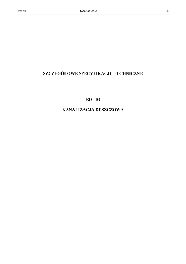 BD-03 Odwodnienie SZCZEGÓŁOWE SPECYFIKACJE TECHNICZNE BD - 03 KANALIZACJA DESZCZOWA 21 BD-03 Odwodnienie 22 1. WSTĘP 1.1. Przedmiot SST Przedmiotem niniejszej szczegółowej specyfikacji technicznej (SST) są wymagania dotyczące wykonania i odbioru robót związanych z kanalizacją deszczową jezdni. 1.2. Zakres stosowania SST Szczegółowa specyfikacji technicznej (SST) stanowi dokument przetargowy przy zlecaniu i realizacji robót związanych z naprawą wjazdu i wyjazdu parkingu przy młynie. 1.3. Zakres robót objętych SST Ustalenia zawarte w niniejszej specyfikacji dotyczą zasad prowadzenia robót związanych z wykonaniem kanalizacji deszczowej przy budowie, modernizacji i remontach dróg. 1.4. Określenia podstawowe 1.4.1. Kanalizacja deszczowa - sieć kanalizacyjna zewnętrzna przeznaczona do odprowadzania ścieków opadowych. 1.4.2. Kanały 1.4.2.1. Kanał - liniowa budowla przeznaczona do grawitacyjnego odprowadzania ścieków. 1.4.2.2. Kanał deszczowy - kanał przeznaczony do odprowadzania ścieków opadowych. 1.4.2.3. Przykanalik - kanał przeznaczony do połączenia wpustu deszczowego z siecią kanalizacji deszczowej. 1.4.2.4. Kanał zbiorczy - kanał przeznaczony do zbierania ścieków z co najmniej dwóch kanałów bocznych. 1.4.2.5. Kolektor główny - kanał przeznaczony do zbierania ścieków z kanałów oraz kanałów zbiorczych i odprowadzenia ich do odbiornika. 1.4.2.6. Kanał nieprzełazowy - kanał zamknięty o wysokości wewnętrznej mniejszej niż 1,0 m. 1.4.2.7. Kanał przełazowy - kanał zamknięty o wysokości wewnętrznej równej lub większej niż 1,0 m. 1.4.3. Urządzenia (elementy) uzbrojenia sieci 1.4.3.1. Studzienka kanalizacyjna - studzienka rewizyjna - na kanale nie przełazowym przeznaczona do kontroli i prawidłowej eksploatacji kanałów. 1.4.3.2. Studzienka przelotowa - studzienka kanalizacyjna zlokalizowana na załamaniach osi kanału w planie, na załamaniach spadku kanału oraz na odcinkach prostych. 1.4.3.3. Studzienka połączeniowa - studzienka kanalizacyjna przeznaczona do łączenia co najmniej dwóch kanałów dopływowych w jeden kanał odpływowy. 1.4.3.4. Studzienka bez włazowa - ślepa - studzienka kanalizacyjna przykryta stropem bez otworu włazowego, spełniająca funkcje studzienki połączeniowej. 1.4.3.5. Komora kanalizacyjna - komora rewizyjna na kanale przełazowym przeznaczona do kontroli i prawidłowej eksploatacji kanałów. 1.4.3.6. Komora połączeniowa - komora kanalizacyjna przeznaczona do łączenia co najmniej dwóch kanałów dopływowych w jeden kanał odpływowy. 1.4.4. Elementy studzienek i komór 1.4.4.1. Komora robocza - zasadnicza część studzienki lub komory przeznaczona do czynności eksploatacyjnych. Wysokość komory roboczej jest to odległość pomiędzy rzędną dolnej powierzchni płyty lub innego elementu przykrycia studzienki lub komory, a rzędną spocznika. 1.4.4.2. Komin włazowy - szyb połączeniowy komory roboczej z powierzchnią ziemi, przeznaczony do zejścia obsługi do komory roboczej. 1.4.4.3. Płyta przykrycia studzienki lub komory - płyta przykrywająca komorę roboczą. 1.4.4.4. Właz kanałowy - element żeliwny przeznaczony do przykrycia podziemnych studzienek rewizyjnych lub komór kanalizacyjnych, umożliwiający dostęp do urządzeń kanalizacyjnych. 1.4.4.5. Kineta - wyprofilowany rowek w dnie studzienki, przeznaczony do przepływu w nim ścieków. 1.4.4.6. Spocznik - element dna studzienki lub komory kanalizacyjnej pomiędzy kinetą a ścianą komory roboczej. BD-03 Odwodnienie 23 1.4.5. Pozostałe określenia podstawowe są zgodne z obowiązującymi, odpowiednimi polskimi normami i z definicjami podanymi w SST BD-00 „Wymagania ogólne” pkt 1.4. 1.5. Ogólne wymagania dotyczące robót Ogólne wymagania dotyczące robót podano w SST BD-00 „Wymagania ogólne” pkt 1.5. 2. MATERIAŁY 2.1. Ogólne wymagania dotyczące materiałów Ogólne wymagania dotyczące materiałów, ich pozyskiwania i składowania podano w SST BD-00 „Wymagania ogólne” pkt 2. 2.2. Przykanaliki Rury z tworzywa sztucznego PVC lub PP średnicy 200 mm, o klasie sztywności obwodowej SN8. 2.3. Studzienki ściekowe 2.3.1. Wpusty uliczne Wpusty uliczne żeliwne powinny odpowiadać wymaganiom PN-H-74080-01 [12] i PN-H-74080-04 [13] i być klasy D400. 2.3.2. Kręgi betonowe prefabrykowane Na studzienki ściekowe stosowane są prefabrykowane kręgi betonowe o średnicy 50 cm i odpowiedniej wysokości z betonu klasy B 25, wg KB1-22.2.6 (6) [22]. 2.3.3. Pierścienie żelbetowe prefabrykowane Pierścienie żelbetowe prefabrykowane o średnicy 65 cm powinny być wykonane z betonu wibrowanego klasy B 20 zbrojonego stalą StOS. 2.3.4. Kruszywo na podsypkę Podsypka może być wykonana z tłucznia, żwiru lub piasku. Użyty materiał na podsypkę powinien odpowiadać wymaganiom stosownych norm, np. PN-B-06712 [7], PN-B-11111 [3], PN-B-11112 [4]. 2.4. Zaprawa cementowa Zaprawa cementowa powinna odpowiadać wymaganiom PN-B-14501 [7]. 2.5. Składowanie materiałów 2.5.1. Rury Rury można składować na otwartej przestrzeni, układając je w pozycji leżącej jedno- lub wielowarstwowo. Powierzchnia składowania powinna być utwardzona i zabezpieczona przed gromadzeniem się wód opadowych. W przypadku składowania poziomego pierwszą warstwę rur należy ułożyć na podkładach drewnianych. Wykonawca jest zobowiązany układać rury według poszczególnych grup, wielkości i gatunków w sposób zapewniający stateczność oraz umożliwiający dostęp do poszczególnych stosów lub pojedynczych rur. 2.5.2. Kręgi Kręgi można składować na powierzchni nieutwardzonej pod warunkiem, że nacisk kręgów przekazywany na grunt nie przekracza 0,5 MPa. Przy składowaniu wyrobów w pozycji wbudowania wysokość składowania nie powinna przekraczać 1,8 m. Składowanie powinno umożliwiać dostęp do poszczególnych stosów wyrobów lub pojedynczych kręgów. 2.5.3. Kruszywo Kruszywo należy składować na utwardzony