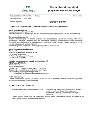 Karta charakterystyki preparatu niebezpiecznego Data sporządzenia: 01.12.2000 Data aktualizacji: Wersja: Strona 1 z 9 24.05.2008 Nazwa wyrobu: Buracyl 80 WP 1. IDENTYFIKACJA PREPARATU I IDENTYFIKACJA PRZEDSIĘBIORSTWA Identyfikacja preparatu Nazwa handlowa: Buracyl 80 WP Nazwa chemiczna: 3-cyklohesylo-1,5,6,7-tetrahydrocyklopentapirimidyno-2,4(3H)-dion (lenacyl) Zastosowanie preparatu Środek chwastobójczy w formie proszku do sporządzania zawiesiny wodnej, stosowany doglebowo i nalistnie, przeznaczony do zwalczania chwastów dwuliściennych oraz niektórych chwastów jednoliściennych w następujących roślinach: burak cukrowy, burak pastewny, burak ćwikłowy, truskawka, szpinak, tulipan. Stosować zgodnie z etykietą – instrukcją dołączoną do opakowania. Identyfikacja przedsiębiorstwa Producent Du Pont de Nemours (France) S.A.S 137. rue de l’Universite F- 75334 Paris Cedex 07 France Tel.: 00 33 1 45 50 65 5 Podmiot wprowadzający środek na terytorium RP ROKITA-AGRO S.A. Sienkiewicza 4 56-120 Brzeg Dolny Telefon: +48 71 794 25 07; Fax: +48 71 794 21 50 Osoba odpowiedzialna za kartę charakterystyki: e-mail: [email protected] [email protected] Telefon alarmowy Telefon całodobowy: +48 71 319 25 55 lub +48 71 319 24 41 w PCC Rokita SA lub do najbliŜszej terenowej Państwowej StraŜy PoŜarnej. 2. IDENTYFIKACJA ZAGROśEŃ Produkt niebezpieczny dla środowiska (N) Działa bardzo toksycznie na organizmy wodne; moŜe powodować długo utrzymujące się niekorzystne zmiany w środowisku wodnym. (R50/53) Działa bardzo toksycznie na organizmy wodne; moŜe powodować długo utrzymujące się niekorzystne zmiany w środowisku wodnym. Karta charakterystyki preparatu niebezpiecznego Data sporządzenia: 01.12.2000 Data aktualizacji: Wersja: Strona 2 z 9 24.05.2008 Nazwa wyrobu: Buracyl 80 WP 3. SKŁAD / INFORMACJA O SKŁADNIKACH Nazwa chemiczna: Wzór sumaryczny: Nazwa składników: Klasyfikacja: 3-cyklohesylo-1,5,6,7-tetrahydrocyklopentapirimidyno-2,4(3H)-dion (Lenacyl) C13H 8N2O2 Lenacyl, 80 % N; R50/53 Numer indeksowy: Numer(y) CAS: Numer WE: Informacje dodatkowe: 2164-08-1 218-499-0 brak Alkilowana sól sodowa kwasu naftalenosulfonowego C16H20O3S Na 2% Xn; R22, Xi; R36 1322-93-6 215-343-3 brak 4. PIERWSZA POMOC Wdychanie Wyprowadzić poszkodowanego na świeŜe powietrze. W razie potrzeby podać tlen lub wykonać sztuczne oddychanie W przypadku silnego zatrucia zasięgnąć porady lekarza Kontakt ze skórą Zdjąć zanieczyszczone środkiem ubranie i obuwie, bezzwłocznie umyć skaŜone partie skóry duŜą ilością wody z mydłem. Jeśli podraŜnienie skóry nie ustępuje zasięgnąć porady lekarza Kontakt z okiem Bezzwłocznie przemyć oczy duŜą ilością wody, równieŜ pod powiekami, przez co najmniej 15 minut. JeŜeli podraŜnienie utrzymuje się, zasięgnąć porady lekarza. Połknięcie Nie prowokować wymiotów bez zasięgnięcia porady lekarza. Nie podawać niczego doustnie, jeŜeli poszkodowana osoba jest nieprzytomna. W razie wypadku lub gdy poczujesz się źle – natychmiast zasięgnij porady lekarza (pokaŜ etykietę jeśli to moŜliwe). Wskazówki dla lekarza Pierwszą czynnością lekarza przejmującego opiekę nad zatrutym, jest ocena prawidłowości i skuteczności działania pomocy doraźnej. Dalsze postępowanie zaleŜne jest od stanu zatrutego. Brak specyficznej odtrutki. Stosować leczenie objawowe. Osoby zatrute winny pozostać pod kontrolą lekarską przez co najmniej 48 godzin. 5. POSTĘPOWANIE W PRZYPADKU POśARU Środki gaśnicze właściwe woda, piana, suche chemikalia, dwutlenek węgla (CO2) Środki gaśnicze, których nie wolno uŜywać ze względów bezpieczeństwa Nie są znane. Środki ochrony indywidualnej dla straŜaków Personel bezpośrednio uczestniczący w gaszeniu poŜaru powinien posiadać odpowiednie lekkie ubranie chroniące skórę (gazoszczelne) i być zaopatrzony w sprzęt izolujący drogi oddechowe np. aparat do oddychania. Informacje dodatkowe Ze względów bezpieczeństwa nie uŜywać silnego strumienia wody (ryzyko skaŜenia). Karta charakterystyki preparatu niebezpiecznego Data sporządzenia: 01.12.2000 Data aktualizacji: Wersja: Strona 3 z 9 24.05.2008 Nazwa wyrobu: Buracyl 80 WP W przypadku niewielkiego poŜaru, jeŜeli budynek nie jest mocno naraŜony na ogień i jeŜeli warunki na to pozwalają, pozwolić, aby ogień zgasł sam, poniewaŜ woda moŜe zwiększyć skaŜenie. Schłodzić pojemniki / zbiorniki z wodą do gaszenia. 6. POSTĘPOWANIE W PRZYPADKU NIEZAMIERZONEGO UWOLNIENIA DO ŚRODOWISKA Indywidualne środki ostroŜności Nie wdychać oparów. Unikać kontaktu z preparatem. UŜywać wyposaŜenia ochrony osobistej Środowiskowe środki ostroŜności Nie spłukiwać do wód powierzchniowych, gruntowych ani do kanalizacji oraz do gleby. Metody oczyszczania/usuwania Natychmiast zebrać środek szufelką lub odkurzaczem. Do zbierania uŜywać odkurzacza przemysłowego. Zbierać do odpowiedniego pojemnika w celu dalszego usunięcia. Jeśli wypadek nastąpił w pobliŜu cennych roślin zielnych lub drzew po wstępnym oczyszczeniu usunąć warstwę gleby grubości 5 cm. 7. POSTĘPOWANIE Z PREPARATEM I JEGO MAGAZYNOWANIE Posługiwanie się produktem Postępować zgodnie ze wskazówkami podanymi na etykiecie-instrukcji dołączonej do opakowania. Zapewnić właściwe wietrzenie w miejscach, w których powstaje pył. UŜywać wyposaŜenia ochrony osobistej. Zabezpieczenie przed wybuchem i poŜarem: Przechowywać z dala od źródeł ciepła i źródeł zapłonu. Magazynowanie Przechowywać opakowania szczelnie zamknięte w suchym, chłodnym i dobrze przewietrzanym miejscu, niedostępnym dla osób niepowołanych. Produkty, z którymi nie wolno mieszać środka: brak specjalnych wskazań. Rodzaj opakowań: brak specjalnych wymagań. Dodatkowe informacje: przechowywać z dala od dostępu dzieci. Specyficzne zastosowania: Nie są znane 8. KONTROLA NARAśENIA I ŚRODKI OCHRONY INDYWIDUALNEJ Wartości graniczne naraŜenia NDS, NDSCh 