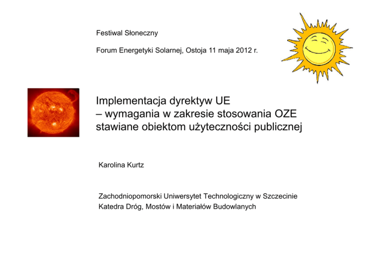 Festiwal Słoneczny Forum Energetyki Solarnej, Ostoja 11 maja 2012 r. Implementacja dyrektyw UE – wymagania w zakresie stosowania OZE stawiane obiektom użyteczności publicznej Karolina Kurtz Zachodniopomorski Uniwersytet Technologiczny w Szczecinie Katedra Dróg, Mostów i Materiałów Budowlanych 3 x 20 Szczyt Rady Europejskiej 8-9 marca 2007 r. Plan Działań integrujący politykę klimatyczną i energetyczną WE, aby ograniczyć wzrost średniej globalnej temperatury o więcej niż 2 st. C powyżej poziomu sprzed okresu uprzemysłowienia oraz zmniejszyć zagrożenie wzrostem cen i ograniczoną dostępnością ropy i gazu 20 % redukcji emisji gazów cieplarnianych do 2020 r. w porównaniu do 1990 r. 20 % ograniczenie zużycia energii na skutek racjonalizacji jej wykorzystania 20 % zwiększenie udziału energii produkowanej ze OZE całkowitego zużycia energii średnio w UE w 2020 r. jak osiągnąć nowe cele UE dotyczące redukcji zużycia energii ? poprawa efektywności produkcji energii elektrycznej regularne aktualizowanie minimalnych wymagań dot. urządzeń wykorzystujących energię oszczędności energii w budynkach większa efektywność energetyczna transportu kształtowanie świadomości użytkowników energii…. Karolina Kurtz, dr inż., arch. Zachodniopomorski Uniwersytet Technologiczny w Szczecinie 2 odnawialne źródła energii terminem energia odnawialna określa się energię pozyskiwaną ze źródeł niewyczerpalnych energia solarna energia wiatru energia pływów i fal morskich energia biomasy elektrownie wodne obieg wody elektrownie wiatrowe wiatr biomasa elektrownia ogrzewanie ogniwo fotowoltaiczne pływy kolektory słoneczne elektrownie pływowe Karolina Kurtz, dr inż., arch. Zachodniopomorski Uniwersytet Technologiczny w Szczecinie 3 Ustawa Prawo energetyczne z dn. 10.04.1997 r. z późn. zmianami Implementacja dyrektyw UE, w tym dyrektywy 2001/77/WE z dn. 27 września 2001 r. w sprawie wspieranie produkcji ma rynku wewnętrznym energii elektrycznej wytwarzanej ze źródeł odnawialnych (Dz. Urz. WE L 283 z 27.10.2001) odnawialne źródło energii „źródło wykorzystujące w procesie wytwarzania energię wiatru, promieniowania słonecznego, geotermalną, fal, prądów i pływów morskich, spadku rzek oraz energię pozyskiwaną z biomasy, biogazu, a także biogazu powstałego w procesach odprowadzania lub oczyszczania ścieków albo rozkładu składowanych szczątek roślinnych i zwierzęcych” świadectwa pochodzenia energii wytwarzanej z OZE Karolina Kurtz, dr inż., arch. Zachodniopomorski Uniwersytet Technologiczny w Szczecinie 4 OZE w przepisach budowlanych Ustawa Prawo budowlane z dnia 7 lipca 1994 r. (z późn. zmianami) akty wykonawcze do ustawy rozporządzenie Ministra Infrastruktury z dnia 12 kwietnia 2002 r. w sprawie warunków technicznych jakim powinny odpowiadać budynki i ich usytuowanie (z późn. zmianami) rozporządzenie Ministra Transportu, Budownictwa i Gospodarki Morskiej z dnia 25 kwietnia 2012 r. w sprawie szczegółowego zakresu i formy projektu budowlanego rozporządzenie Ministra Infrastruktury dnia 6 listopada 2008 r. w sprawie metodologii obliczania charakterystyki energetycznej budynku i lokalu mieszkalnego lub części budynku stanowiącej samodzielna całość techniczno- użytkową oraz sposobu sporządzania i wzorów świadectw ich charakterystyki energetycznej Ustawa z dnia 21 listopada 2008 r. o wspieraniu termomodernizacji i remontów akty wykonawcze do ustawy Rozporządzenie Ministra Infrastruktury z dnia 17 marca 2009 r. w sprawie szczegółowego zakresu i formy audytu energetycznego oraz części audytu remontowego, wzorów kart audytów, a także algorytmu oceny opłacalności przedsięwzięcia termomodernizacyjnego Karolina Kurtz, dr inż., arch. Zachodniopomorski Uniwersytet Technologiczny w Szczecinie 5 OZE w ustawie Prawo budowlane Ustawa Prawo budowlane z dnia 7 lipca 1994 r. (z późn. zmianami) Art.5. ocena charakterystyki energetycznej budynków w formie świadectwa charakterystyki energetycznej Art.57. do zawiadomienia o zakończeniu budowy lub wniosku o udzielenie pozwolenia na użytkowanie inwestor jest zobowiązany dołączyć (m.in.) kopię świadectwa charakterystyki energetycznej budynku Karolina Kurtz, dr inż., arch. Zachodniopomorski Uniwersytet Technologiczny w Szczecinie 6 OZE w Warunkach technicznych rozporządzenie Ministra Infrastruktury z dnia 12 kwietnia 2002 r. w sprawie warunków technicznych jakim powinny odpowiadać budynki i ich usytuowanie (z późn. zmianami) w budynkach o powierzchni użytkowej większej od 1000 m2 analizę możliwości racjonalnego wykorzystania pod względem technicznym, ekonomicznym i środowiskowym OZE Karolina Kurtz, dr inż., arch. Zachodniopomorski Uniwersytet Technologiczny w Szczecinie 7 OZE w projektowanym budynku rozporządzenie Ministra Transportu, Budownictwa i Gospodarki Morskiej z dnia 25 kwietnia 2012 r. w sprawie szczegółowego zakresu i formy projektu budowlanego projekt budowlany powinien określać §11 ust. 2 pkt 10: charakterystykę energetyczną budynku, opracowaną zgodnie z przepisami dotyczącymi metodyki obliczania charakterystyki energetycznej budynku i lokalu mieszkalnego lub części budynku stanowiącej samodzielną całość techniczno-użytkową oraz sposobu sporządzania i wzorów świadectw ich charakterystyki energetycznej z wyjątkiem obiektów określonych w art. 20 ust. 3 pkt 2 12) w budynkach o powierzchni użytkowej większej od 1000 m2 analizę możliwości racjonalnego wykorzystania pod względem technicznym, ekonomicznym i środowiskowym OZE Karolina Kurtz, dr inż., arch. Zachodniopomorski Uniwersytet Technologiczny w Szczecinie 8 OZE w projektowanym budynku http://ogrzewnictwo.pl/artykuly/wykorzystanie-odnawialnych-zrodel-energii-w-budynkach-i-ich-wplyw-na-efektywnosc-energetyczno-ekologiczna Karolina Kurtz, dr inż., arch. Zachodniopomorski Uniwersytet Technologiczny w Szczecinie 9 OZE – jako ulepszenie termomoderniza