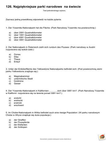 126. Najpiękniejsze parki narodowe na świecie Test jednokrotnego wyboru Zaznacz jedną prawidłową odpowiedź na każde pytanie. 1. Der Yosemite-Nationalpark hat die Fläche: (Park Narodowy Yosemite ma powierzchnię:) a) b) c) d) über 2081 Quadratkilometer über 1081 Quadratkilometer über 4081 Quadratkilometer über 3081 Quadratkilometer 2. Der Nationalpark in Österreich zieht sich rundum des Flusses: (Park narodowy w Austrii rozpościera się wokół rzeki:) a) b) c) d) Donau Elbe Thaya Erlauf 3. Unter der Erdoberfläche des Yellowstone Nationalparks befindet sich: (Pod powierzchnią ziemi parku Yellowstone znajduje się:) a) b) c) d) Magmakammer unterirdische Stadt Goldmine Geiser 4. Der Yosemite-Nationalpark in Kalifornien..............sich über 3081 km?. (Park Narodowy Yosemite w Kalifornii rozpościera się na terenie ponad 3081 km?.) a) b) c) d) ersticht erstreckt erstrickt erschwert 5. Im Chobe-Nationalpark in Afrika befindet auch eine riesige Population: (W parku narodowym Chobe w Afryce znajduje się duża populacja:) a) b) c) d) der Giraffen der Flusspferde der Elefanten der Antilopen Test pochodzi z zasobów edukacyjnych serwisu Szkolnictwo.pl 6. Die Sächsische Schweiz ist entstanden: (Szwajcaria Saksońska powstała:) a) b) c) d) in der Karbonzeit in der Jurazeit in der Triaszeit in der Kreidezeit 7. Nationalpark Gesäuse befindet sich: (Park narodowy Gesäuse znajduje się:) a) b) c) d) zwischen den Flüssen Enns und Salza zwischen den Flüssen Melk und Donau zwischen den Flüssen Elbe und Moldau zwischen den Flüssen Drau und Isel 8. Der Park ist eine Kombination von..........und Hügelland. (Park jest połączeniem doliny rzeki oraz pagórków.) a) b) c) d) Flussarm Flussbett Flusslauf Flusstal 9. Der Etosha-Nationalpark liegt: (Park narodowy Etosha leży:) a) b) c) d) am Rande des Aranos-Beckens am Rande des Kalahari-Beckens am Rande des Barotse-Beckens am Rande des Karoo-Beckens 10. Der Etosha stammt aus dem Oshivambo und bedeutet: (Nazwa Etosha pochodzi od Oshivambo i oznacza:) a) b) c) d) großer gelber Platz großer grüner Platz großer schwarzer Platz großer weißer Platz 11. Der einzige deutsche Nationalpark in den Alpen heißt: (Jedyny niemiecki park narodowy w Alpach nazywa się:) a) b) c) d) Berchtesgaden Edersee Hainich Jasmund 12. Acht Kilometer unter der.............. befindet sich eine riesige Magmakammer. (Osiem kilometrów poniżej powierzchni ziemi jest ogromna komora magmowa.) Test pochodzi z zasobów edukacyjnych serwisu Szkolnictwo.pl a) b) c) d) Erdbeben Erdteil Erdbeere Erdoberfläche 13. Der Grand Canyon National Park liegt: (Park Narodowy Grand Canyon leży:) a) b) c) d) in Alaska in Arizona in Florida in Texas 14. Der Nationalpark Stilfserjoch befindet sich: (Park narodowy Stilfserjoch znajduje się:) a) b) c) d) in Alpen in Karpaten in Apennin in Schwarzwald 15. Der Joshua-Tree-Nationalpark in Kalifornien ist: (Park narodowy Joshua-Tree w Kalifornii jest:) a) b) c) d) eine Waldlandschaft eine Steppenlandschaft eine Wüstenlandschaft eine Heidelandschaft 16. In der Kreidezeit war die Sächsische Schweiz von einem Meer.......... (W okresie kredy Szwajcaria Saksońska była pokryta morzem.) a) b) c) d) besucht bedeckt bedroht bedacht 17. Der Bayerische Wald wird genannt: (Las Bawarski jest nazywany:) a) b) c) d) der grüne Wald Europas die grüne Lunge Europas das grüne Dach Europas die grüne Insel Europas 18. Der Jasper-Nationalpark in Kanada wurde gegründet: (Park narodowy Jasper w Kanadzie został założony:) a) b) im Jahr 1900 im Jahr 1912 Test pochodzi z zasobów edukacyjnych serwisu Szkolnictwo.pl c) d) im Jahr 1920 im Jahr 1907 19. Der erste Park Nationalpark in Australien, der zum UNESCO Welterbe erklärt wurde heißt: (Pierwszy park narodowy w Australii, który został uznany za światowe dziedzictwo UNESCO nazywa się:) a) b) c) d) Mungo National Park Turon National Park Towarri National Park Mount-Royal National Park 20. Im Park befinden sich zahlreiche......... (W parku znajdują się liczne obszary leśne.) a) b) c) d) Waldbrände Waldränder Waldgebiete Waldwege Test pochodzi z zasobów edukacyjnych serwisu Szkolnictwo.pl