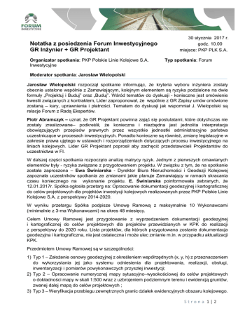 Notatka z posiedzenia Forum Inwestycyjnego GR Inżynier + GR Projektant Organizator spotkania: PKP Polskie Linie Kolejowe S.A. Inwestycyjne 30 stycznia 2017 r. godz. 10.00 miejsce: PKP PLK S.A. Typ spotkania: Forum Moderator spotkania: Jarosław Wielopolski Jarosław Wielopolski rozpoczął spotkanie informując, że kryteria wyboru inżyniera zostały obecnie ustalone wspólnie z Zamawiającym, kolejnym elementem są ryzyka podzielone na dwie formuły „Projektuj i Buduj” oraz „Buduj”. Wśród tematów do dyskusji - konieczne jest omówienie kwestii związanych z kontraktem, Lider zaproponował, że wspólnie z GR Zapisy umów omówione zostaną – kary, uprawnienia i płatności. Tematem do dyskusji jak wspomniał J. Wielopolski są relacje Forum z Radą Ekspertów. Piotr Abramczyk – uznał, że GR Projektant powinna zająć się postulatami, które dotychczas nie zostały zrealizowane– podkreślił, że konieczna i niezbędna jest jednolita interpretacja obowiązujących przepisów prawnych przez wszystkie jednostki administracyjne państwa uczestniczące w procesach inwestycyjnych. Ponadto konieczne są również, zmiany legislacyjne w zakresie prawa ujętego w ustawach i rozporządzeniach dotyczących procesu inwestycyjnego na liniach kolejowych. Lider GR Projektant poprosił aby zachęcić przedstawicieli Projektantów do uczestnictwa w FI. W dalszej części spotkania rozpoczęto analizę matrycy ryzyk. Jednym z pierwszych omawianych elementów były - ryzyka związane z przygotowaniem projektu. W związku z tym, że na spotkanie została zaproszona – Ewa Świniarska - Dyrektor Biura Nieruchomości i Geodezji Kolejowej zapoznała uczestników spotkania ze zmianami jakie planuje Zamawiający w ramach skracania czasu koniecznego na wykonanie projektu. E. Świniarska poinformowała zebranych, że 12.01.2017r. Spółka ogłosiła przetarg na: Opracowanie dokumentacji geodezyjnej i kartograficznej do celów projektowych dla projektów inwestycji kolejowych realizowanych przez PKP Polskie Linie Kolejowe S.A. z perspektywy 2014-2020. W wyniku przetargu Spółka podpisze Umowę Ramową z maksymalnie 10 Wykonawcami (minimalnie z 3-ma Wykonawcami) na okres 48 miesięcy. Celem Umowy Ramowej jest przygotowanie z wyprzedzeniem dokumentacji geodezyjnej i kartograficznej do celów projektowych dla projektów przewidzianych w KPK do realizacji z perspektywy do 2020 roku. Lista projektów, dla których przygotowana zostanie dokumentacja geodezyjna i kartograficzna, nie jest ostateczna i może ulec zmianie m.in. w przypadku aktualizacji KPK. Przedmiotem Umowy Ramowej są w szczególności: 1) Typ 1 – Założenie osnowy geodezyjnej z określeniem współrzędnych (x, y, h) z przeznaczeniem do wykorzystania jej jako systemu odniesienia dla projektowania, realizacji, obsługi, inwentaryzacji i pomiarów powykonawczych przyszłej inwestycji; 2) Typ 2 – Opracowanie numerycznej mapy sytuacyjno–wysokościowej do celów projektowych o dokładności mapy w skali 1:500 wraz z uzbrojeniem podziemnym terenu i ewidencją gruntów, zwanej dalej mapą do celów projektowych ; 3) Typ 3 – Weryfikacja przebiegu zewnętrznych granic działek ewidencyjnych obszaru kolejowego. Strona 1|2 Dodatkowo Wykonawca w ramach realizacji zamówienia na żądanie Zamawiającego dokona jednorazowej aktualizacji mapy do celów projektowych w okresie 2 lat (lub zgodnie z ofertą) od zakończenia wykonania (oklauzulowania) map (okres 2 lat zawiera się w okresie trwania Umowy Ramowej) i sprawdzenia stanu osnowy geodezyjnej. W ramach umowy ramowej będą zawierane każdorazowo umowy wykonawcze na podstawie zamówień cząstkowych. Konieczność zlecenia zamówienia cząstkowego będzie każdorazowo potwierdzana przez Dyrektora Projektu/Zespół projektowy w PLK, dla którego zlecane będzie opracowanie dokumentacji geodezyjnej i kartograficznej dla celów projektowych. Dyrektor Projektu/Zespół projektowy w celu otrzymania refundacji ujmie wykonanie map do celów projektowych w Harmonogramie nakładów projektu inwestycyjnego poprzez wydzielenie odpowiedniej pozycji. W celu sprawnego opracowania przedmiotowej dokumentacji należy podjąć współpracę, między IGK a z komórkami nadzorującymi inwestycje i przetargi w PLK, w celu uniknięcia trudność skorelowania wykonania map do celów projektowych z terminem rozpoczęcia prac projektowych. Zlecenie opracowania dokumentacji geodezyjnej i kartograficznej jest możliwe dla projektów, których postępowania przetargowe nie zostały jeszcze rozpoczęte (usługi nie mogą zostać zlecone dla projektów w toku). Przewidywany termin rozpoczęcia zlecania usług w ramach Umowy Ramowej to trzeci kwartał 2017r. Na zakończenie – Cezary Saganowski – przedstawił jak wyglądają prace Rady Ekspertów ds. działań mających na celu optymalizację procesu realizacji inwestycji drogowych. Ustalenia ze spotkania: 1. Ryzyka etapu projektowania zostały omówione i wprowadzone do tabeli, która stanowi załącznik do notatki. 2. Uczestnicy FI zaproponują jak należy podzielić ryzyka dotyczące zasobów – przed kolejnym spotkaniem propozycje zostaną przekazane na adres [email protected] 3. Tematem kolejnego spotkania będzie również praca nad matrycą ryzyk jakie mogą wystąpić. Omawiany materiał zostanie jak poprzednio przeanalizowany w mniejszej grupie (do której zgłosili się M. Gładyga, Jarosław Wielopolski, K. Wiśniewski; P. Abramczyk; R. Radziszewski) oraz zostanie przedstawiony na kolejnym spotkaniu. Ryzyka zostaną podzielone pomiędzy Zamawiającego, Wykonawcę (w tym Projektanta) i Inżyniera z uwzględnieniem również podziału na system „Projektuj i Buduj” oraz „Buduj” Kolejne spotkanie ustalono na 27 lutego b.r. na godz. 10.00 z uwagi na tematykę, odbędzie się ono również w połączeniu GR Inżynier oraz GR Projektant. Na tym notatkę zakończono Strona 2|2