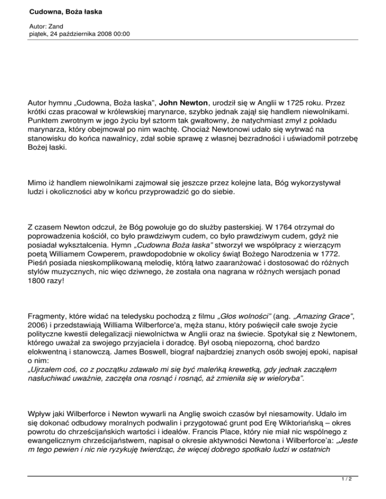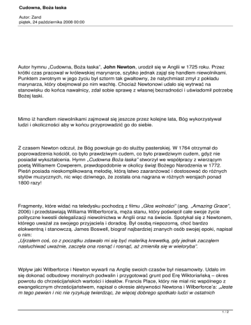 Cudowna, Boża łaska Autor: Zand piątek, 24 października 2008 00:00 Autor hymnu „Cudowna, Boża łaska”, John Newton, urodził się w Anglii w 1725 roku. Przez krótki czas pracował w królewskiej marynarce, szybko jednak zajął się handlem niewolnikami. Punktem zwrotnym w jego życiu był sztorm tak gwałtowny, że natychmiast zmył z pokładu marynarza, który obejmował po nim wachtę. Chociaż Newtonowi udało się wytrwać na stanowisku do końca nawałnicy, zdał sobie sprawę z własnej bezradności i uświadomił potrzebę Bożej łaski. Mimo iż handlem niewolnikami zajmował się jeszcze przez kolejne lata, Bóg wykorzystywał ludzi i okoliczności aby w końcu przyprowadzić go do siebie. Z czasem Newton odczuł, że Bóg powołuje go do służby pasterskiej. W 1764 otrzymał do poprowadzenia kościół, co było prawdziwym cudem, co było prawdziwym cudem, gdyż nie posiadał wykształcenia. Hymn „Cudowna Boża łaska” stworzył we współpracy z wierzącym poetą Williamem Cowperem, prawdopodobnie w okolicy świąt Bożego Narodzenia w 1772. Pieśń posiada nieskomplikowaną melodię, którą łatwo zaaranżować i dostosować do różnych stylów muzycznych, nic więc dziwnego, że została ona nagrana w różnych wersjach ponad 1800 razy! Fragmenty, które widać na teledysku pochodzą z filmu „Głos wolności” (ang. „Amazing Grace”, 2006) i przedstawiają Williama Wilberforce'a, męża stanu, który poświęcił całe swoje życie polityczne kwestii delegalizacji niewolnictwa w Anglii oraz na świecie. Spotykał się z Newtonem, którego uważał za swojego przyjaciela i doradcę. Był osobą niepozorną, choć bardzo elokwentną i stanowczą. James Boswell, biograf najbardziej znanych osób swojej epoki, napisał o nim: „Ujrzałem coś, co z początku zdawało mi się być maleńką krewetką, gdy jednak zacząłem nasłuchiwać uważnie, zaczęła ona rosnąć i rosnąć, aż zmieniła się w wieloryba”. Wpływ jaki Wilberforce i Newton wywarli na Anglię swoich czasów był niesamowity. Udało im się dokonać odbudowy moralnych podwalin i przygotować grunt pod Erę Wiktoriańską – okres powrotu do chrześcijańskich wartości i ideałów. Francis Place, który nie miał nic wspólnego z ewangelicznym chrześcijaństwem, napisał o okresie aktywności Newtona i Wilberforce’a: „Jeste m tego pewien i nic nie ryzykuję twierdząc, że więcej dobrego spotkało ludzi w ostatnich 1/2 Cudowna, Boża łaska Autor: Zand piątek, 24 października 2008 00:00 trzydziestu latach niż w ciągu ostatnich trzystu. W okresie tym stali się oni mądrzejsi, lepsi, skromniejsi, uczciwsi, mężniejsi i godni szacunku jak nigdy przedtem”. . Na pomniku Wilberforce'a ufundowanym w 1840 w Opactwie Westminsterskim znajduje się długie epitafium, którego zakończenie brzmi następująco: „Nie zmarł niezauważony ani zapomniany przez swój kraj: parlamentarzyści Anglii, wraz z Lordem Kanclerzem i Marszałkiem Parlamentu, przenieśli jego ciało w uroczystej procesji, by znalazło spoczynek wśród innych wielkich zmarłych i złożyli je tutaj do dnia, gdy z łaski Jezusa Chrystusa, swego jedynego Odkupiciela i Zbawcy (któremu poświęcił całe życie i którego tak bardzo starał się wywyższyć w swoich pismach), powstanie na nowo, w dniu zmartwychwstania sprawiedliwych”. opr. Andrzej Zychla 2/2