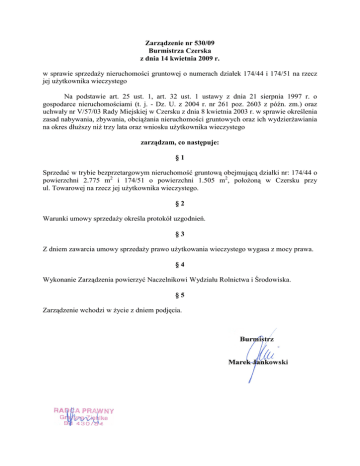 Zarządzenie nr 530/09 Burmistrza Czerska z dnia 14 kwietnia 2009 r. w sprawie sprzedaŜy nieruchomości gruntowej o numerach działek 174/44 i 174/51 na rzecz jej uŜytkownika wieczystego Na podstawie art. 25 ust. 1, art. 32 ust. 1 ustawy z dnia 21 sierpnia 1997 r. o gospodarce nieruchomościami (t. j. - Dz. U. z 2004 r. nr 261 poz. 2603 z późn. zm.) oraz uchwały nr V/57/03 Rady Miejskiej w Czersku z dnia 8 kwietnia 2003 r. w sprawie określenia zasad nabywania, zbywania, obciąŜania nieruchomości gruntowych oraz ich wydzierŜawiania na okres dłuŜszy niŜ trzy lata oraz wniosku uŜytkownika wieczystego zarządzam, co następuje: §1 Sprzedać w trybie bezprzetargowym nieruchomość gruntową obejmującą działki nr: 174/44 o powierzchni 2.775 m2 i 174/51 o powierzchni 1.505 m2, połoŜoną w Czersku przy ul. Towarowej na rzecz jej uŜytkownika wieczystego. §2 Warunki umowy sprzedaŜy określa protokół uzgodnień. §3 Z dniem zawarcia umowy sprzedaŜy prawo uŜytkowania wieczystego wygasa z mocy prawa. §4 Wykonanie Zarządzenia powierzyć Naczelnikowi Wydziału Rolnictwa i Środowiska. §5 Zarządzenie wchodzi w Ŝycie z dniem podjęcia.