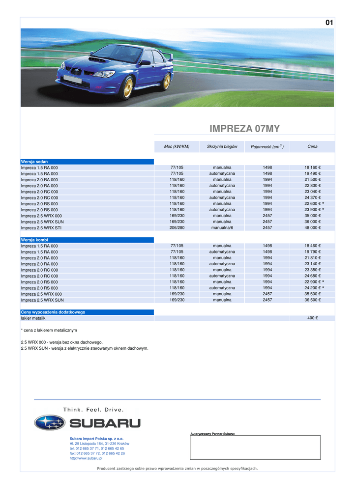 01 IMPREZA 07MY Moc (kW/KM) Skrzynia biegów Pojemność (cm 3 ) Cena Wersja sedan Impreza 1.5 RA 000 Impreza 1.5 RA 000 Impreza 2.0 RA 000 Impreza 2.0 RA 000 Impreza 2.0 RC 000 Impreza 2.0 RC 000 Impreza 2.0 RS 000 Impreza 2.0 RS 000 Impreza 2.5 WRX 000 Impreza 2.5 WRX SUN Impreza 2.5 WRX STI 77/105 77/105 118/160 118/160 118/160 118/160 118/160 118/160 169/230 169/230 206/280 manualna automatyczna manualna automatyczna manualna automatyczna manualna automatyczna manualna manualna manualna/6 1498 1498 1994 1994 1994 1994 1994 1994 2457 2457 2457 18 160 € 19 490 € 21 500 € 22 830 € 23 040 € 24 370 € 22 600 € 23 900 € 35 000 € 36 000 € 48 000 € Wersja kombi Impreza 1.5 RA 000 Impreza 1.5 RA 000 Impreza 2.0 RA 000 Impreza 2.0 RA 000 Impreza 2.0 RC 000 Impreza 2.0 RC 000 Impreza 2.0 RS 000 Impreza 2.0 RS 000 Impreza 2.5 WRX 000 Impreza 2.5 WRX SUN 77/105 77/105 118/160 118/160 118/160 118/160 118/160 118/160 169/230 169/230 manualna automatyczna manualna automatyczna manualna automatyczna manualna automatyczna manualna manualna 1498 1498 1994 1994 1994 1994 1994 1994 2457 2457 18 460 € 19 790 € 21 810 € 23 140 € 23 350 € 24 680 € 22 900 € 24 200 € 35 500 € 36 500 € Ceny wyposażenia dodatkowego lakier metalik 400 € * cena z lakierem metalicznym 2.5 WRX 000 - wersja bez okna dachowego. 2.5 WRX SUN - wersja z elektrycznie sterowanym oknem dachowym. Autoryzowany Partner Subaru: Subaru Import Polska sp. z o.o. Al. 29 Listopada 184, 31-236 Kraków tel. 012 665 37 71, 012 665 42 65 fax: 012 665 37 72, 012 665 42 26 http://www.subaru.pl Producent zastrzega sobie prawo wprowadzenia zmian w poszczególnych specyfikacjach. * * * * 02 Impreza (sedan) 1.5 RA manual 1.5 RA automat 2.0 R manual 2.0 R automat 2.5 WRX manual 2.5 WRX STI manual Wyposażenie wnętrza skórzana tapicerka (częściowo) elektrycznie sterowane szyby wszystkich drzwi elektrycznie sterowane okno dachowe kierownica obszyta skórą sportowa kierownica aluminiowe nakładki na pedały dźwignia zmiany biegów obszyta skórą dźwignia hamulca ręcznego obszyta skórą automatyczna klimatyzacja fotele kubełkowe z przodu fotel kierowcy z regulacją wysokości podgrzewane fotele przednie schowek na konsoli środkowej osłona przeciwsłoneczna z lusterkiem uchwyty na napoje termometr zewnętrzny oświetlenie kabiny z wyłącznikiem czasowym oświetlenie bagażnika lampki do czytania z przodu oparcie tylnego siedzenia dzielone i składane tunel na narty w oparciu tylnego siedzenia roleta bagażnika radio z CD (1 DIN) radio CD z odtwarzaczem kaset (2 DIN) kierownica z regulacją wysokości Wyposażenie zewnętrzne aluminiowa pokrywa silnika reflektory ksenonowe przednie reflektory przeciwmgielne szyby atermiczne antena w szybie tylnej elektrycznie regulowane i podgrzewane lusterka zewnętrzne regulowana prędkość wycieraczek szyby przedniej regulowana prędkość wycieraczki szyby tylnej zdalnie sterowany centralny zamek spojler tylny spojler dachowy relingi dachowe lusterka zewnętrzne w kolorze nadwozia Technika / bezpieczeństwo stały napęd wszystkich kół S-AWD 4-kanałowy ABS sportowy ABS reduktor skrzyni Dual-Range hamulec górski Hill-Holder mechanizm różnicowy osi przedniej o ograniczonym poślizgu aktywny centralny dyferencjał (DCCD) mechanizm różnicowy osi tylnej o ograniczonym poślizgu sportowe zawieszenie felgi aluminiowe 5,5x15" felgi aluminiowe 6,5x16" felgi aluminiowe 7x17" felgi aluminiowe 8x17" poduszki powietrzne kierowcy i pasażera boczne poduszki powietrzne aktywne zagłówki z przodu wzmocnienia boczne nadwozia przednie hamulce tarczowe wentylowane hamulce tarczowe Brembo hamulce tarczowe tył hamulce tarczowe tył - wentylowane system montażu fotelików dziecięcych ISOFIX pasy bezpieczeństwa z regulacją wysokości (przód) trzypunktowe pasy bezpieczeństwa immobilizer wyposażenie seryjne wchodzi w skład pakietu Comfort 03 Impreza (kombi) 1.5 RA manual 1.5 RA automat 2.0 R manual 2.0 R automat 2.5 WRX manual Wyposażenie wnętrza skórzana tapicerka (częściowo) elektrycznie sterowane szyby wszystkich drzwi elektrycznie sterowane okno dachowe kierownica obszyta skórą sportowa kierownica aluminiowe nakładki na pedały dźwignia zmiany biegów obszyta skórą dźwignia hamulca ręcznego obszyta skórą automatyczna klimatyzacja fotele kubełkowe z przodu fotel kierowcy z regulacją wysokości podgrzewane fotele przednie schowek na konsoli środkowej osłona przeciwsłoneczna z lusterkiem uchwyty na napoje termometr zewnętrzny oświetlenie kabiny z wyłącznikiem czasowym oświetlenie bagażnika lampki do czytania z przodu oparcie tylnego siedzenia dzielone i składane tunel na narty w oparciu tylnego siedzenia roleta bagażnika radio z CD (1 DIN) radio CD z odtwarzaczem kaset (2 DIN) kierownica z regulacją wysokości klapa bagażnika otwierana pilotem Wyposażenie zewnętrzne aluminiowa pokrywa silnika reflektory ksenonowe przednie reflektory przeciwmgielne szyby atermiczne antena w szybie tylnej elektrycznie regulowane i podgrzewane lusterka zewnętrzne regulowana prędkość wycieraczek szyby przedniej regulowana prędkość wycieraczki szyby tylnej zdalnie sterowany centralny zamek spojler tylny spojler dachowy relingi dachowe lusterka zewnętrzne w kolorze nadwozia Technika / bezpieczeństwo stały napęd wszystkich kół S-AWD 4-kanałowy ABS sportowy ABS reduktor skrzyni Dual-Range hamulec górski Hill-Holder mechanizm różnicowy osi przedniej o ograniczonym poślizgu aktywny centralny dyferencjał (DCCD) mechanizm różnicowy osi tylnej o ograniczonym poślizgu sportowe zawieszenie felgi aluminiowe 5,5x15 felgi aluminiowe 6,5x16" felgi aluminiowe 7x17" felgi aluminiowe 8x17" poduszki powietrzne kierowcy i pasażera boczne poduszki powietrzne aktywne zagłówki z przodu wzmocnienia boczne nadwozia przednie hamulce tarczowe wentylowane hamulce tarczowe Brembo hamulce tarczowe tył hamulce tarczowe tył - wentylowane system montażu fotelików dziec