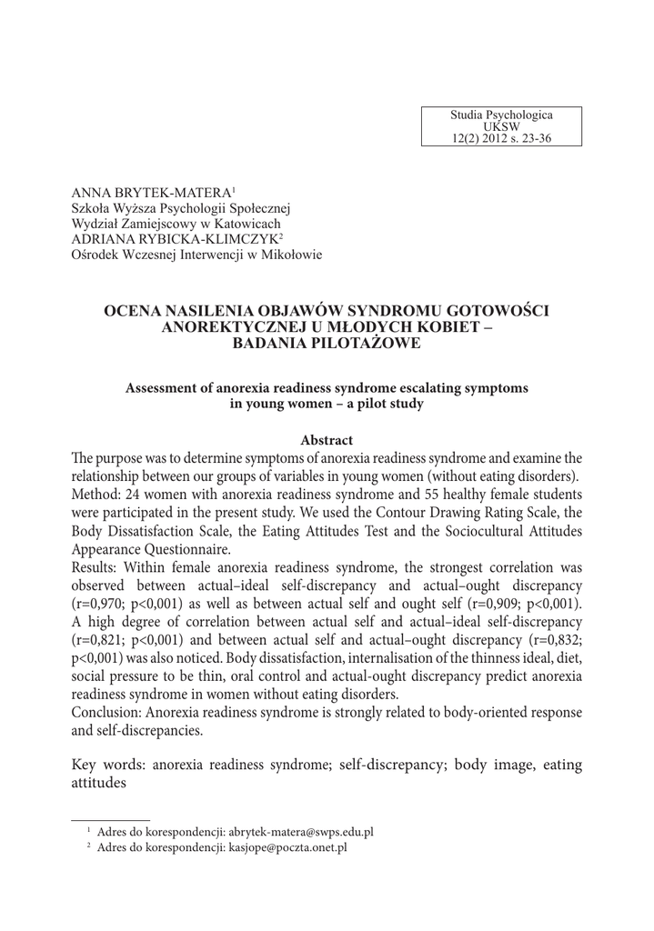 Studia Psychologica UKSW 12(2) 2012 s. 23-36 ANNA BRYTEK-MATERA1 Szkoła Wyższa Psychologii Społecznej Wydział Zamiejscowy w Katowicach ADRIANA RYBICKA-KLIMCZYK2 Ośrodek Wczesnej Interwencji w Mikołowie OCENA NASILENIA OBJAWÓW SYNDROMU GOTOWOŚCI ANOREKTYCZNEJ U MŁODYCH KOBIET – BADANIA PILOTAŻOWE Assessment of anorexia readiness syndrome escalating symptoms in young women – a pilot study Abstract The purpose was to determine symptoms of anorexia readiness syndrome and examine the relationship between our groups of variables in young women (without eating disorders). Method: 24 women with anorexia readiness syndrome and 55 healthy female students were participated in the present study. We used the Contour Drawing Rating Scale, the Body Dissatisfaction Scale, the Eating Attitudes Test and the Sociocultural Attitudes Appearance Questionnaire. Results: Within female anorexia readiness syndrome, the strongest correlation was observed between actual–ideal self-discrepancy and actual–ought discrepancy (r=0,970; p<0,001) as well as between actual self and ought self (r=0,909; p<0,001). A high degree of correlation between actual self and actual–ideal self-discrepancy (r=0,821; p<0,001) and between actual self and actual–ought discrepancy (r=0,832; p<0,001) was also noticed. Body dissatisfaction, internalisation of the thinness ideal, diet, social pressure to be thin, oral control and actual-ought discrepancy predict anorexia readiness syndrome in women without eating disorders. Conclusion: Anorexia readiness syndrome is strongly related to body-oriented response and self-discrepancies. Key words: anorexia readiness syndrome; self-discrepancy; body image, eating attitudes 1 2 Adres do korespondencji: [email protected] Adres do korespondencji: [email protected] 24 ANNA BRYTEK-MATERA, ADRIANA RYBICKA-KLIMCZYK [2] 1. WPROWADZENIE Pojęcie syndromu gotowości anorektycznej (SGA)3 wprowadziła do nomenklatury psychologicznej Beata Ziółkowska (2001). Zdefiniowała zjawisko jako uwarunkowany psychologicznie, społecznie i kulturowo zespół objawów, które mogą wskazywać na nieprawidłowości w zakresie realizowania potrzeby pokarmowej oraz stosunku do własnego ciała. Zdaniem autorki (Ziółkowska, 2001) syndrom gotowości anorektycznej ujawnia się w zakresie tak zwanych zachowań anorektycznych, do których zalicza się: zainteresowanie pokarmami (znajomość wartości kalorycznych produktów pokarmowych, liczenie kalorii spożywanych posiłków), rosnącą okresowo aktywność ruchową, nadmierną dbałość o wygląd i zaabsorbowanie własnym ciałem (porównywanie się z ideałami kobiecej urody), tendencje do kontrolowania masy i wymiarów ciała (czemu towarzyszyć może emocjonalne napięcie), skłonność do przeceniania rozmiarów własnego ciała oraz jego masy, skłonność do rywalizacji, potrzebę perfekcjonizmu, brak odporności na wpływy kultury masowej oraz labilność emocjonalną uwarunkowaną stosunkiem do jedzenia i własnego ciała (ibidem). Jak podkreśla Ziółkowska (2001), decydujące znaczenie dla ujawniania się niewłaściwego stosunku do jedzenia i swojego ciała mają: kontakty z rodzicami, postawy rodzicielskie, styl życia i wychowania preferowany w rodzinie oraz relacje w niej panujące (dotyczące m.in. nawyków żywieniowych, stosunku do jedzenia, ciała i atrakcyjności fizycznej kreowanego przez rodziny osób chorych, wzbudzana i utrwalana przez opiekunów w dzieciach potrzeba współzawodnictwa). Nie ulega zatem wątpliwości, że czynnik rodzinny odgrywa istotną rolę w kształtowaniu się zaburzeń żywieniowych. Wśród głównych czynników prowokujących powstawanie syndromu gotowości anorektycznej Ziółkowska (ibidem) wymienia: nieprawidłowe relacje w rodzinie – zaburzenia dystansu pomiędzy rodzicami i dzieckiem, zaburzenia percepcji własnego ciała oraz deficyt konstruktywnych strategii radzenia sobie ze stresem (czynnik podmiotowy), a także okres adolescencji, dominujące wzorce kulturowe (czynniki środowiskowe) oraz aktualnie trudną dla danej osoby sytuację. Obecnie rozpowszechnienie zaburzeń odżywiania w ciągu życia (lifetime prevalence) wynosi około 5% (Treasure, Claudino, Zucker, 2010). Nieprawidłowe nawyki żywieniowe, skrajne restrykcje dietetyczne, zachowania koncentrujące się na kontroli masy ciała, nadmierne objadanie się, przeszacowywanie rozmiarów i kształtu ciała, czy przecenianie poglądów na temat wyglądu zewnętrznego, mogą występować w jadłowstręcie psychicznym, bulimii psychicznej czy atypowych zaburzeniach odżywiania (terminologia używana w Europie) / zaburzeniach jedzenia 3 Nieszablonowość psychologicznego pojęcia syndromu gotowości anorektycznej może budzić kontrowersje w środowisku medycznym. Termin ten należy rozpatrywać w kontekście oceny prawdopodobieństwa wystąpienia jadłowstrętu psychicznego, a nie w kontekście przekonania o nieuchronności wystąpienia zaburzenia. Jak podkreśla Beata Ziółkowska (2001) syndrom gotowości anorektycznej „akcentuje skłonność (…) do (…)” (Ziółkowska, 2001, s. 89). Pojęcie to pojawia się głównie w odniesieniu do działań o charakterze prewencyjnym/profilaktycznym, zapobiegającym eskalacji symptomów i wystąpieniu pełnoobjawowego jadłowstrętu psychicznego. [3] OCENA NASILENIA OBJAWÓW SYNDROMU GOTOWOŚCI ANOREKTYCZNEJ 25 inaczej nie określonych (terminologia używana w Stanach Zjednoczonych) (Fairburn, Harrisom, 2003; Treasure i wsp., 2010) Jak podkreśla Beata Ziółkowska (2001) syndrom gotowości anorektycznej nie jest tożsamy z atypowymi zaburzeniami jedzenia. „Niespecyficzne zaburzenia jedzenia obejmują wiele postaci nieprawidłowości w zakresie realizowanie potrzeby pokarmowej, nie różnicując ich z uwagi na zespół symptomów i etiologią. Syndrom gotowości anorektycznej z kolei akcentuje skłonność dojrzewających dziewcząt do reagowania głodówkami, których inicjacja powodowana 