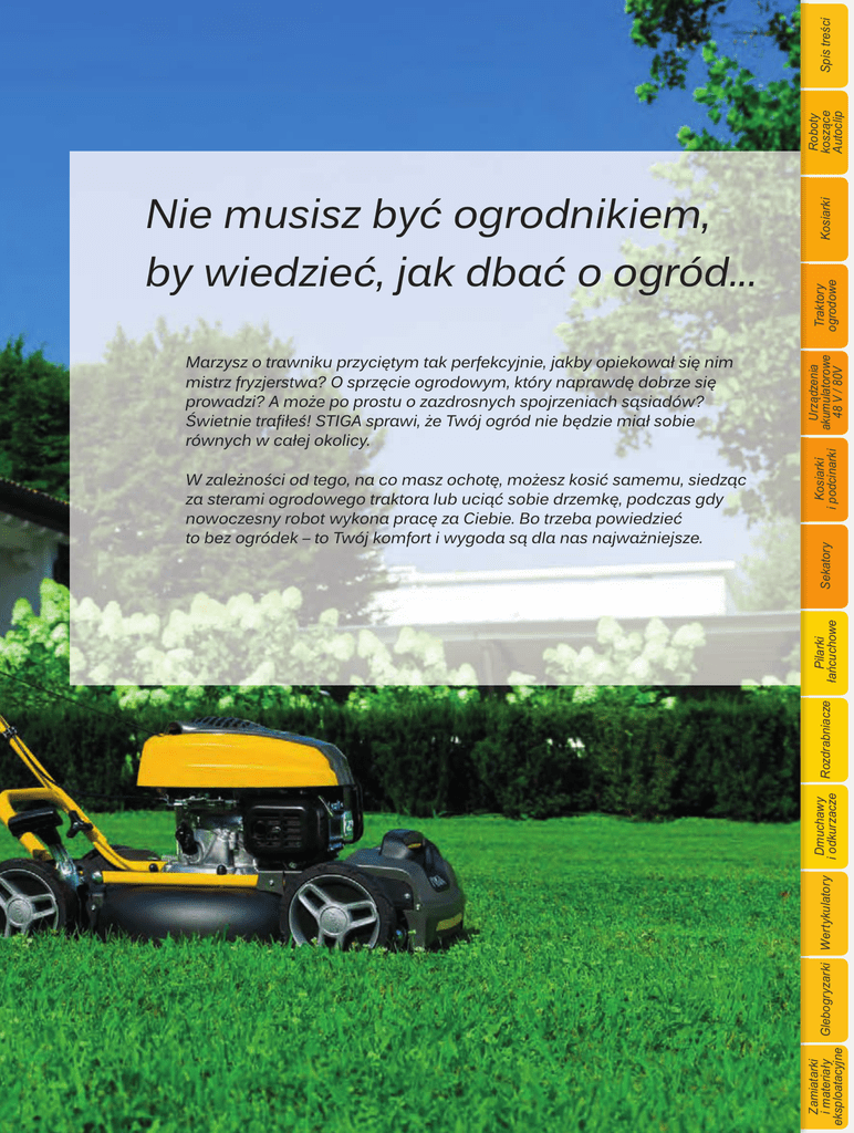 Spis treści Urządzenia akumulatorowe 48 V / 80V Traktory ogrodowe Kosiarki Roboty koszące Autoclip �ade �or you Zamiatarki i materiały Glebogryzarki Wertykulatory eksploatacyjne Dmuchawy i odkurzacze Rozdrabniacze Pilarki łańcuchowe � zale�no�ci od tego, na co masz ochotę, mo�esz kosić samemu, siedząc za sterami ogrodowego traktora lub uciąć sobie drzemkę, podczas gdy nowoczesny robot wykona pracę za �iebie. �o trzeba powiedzieć to bez ogródek � to �wój kom�ort i wygoda są dla nas najwa�niejsze. Kosiarki i podcinarki �arzysz o trawniku przyciętym tak per�ekcyjnie, jakby opiekował się nim mistrz �ryzjerstwa� � sprzęcie ogrodowym, który naprawdę dobrze się prowadzi� � mo�e po prostu o zazdrosnych spojrzeniach sąsiadów� �wietnie tra�łe�� ����� sprawi, �e �wój ogród nie będzie miał sobie równych w całej okolicy. Sekatory Nie musisz być ogrodnikiem, by wiedzieć, jak dbać o ogród...
