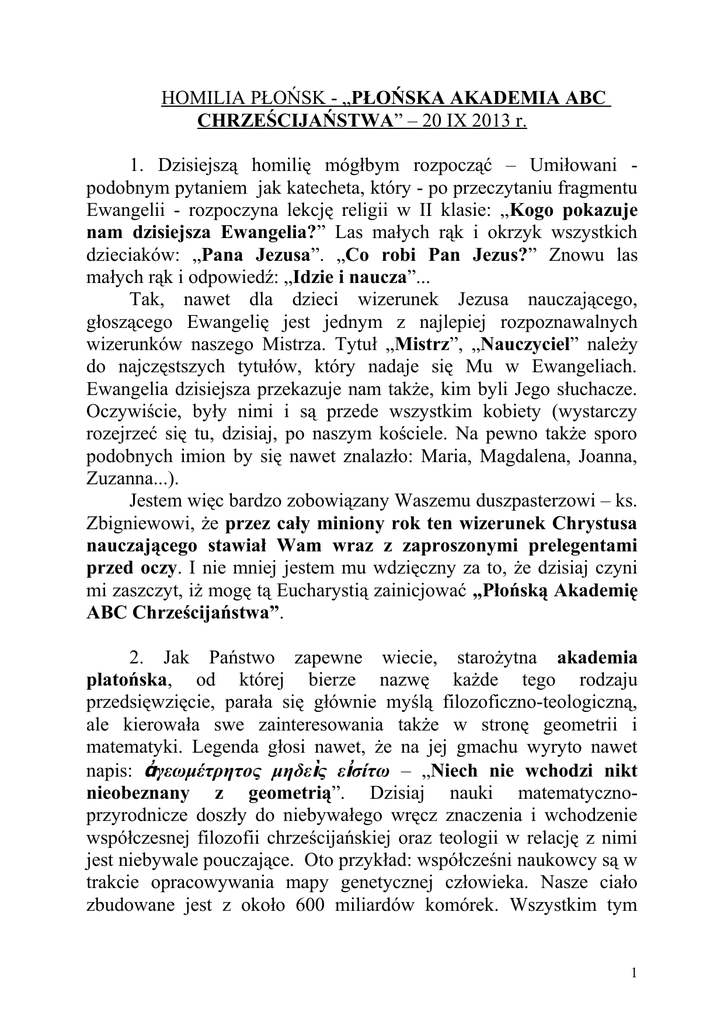 HOMILIA PŁOŃSK - „PŁOŃSKA AKADEMIA ABC CHRZEŚCIJAŃSTWA” – 20 IX 2013 r. 1. Dzisiejszą homilię mógłbym rozpocząć – Umiłowani podobnym pytaniem jak katecheta, który - po przeczytaniu fragmentu Ewangelii - rozpoczyna lekcję religii w II klasie: „Kogo pokazuje nam dzisiejsza Ewangelia?” Las małych rąk i okrzyk wszystkich dzieciaków: „Pana Jezusa”. „Co robi Pan Jezus?” Znowu las małych rąk i odpowiedź: „Idzie i naucza”... Tak, nawet dla dzieci wizerunek Jezusa nauczającego, głoszącego Ewangelię jest jednym z najlepiej rozpoznawalnych wizerunków naszego Mistrza. Tytuł „Mistrz”, „Nauczyciel” należy do najczęstszych tytułów, który nadaje się Mu w Ewangeliach. Ewangelia dzisiejsza przekazuje nam także, kim byli Jego słuchacze. Oczywiście, były nimi i są przede wszystkim kobiety (wystarczy rozejrzeć się tu, dzisiaj, po naszym kościele. Na pewno także sporo podobnych imion by się nawet znalazło: Maria, Magdalena, Joanna, Zuzanna...). Jestem więc bardzo zobowiązany Waszemu duszpasterzowi – ks. Zbigniewowi, że przez cały miniony rok ten wizerunek Chrystusa nauczającego stawiał Wam wraz z zaproszonymi prelegentami przed oczy. I nie mniej jestem mu wdzięczny za to, że dzisiaj czyni mi zaszczyt, iż mogę tą Eucharystią zainicjować „Płońską Akademię ABC Chrześcijaństwa”. 2. Jak Państwo zapewne wiecie, starożytna akademia platońska, od której bierze nazwę każde tego rodzaju przedsięwzięcie, parała się głównie myślą filozoficzno-teologiczną, ale kierowała swe zainteresowania także w stronę geometrii i matematyki. Legenda głosi nawet, że na jej gmachu wyryto nawet napis: ἀγεωμέτρητος μηδεὶς εἰσίτω – „Niech nie wchodzi nikt nieobeznany z geometrią”. Dzisiaj nauki matematycznoprzyrodnicze doszły do niebywałego wręcz znaczenia i wchodzenie współczesnej filozofii chrześcijańskiej oraz teologii w relację z nimi jest niebywale pouczające. Oto przykład: współcześni naukowcy są w trakcie opracowywania mapy genetycznej człowieka. Nasze ciało zbudowane jest z około 600 miliardów komórek. Wszystkim tym 1 zarządzają geny, rodzaj informacji ukrytej w DNA każdej komórki. DNA zawarte w jądrze takiej komórki, czyli ludzki genom, składa się z ponad 3 miliardów biochemicznych „liter”. Początkiem projektu rozszyfrowania ludzkiego genomu była podjęta w 1990 roku przez Departament Energii oraz Narodowy Instytut Zdrowia USA decyzja o przydzieleniu na ten cel kilku miliardów dolarów. Do projektu włączyło się wiele innych krajów, przede wszystkim Wielka Brytania. Czy ten język jest nierozumny, nieczytelny; czy odczytywanie genomu jest błąkaniem się po pustyni, gdzie poza słońcem nie ma żadnego punktu odniesienia. Nie, to jest porywająco inteligentny język, niezwykle uporządkowana mapa... W roku 2000, gdy opublikowano wstępny opis genomu człowieka, Bill Clinton i Tony Blair na wspólnej konferencji prasowej nie mówili w sposób skomplikowany. Stwierdzili wprost: „Bez wątpienia, jest to najważniejsza, najbardziej cudowna mapa, którą rodzajowi ludzkiemu udało się stworzyć [...]. Uczymy się dziś języka, poprzez który Bóg stworzył świat. Zostajemy przeniknięci głębszym niż kiedykolwiek podziwem wobec złożoności, piękna, i niezwykłości najświętszego daru Bożego”. Jeszcze wyraziściej opisał to Jan Paweł II: „Genom ludzki jest jak gdyby ostatnim odkrywanym kontynentem. W kończącym się tysiącleciu, obfitującym w dramaty i podboje, ludzie poznali się lepiej i w pewien sposób zbliżyli do siebie nawzajem dzięki odkryciom i badaniom geograficznym. Ludzka wiedza poczyniła też poważne postępy w dziedzinie fizyki, które doprowadziły ostatnio do odkrycia struktury części składowych atomu. Dzisiaj uczeni dzięki zdobyczom genetyki i biologii molekularnej poznają najgłębsze struktury życia oraz mechanizmy, które kształtują indywidualne cechy jednostek, gwarantując trwałość żyjących gatunków. Te zdobycze ujawniają coraz pełniej wielkość Stwórcy, ponieważ dzięki nim człowiek może poznać ukryty ład stworzenia i zachwycić się niezwykłymi właściwościami swojego ciała, a także rozumu, dostrzegając w nim jakby odblask Słowa, przez które «wszystko […] się stało» (J 1,3)”. 3. Chociaż Prezydent Clinton, premier Blair i Jan Paweł II nie wahali się mówić o najciekawszej mapie świata, o wniknięciu w 2 najświętsze tajemnice Boga, zastanawiające jest, że Francis Collins, dyrektor amerykańskiego Narodowego Instytutu Badań Ludzkiego Genomu, długie lata był lekarzem ateistą. Fascynował go ten fenomen, ale dopiero świadectwo życia jednego z jego umierających pacjentów sprawiło, że jakby skonkretyzowały się w nim prawdziwe pytania o wiarę. Zwrócił się z nimi do miejscowego duchownego. Ten wręczył mu książkę słynnego angielskiego apologety Lewisa „Chrześcijaństwo po prostu”. Dwa lata później Collins w czasie górskiej wspinaczki, stojąc przed zamarzniętym wodospadem, uwierzył. Niedługo później oddał swoje życie Jezusowi... 4. Żeby uwierzyć, nie wystarczą więc same tylko argumenty naukowe, chociaż wiele takich argumentów istnieje i w ramach tegorocznych wykładów będziecie się nimi zajmować. Argumenty mogą wpuścić w mój świat nieco światła, mogą podprowadzić do drzwi wiary... Żeby jednak uwierzyć, wierzyć, muszę się nawrócić, nawracać. I nie jest to wcale łatwa operacja, jak widzicie to czasem po swoich mężach czy dorastających dzieciach - nawracanie się nie jest łatwe dlatego, że człowiek ciąży do tego, co widzialne, co zmysłowe, co można wziąć w rękę (często: co można wziąć pod rękę), po co można sięgnąć jak po swoją własność. Żeby się nawrócić, trzeba się też od czegoś odwrócić, aby dojrzeć, jak traci się to, co istotne, gdy idzie się za samym tylko