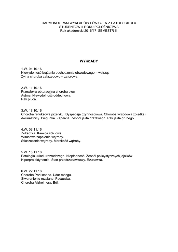 HARMONOGRAM WYKŁADÓW I ĆWICZEŃ Z PATOLOGII DLA STUDENTÓW II ROKU POŁOŻNICTWA Rok akademicki 2016/17 SEMESTR III WYKŁADY 1.W. 04.10.16 Niewydolność krążenia pochodzenia obwodowego – wstrząs Żylna choroba zakrzepowo – zatorowa. 2.W. 11.10.16 Przewlekła obturacyjna choroba płuc. Astma. Niewydolność oddechowa. Rak płuca. 3.W. 18.10.16 Choroba refluksowa przełyku. Dyspepsja czynnościowa. Choroba wrzodowa żołądka i dwunastnicy. Biegunka. Zaparcie. Zespół jelita drażliwego. Rak jelita grubego. 4.W. 08.11.16 Żółtaczka. Kamica żółciowa. Wirusowe zapalenie wątroby. Stłuszczenie wątroby. Marskość wątroby. 5.W. 15.11.16 Patologia układu rozrodczego. Niepłodność. Zespół policystycznych jajników. Hiperprolaktynemia. Stan przedrzucawkowy. Rzucawka. 6.W. 22.11.16 Choroba Parkinsona. Udar mózgu. Stwardnienie rozsiane. Padaczka. Choroba Alzheimera. Ból. ĆWICZENIA 1.Ć. 03.10.16 Regulamin. Zaburzenia termoregulacji. Zapalenie. Reakcje nadwrażliwości. 2.Ć. 10.10.16 Niewydolność serca. Obrzęk płuc. 3.Ć. 17.10.16 Nadciśnienie tętnicze. Choroba niedokrwienna serca. Zawał serca. 4.Ć. 24.10.16 Niedokrwistość. Skazy krwotoczne. 5.Ć. 07.11.16 KOLOKWIUM I 6.Ć. 14.11.16 Patologia nowotworów 7.Ć. 21.11.16 Choroby nerek. 8. Ć. 28.11.16 Cukrzyca. Choroby tarczycy. 9.Ć. 05.12.16 Analiza przypadków klinicznych. 10.Ć. 12.12.16 KOLOKWIUM II SAMOKSZTAŁCENIE Materiały do samodzielnego opracowania zostaną podane przez asystenta prowadzącego zajęcia. 1. Do pierwszego kolokwium: Choroba (definicja, podział). Etiopatogeneza. Czynniki chorobotwórcze zewnętrzne i wewnętrzne. Homeostaza – podstawy działania układów regulacyjnych. Sprzężenie zwrotne dodatnie i ujemne. Stres jak czynnik patogenny. 2. Do drugiego kolokwium: Oparzenie - jako przykład czynnika chorobotwórczego zewnętrznego, choroba oparzeniowa. Szczegółowy opis tematów ćwiczeń dla studentów: 1.Ć. Mechanizmy i zaburzenia termoregulacji Gorączka – definicja, przyczyny i patomechanizm, Zapalenie: komórki biorące udział w zapaleniu, mediatory zapalenia, patogeneza zapalenia, niszczenie mikroorganizmów w zapaleniu, podział zapaleń objawy miejscowe i ogólnoustrojowe. Typy reakcji nadwrażliwości I-IV, choroby alergiczne. definicja niewydolności serca, przyczyny, podział, objawy kliniczne, niewydolność serca prawo- i lewokomorowa, zaburzenia funkcji skurczowej i rozkurczowej serca, mechanizmy kompensacyjne niewydolności serca obrzęk płuc hemodynamiczny i przeciekowy kryteria rozpoznania nadciśnienia tętniczego, naciśnie pierwotne, nadciśnienie wtórne, powikłania nadciśnienia tętniczego nadciśnienie tętnicze u kobiety w ciąży. etiopatogeneza i podział choroby niedokrwiennej serca, kryteria typowego bólu dławicowego, stabilne zespoły wieńcowe, ostre zespoły wieńcowe podział, kryteria rozpoznania i obraz kliniczny zawału serca, zmiany w EKG, markery martwicy mięśnia sercowego, powikłania zawału serca definicja i klasyfikacja niedokrwistości niedokrwistość z niedoboru żelaza niedokrwistość chorób przewlekłych niedokrwistość megaloblastyczna niedokrwistość hemolityczna nadkrwistość prawdziwa, nadkrwistość wtórna skazy krwotoczne płytkowe skazy krwotoczne osoczowe skazy krwotoczne naczyniowe Zespół rozsianego wykrzepiania wewnątrznaczyniowego (DIC) 2. Ć. 3.Ć. 4.Ć. 5. Ć. KOLOKWIUM I Obejmuje zagadnienia z wykładów 1-3, ćwiczeń 1-4, oraz z samokształcenia 6.Ć. etapy karcinogenezy, rodzaje karcinogenów (chemiczne, fizyczne, biologiczne), rola genów w karcinogenezie, cechy komórek nowotworowych, objawy miejscowe i uogólnione choroby nowotworowej, markery nowotworowe. Rak gruczołu krokowego rak piersi, endometrium, szyjki macicy i jajnika Symptomatologia chorób nerek Ostre uszkodzenie nerek. Przewlekła choroba nerek. Zespół nefrytyczny i nerczycowy. Zakażenia układu moczowego. Cukrzyca typu 1. Cukrzyca typu 2. Cukrzyca o znanej etiologii. Cukrzyca ciążowa. Powikłania ostre i przewlekłe cukrzycy. Wole proste. Nadczynność tarczycy: przyczyny i obraz kliniczny. Niedoczynność tarczycy: przyczyny i obraz kliniczny. Choroby tarczycy w ciąży 7.Ć. 8.Ć. 9.Ć Analiza przypadków klinicznych z chorób układu krążenia, układu oddechowego, układu pokarmowego, krwiotwórczego, rozrodczego i endokrynnego 10.Ć. KOLOKWIUM II Obowiązuje materiał z wykładów 4-6, ćwiczeń 6-9, oraz z samokształcenia