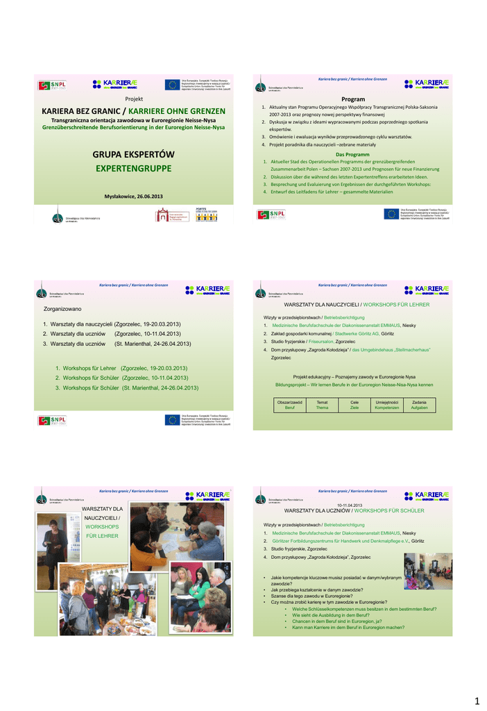 Kariera bez granic / Karriere ohne Grenzen 1 Projekt Program 1. Aktualny stan Programu Operacyjnego Współpracy Transgranicznej Polska-Saksonia 2007-2013 oraz prognozy nowej perspektywy finansowej 2. Dyskusja w związku z ideami wypracowanymi podczas poprzedniego spotkania KARIERA BEZ GRANIC / KARRIERE OHNE GRENZEN Transgraniczna orientacja zawodowa w Euroregionie Neisse-Nysa Grenzüberschreitende Berufsorientierung in der Euroregion Neisse-Nysa ekspertów. 3. Omówienie i ewaluacja wyników przeprowadzonego cyklu warsztatów. 4. Projekt poradnika dla nauczycieli –zebrane materiały GRUPA EKSPERTÓW EXPERTENGRUPPE Das Programm 1. Aktueller Stad des Operationellen Programms der grenzübergreifenden Zusammenarbeit Polen – Sachsen 2007-2013 und Prognosen für neue Finanzierung 2. Diskussion über die während des letzten Expertentreffens erarbeiteten Ideen. 3. Besprechung und Evaluierung von Ergebnissen der durchgeführten Workshops: 4. Entwurf des Leitfadens für Lehrer – gesammelte Materialien Mysłakowice, 26.06.2013 Kariera bez granic / Karriere ohne Grenzen Kariera bez granic / Karriere ohne Grenzen WARSZTATY DLA NAUCZYCIELI / WORKSHOPS FÜR LEHRER Zorganizowano Wizyty w przedsiębiorstwach / Betriebsberichtigung 1. Warsztaty dla nauczycieli (Zgorzelec, 19-20.03.2013) 1. 2. Warsztaty dla uczniów (Zgorzelec, 10-11.04.2013) 2. Zakład gospodarki komunalnej / Stadtwerke Görlitz AG, Görlitz 3. Warsztaty dla uczniów (St. Marienthal, 24-26.04.2013) 3. Studio fryzjerskie / Friseursalon, Zgorzelec Medizinische Berufsfachschule der Diakonissenanstalt EMMAUS, Niesky 4. Dom przysłupowy „Zagroda Kołodzieja” / das Umgebindehaus „Stellmacherhaus” Zgorzelec 1. Workshops für Lehrer (Zgorzelec, 19-20.03.2013) Projekt edukacyjny – Poznajemy zawody w Euroregionie Nysa 2. Workshops für Schüler (Zgorzelec, 10-11.04.2013) Bildungsprojekt – Wir lernen Berufe in der Euroregion Neisse-Nisa-Nysa kennen 3. Workshops für Schüler (St. Marienthal, 24-26.04.2013) Obszar/zawód Beruf Kariera bez granic / Karriere ohne Grenzen 5 Temat Thema Cele Ziele Umiejętności Kompetenzen Zadania Aufgaben Kariera bez granic / Karriere ohne Grenzen 10-11.04.2013 WARSZTATY DLA WARSZTATY DLA UCZNIÓW / WORKSHOPS FÜR SCHÜLER NAUCZYCIELI / WORKSHOPS FÜR LEHRER Wizyty w przedsiębiorstwach / Betriebsberichtigung 1. Medizinische Berufsfachschule der Diakonissenanstalt EMMAUS, Niesky 2. Görlitzer Fortbildungszentrums für Handwerk und Denkmalpflege e.V., Görlitz 3. Studio fryzjerskie, Zgorzelec 4. Dom przysłupowy „Zagroda Kołodzieja”, Zgorzelec • • • • Jakie kompetencje kluczowe musisz posiadać w danym/wybranym zawodzie? Jak przebiega kształcenie w danym zawodzie? Szanse dla tego zawodu w Euroregionie? Czy można zrobić karierę w tym zawodzie w Euroregionie? • • • • Welche Schlüsselkompetenzen muss besitzen in dem bestimmten Beruf? Wie sieht die Ausbildung in dem Beruf? Chancen in dem Beruf sind in Euroregion, ja? Kann man Karriere im dem Beruf in Euroregion machen? 1 Kariera bez granic / Karriere ohne Grenzen Kariera bez granic / Karriere ohne Grenzen 10-11.04.2013 WARSZTATY DLA UCZNIÓW / WORKSHOPS FÜR SCHÜLER WARSZTATY DLA UCZNIÓW / WORKSHOPS FÜR SCHÜLER • 10-11.04.2013 Czego wg ciebie powinien doświadczyć uczeń, żeby mógł powiedzieć o programie transgranicznej orientacji zawodowej? • Gdybyś w piątek miał przekonać kolegę do któregoś z omawianych zawodów jakie argumenty podasz? • Jakie powinny być najważniejsze wartości dla człowieka w kontekście transgranicznej orientacji zawodowej? • Was soll der Schüler erleben um über das Programm der grenzübergreifenden Berufsorientierung zu erzählen? • Wann du am Freitag deinen Schulfreund/deine Schulfreundin für einen von diesen Berufen überzeugen würdest – mit welchen Argumenten würdest du es untermauern? • Welche Werte sind für den jungen Menschen am wichtigsten im Kontext seiner beruflichen Karriere? Kariera bez granic / Karriere ohne Grenzen Kariera bez granic / Karriere ohne Grenzen WARSZTATY DLA UCZNIÓW / 24-26.04.2013 WARSZTATY DLA UCZNIÓW / WORKSHOPS FÜR SCHÜLER WORKSHOPS FÜR SCHÜLER Euroregionalny / Euroregionaler Girls’ & Boys’ Day Euroregionaler Girls’ & Boys’ Day 24-26.04.2013 Wizyty w przedsiębiorstwach / Betriebsberichtigung Chłopcy • Dom Pomocy Społecznej „Jędrek” w Opolnie Zdroju / Behinderteneinrichtung • Przedszkole w Libercu / Kindergarten in Liberec • Medyczna Szkoła Zawodowa przy Klinice Miejskiej, Görlitz Medizinischen Fachschule des Städtischen Klinikums Görlitz Dziewczyny • Kopalnia Węgla Brunatnego Turów / Grube Turów • Zintegrowana Szkołę Budowlaną i Ruchu Drogowego, Liberec / Integrierte Verkehrs- und Baufachschule • Siemens AG Energy Sector, Görlitz 12 Kariera bez granic / Karriere ohne Grenzen Kariera bez granic / Karriere ohne Grenzen 14 2013 I kw. II kw. III kw. IV kw. Warsztaty dla nauczycieli/ Workshop für Lehrer Warsztaty dla uczniów / Workshops für Schüler Warsztaty dla uczniów / Workshops für Schüler Warsztaty dla nauczycieli/ Workshop für Lehrer (20-21.02.2013, PL) (10-11.04.2013, PL) (18-19.09.2013, PL) (30-09-1.10.2013, DE) Grupa Ekspertów / Expertengruppe (14.03.2013, DE) Warsztaty dla uczniów / Workshops für Schüler (24-26.04.2013, DE) Warsztaty dla nauczycieli/ Workshop für Lehrer Grupa Ekspertów / Expertengruppe (19-20.03.2013, PL) (26.06.2013, DE) Warsztaty redakcyjne/ Redaktionsworkshop (15-18.10.2013, DE) BIURO PROJEKTU / PROJEKTBÜRO Dolnośląska Izba Rzemieślnicza we Wrocławiu Pl. Solny 13, 50-061 Wrocław Jakub Turański tel. 71/ 344 86 91 wew. 29 e-mail: [email protected] Marzena Łukowiak tel. 71/ 344 86 91 wew. 14 e-mail: [email protected] Grupa Ekspertów / Expertengruppe (06.11.2013, DE) Warsztaty dla nauczycieli./ Workshop für Lehrer --------Lead Partner: Internationales Begegnungszentrum St. Marienthal, PONTES-Agentur St. Marienthal 10, 02899 Ostritz (14-15.11.2013, PL