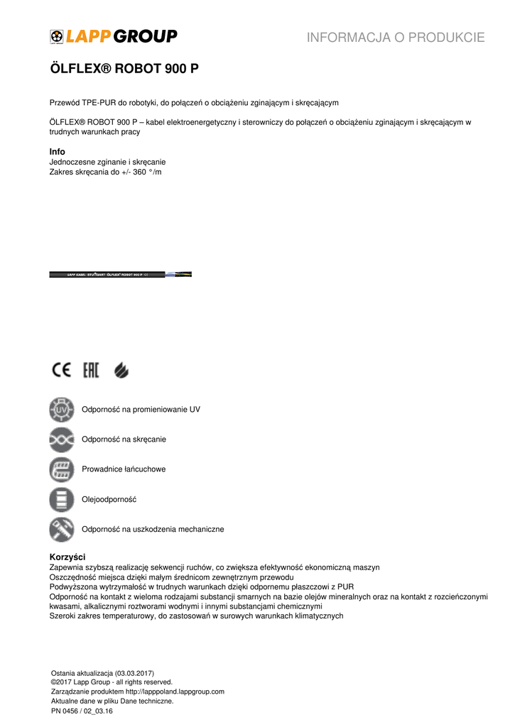 INFORMACJA O PRODUKCIE ÖLFLEX® ROBOT 900 P Przewód TPE-PUR do robotyki, do połączeń o obciążeniu zginającym i skręcającym ÖLFLEX® ROBOT 900 P – kabel elektroenergetyczny i sterowniczy do połączeń o obciążeniu zginającym i skręcającym w trudnych warunkach pracy Info Jednoczesne zginanie i skręcanie Zakres skręcania do +/- 360 °/m Odporność na promieniowanie UV Odporność na skręcanie Prowadnice łańcuchowe Olejoodporność Odporność na uszkodzenia mechaniczne Korzyści Zapewnia szybszą realizację sekwencji ruchów, co zwiększa efektywność ekonomiczną maszyn Oszczędność miejsca dzięki małym średnicom zewnętrznym przewodu Podwyższona wytrzymałość w trudnych warunkach dzięki odpornemu płaszczowi z PUR Odporność na kontakt z wieloma rodzajami substancji smarnych na bazie olejów mineralnych oraz na kontakt z rozcieńczonymi kwasami, alkalicznymi roztworami wodnymi i innymi substancjami chemicznymi Szeroki zakres temperaturowy, do zastosowań w surowych warunkach klimatycznych Ostania aktualizacja (03.03.2017) ©2017 Lapp Group - all rights reserved. Zarządzanie produktem http://lapppoland.lappgroup.com Aktualne dane w pliku Dane techniczne. PN 0456 / 02_03.16 INFORMACJA O PRODUKCIE ÖLFLEX® ROBOT 900 P Zakres zastosowania Budowa instalacji przemysłowych Maszyny przemysłowe i obrabiarki Automatyczne urządzenia transportu bliskiego Roboty wieloosiowe, przegubowe W prowadnicach łańcuchowych lub ruchomych częściach maszyn Cechy produktu Wytrzymałość na ścieranie i przecięcia Niepodtrzymywanie płomieni Podwyższona odporność na oleje Giętkie w niskiej temperaturze Powierzchnia o niskiej przyczepności Normy i aprobaty Na odcinkach ruchu do 10 m Zastosowanie w prowadnicach łańcuchowych: proszę postępować zgodnie z wytycznymi montażu - załącznik T3 Budowa produktu Żyły z cienkich lub bardzo cienkich drucików miedzianych Izolacja żyły: TPE Żyły skręcone warstwowo Wersja z dodatkową parą centralną: 2 żyły skręcone w parę, obwój z folii PTFE, warstwa cynowanych drucików miedzianych Obwój: taśma PTFE Płaszcz z poliuretanu (PUR), czarny (RAL 9005) Dane techniczne Klasyfikacja: ETIM 5.0 Class-ID: EC000104 Opis klasy ETIM 5.0: Przewód sterowniczy Oznaczenie żył: Do 0,34 mm²: DIN 47100 żyły Od przekroju 0,5 mm²: żyły czarne z białym nadrukiem numerycznym Pojemność robocza: Żyła/żyła około 100 nF/km Żyła/ekran około 120 nF/km Szczytowe napięcie robocze: 0,34 mm²: 350 V (nie do zastosowań silnoprądowych) Indukcyjność: Około 0,7 mH/km Budowa żyły: Z cienkich bądź bardzo cienkich drucików Skręcanie: Skręcenie maks. ± 360 °/m Minimalny promień gięcia: Połączenia ruchome: 15 x średnica zewnętrzna Połączenia nieruchome: 4 x średnica zewnętrzna Napięcie nominalne: Do przekroju 0,34 mm²: 48 V AC Od przekroju 0,5 mm² U0/U: 300/500 V Napięcie próbne: Do 0,34 mm²: 1500 V Od przekroju 0,5 mm²: 3000 V Żyła ochronna: G = z żyłą ochronną żółto - zieloną X = bez żyły ochronnej Zakres temperatury: Połączenia ruchome: od -40°C do +80°C Połączenia nieruchome: od-50°C do +80°C Ostania aktualizacja (03.03.2017) ©2017 Lapp Group - all rights reserved. Zarządzanie produktem http://lapppoland.lappgroup.com Aktualne dane w pliku Dane techniczne. PN 0456 / 02_03.16 INFORMACJA O PRODUKCIE ÖLFLEX® ROBOT 900 P Wskazówka Wszystkie podane wartości dotyczące produktów są wartościami nominalnymi w temperaturze pokojowej (o ile nie wskazano inaczej). Szczegółowe wartości (np. tolerancje) są dostępne na zamówienie. Standardowe odcinki proszę sprawdzić na: www.lapppolska.pl Rodzaj opakowania: krążek ≤ 30 kg lub ≤ 250 m, w przeciwnym razie bęben Prosimy określić wielkość opakowania (np. 1 x 500 m bęben lub 5 x 100 m krążek) Fotografie nie mogą być używane do wymiarowania oraz nie stanowią szczegółowego odwzorowania przedstawionych produktów. * Podane ceny to ceny netto bez podatku VAT i dodatkowych opłat. Sprzedaż klientom biznesowym. Ostania aktualizacja (03.03.2017) ©2017 Lapp Group - all rights reserved. Zarządzanie produktem http://lapppoland.lappgroup.com Aktualne dane w pliku Dane techniczne. PN 0456 / 02_03.16 Powered by TCPDF (www.tcpdf.org) Średnica zewnętrzna [mm] Indeks miedzi [kg/km] Waga [kg/km] 0028110 7 X 0,25 6,2 16,8 48 0028116 25 X 0,25 10,2 60 141 0028188 2 X 0,34 5 7 27 0028145 18 G 0,5 11,2 86,4 120 0028146 25 G 0,5 13,3 120 254 0028160 4 G 0,75 6,6 28,8 63 0028164 14 G 0,75 11,2 100,8 199 0028170 2X1 6,2 19,2 47 0028171 3G1 6,5 29 61 0028172 4G1 7 38,4 76 0028174 7G1 9,3 67,2 131 0028176 12 G 1 11,5 115,2 216 0028185 16 G 1,0 + (2 x 1,0) 16 195 376 0028178 18 G 1 13,2 172,8 287 0028186 23 G 1,0 + (2 x 1,0) 17,3 262 470 0028180 25 G 1 16,4 240 433 0028190 34 G 1 19,9 326,4 571 0028191 41 G 1 22,3 393,6 705 0028198 18 G 1,5 15,8 259,2 446 0028181 3 G 2,5 9,3 72 136 0028182 4 G 2,5 10,1 96 171 0028400 3 G 16 21,4 460,8 721 0028187 3 G 25 26,2 720 1178 0028189 3 G 35 28,8 1008 1559 ÖLFLEX® ROBOT 900 P INFORMACJA O PRODUKCIE Liczba żył i przekrój [mm²] ÖLFLEX® ROBOT 900 P Ostania aktualizacja (03.03.2017) ©2017 Lapp Group - all rights reserved. Zarządzanie produktem http://lapppoland.lappgroup.com Aktualne dane w pliku Dane techniczne. PN 0456 / 02_03.16 Powered by TCPDF (www.tcpdf.org) Numer katalogowy