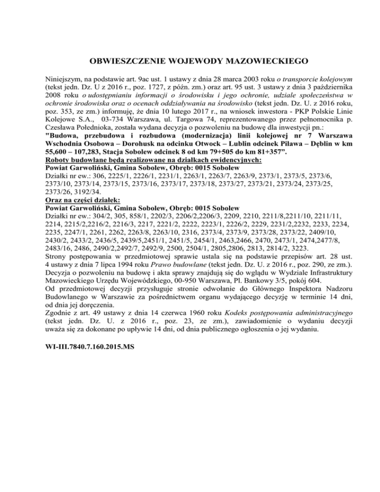 OBWIESZCZENIE WOJEWODY MAZOWIECKIEGO Niniejszym, na podstawie art. 9ac ust. 1 ustawy z dnia 28 marca 2003 roku o transporcie kolejowym (tekst jedn. Dz. U z 2016 r., poz. 1727, z późn. zm.) oraz art. 95 ust. 3 ustawy z dnia 3 października 2008 roku o udostępnianiu informacji o środowisku i jego ochronie, udziale społeczeństwa w ochronie środowiska oraz o ocenach oddziaływania na środowisko (tekst jedn. Dz. U. z 2016 roku, poz. 353, ze zm.) informuję, że dnia 10 lutego 2017 r., na wniosek inwestora - PKP Polskie Linie Kolejowe S.A., 03-734 Warszawa, ul. Targowa 74, reprezentowanego przez pełnomocnika p. Czesława Połednioka, została wydana decyzja o pozwoleniu na budowę dla inwestycji pn.: "Budowa, przebudowa i rozbudowa (modernizacja) linii kolejowej nr 7 Warszawa Wschodnia Osobowa – Dorohusk na odcinku Otwock – Lublin odcinek Pilawa – Dęblin w km 55,600 – 107,283, Stacja Sobolew odcinek 8 od km 79+505 do km 81+357”. Roboty budowlane będą realizowane na działkach ewidencyjnych: Powiat Garwoliński, Gmina Sobolew, Obręb: 0015 Sobolew Działki nr ew.: 306, 2225/1, 2226/1, 2231/1, 2263/1, 2263/7, 2263/9, 2373/1, 2373/5, 2373/6, 2373/10, 2373/14, 2373/15, 2373/16, 2373/17, 2373/18, 2373/27, 2373/21, 2373/24, 2373/25, 2373/26, 3192/34. Oraz na części działek: Powiat Garwoliński, Gmina Sobolew, Obręb: 0015 Sobolew Działki nr ew.: 304/2, 305, 858/1, 2202/3, 2206/2,2206/3, 2209, 2210, 2211/8,2211/10, 2211/11, 2214, 2215/2,2216/2, 2216/3, 2217, 2221/2, 2222, 2223/1, 2226/2, 2229, 2231/2,2232, 2233, 2234, 2235, 2247/1, 2261, 2262, 2263/8, 2263/10, 2316, 2373/4, 2373/9, 2373/28, 2373/22, 2409/10, 2430/2, 2433/2, 2436/5, 2439/5,2451/1, 2451/5, 2454/1, 2463,2466, 2470, 2473/1, 2474,2477/8, 2483/16, 2486, 2490/2,2492/7, 2492/9, 2500, 2504/1, 2805,2806, 2813, 2814/2, 3223. Strony postępowania w przedmiotowej sprawie ustala się na podstawie przepisów art. 28 ust. 4 ustawy z dnia 7 lipca 1994 roku Prawo budowlane (tekst jedn. Dz. U. z 2016 r., poz. 290, ze zm.). Decyzja o pozwoleniu na budowę i akta sprawy znajdują się do wglądu w Wydziale Infrastruktury Mazowieckiego Urzędu Wojewódzkiego, 00-950 Warszawa, Pl. Bankowy 3/5, pokój 604. Od przedmiotowej decyzji przysługuje stronie odwołanie do Głównego Inspektora Nadzoru Budowlanego w Warszawie za pośrednictwem organu wydającego decyzję w terminie 14 dni, od dnia jej doręczenia. Zgodnie z art. 49 ustawy z dnia 14 czerwca 1960 roku Kodeks postępowania administracyjnego (tekst jedn. Dz. U. z 2016 r., poz. 23, ze zm.), zawiadomienie o wydaniu decyzji uważa się za dokonane po upływie 14 dni, od dnia publicznego ogłoszenia o jej wydaniu. WI-III.7840.7.160.2015.MS