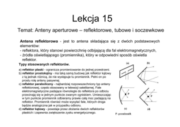 Lekcja 15 Temat: Anteny aperturowe – reflektorowe, tubowe i soczewkowe Antena reflektorowa - jest to antena składająca się z dwóch podstawowych elementów: - reflektora, który stanowi powierzchnię odbijającą dla fal elektromagnetycznych, - źródła oświetlającego (promiennika), który w odpowiedni sposób oświetla reflektor. Typy stosowanych reflektorów. a) reflektor płaski - ogranicza promieniowanie do jednej przestrzeni. b) reflektor prostokątny - ma taką samą budowę jak reflektor kątowy z tą jednak różnicą, że nie występuje tu promiennik. Pełni on po prostu rolę anteny pasywnej. c) reflektor paraboliczny - najbardziej rozpowszechniony typ anteny reflektorowej, często stosowany w telewizji satelitarnej. Fale elektromagnetyczne padające równolegle do reflektora po odbiciu przecinają się w jednym punkcie zwanym ogniskiem. Umieszczając w tym punkcie promiennik odbieramy prawie całą moc padającą na reflektor. Promiennik również może wysyłać fale, których droga będzie analogiczna jak w przypadku odbioru. d) reflektor kątowy - powstaje przez złożenie dwóch reflektorów płaskich i zapewnia zwiększenie zysku energetycznego. Antena tubowa. W najprostszym wykonaniu antena tubowa to falowód prostokątny. Koniec falowodu nie jest optymalnym przejściem fali elektromagnetycznej do wolnej przestrzeni. Niestety na końcu falowodu pojawia się duża fala odbita. Odpowiednie przekształcenia konstrukcyjne dokonane na końcu falowodu prowadzą do stworzenia anteny tubowej, która posiada już lepsze parametry (mniejszy WFS) Na rysunku przedstawiono typy anten tubowych. a) tuba sektorowa typu H - zwiększenie rozmiarów falowodu następuje wzdłuż dłuższej ścianki falowodu (płaszczyzna H), b) tuba sektorowa typu E - zwiększenie rozmiarów falowdu następuje wzdłuż krótszej ścianki falowodu (płaszczyzna E), c) tuba piramidalna - w której występuje rozszerzenie wymiarów w obu płaszczyznach. Pozostałymi typami anten tubowych są: tuba stożkowa, tuba dwustożkowa, tuba paraboliczno-tubowa.