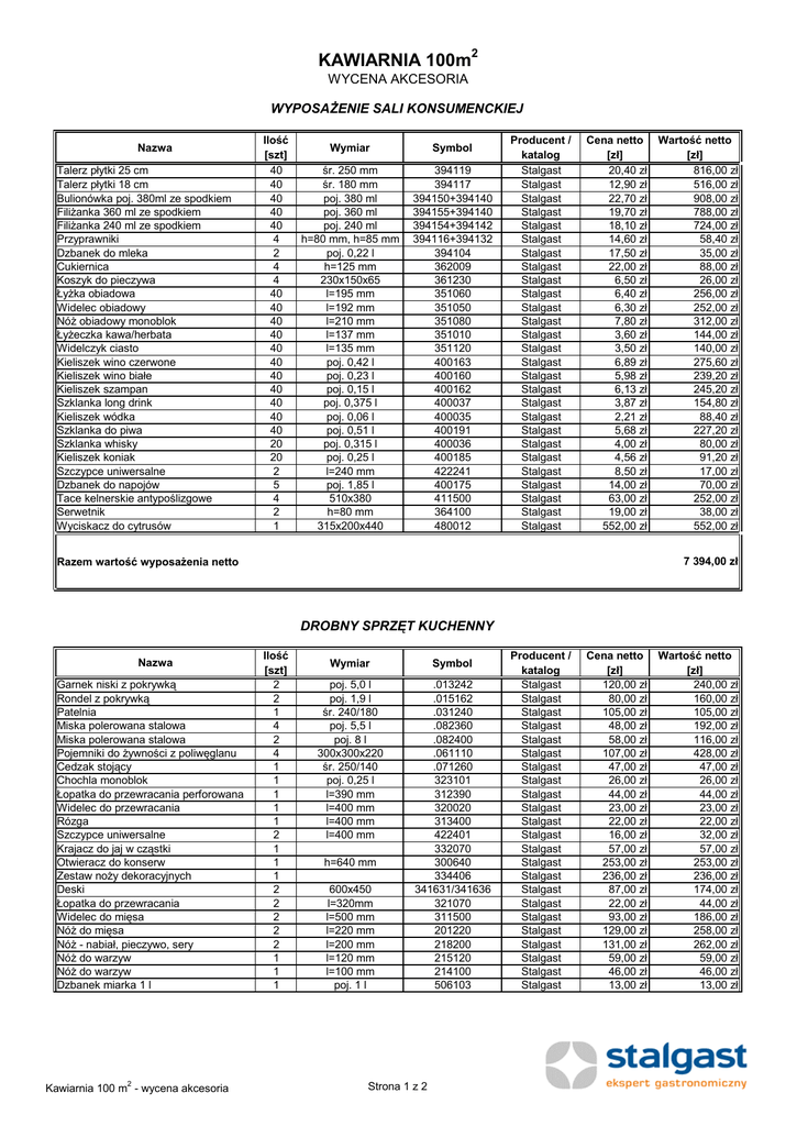 KAWIARNIA 100m2 WYCENA AKCESORIA WYPOSAŻENIE SALI KONSUMENCKIEJ Nazwa Talerz płytki 25 cm Talerz płytki 18 cm Bulionówka poj. 380ml ze spodkiem Filiżanka 360 ml ze spodkiem Filiżanka 240 ml ze spodkiem Przyprawniki Dzbanek do mleka Cukiernica Koszyk do pieczywa Łyżka obiadowa Widelec obiadowy Nóż obiadowy monoblok Łyżeczka kawa/herbata Widelczyk ciasto Kieliszek wino czerwone Kieliszek wino białe Kieliszek szampan Szklanka long drink Kieliszek wódka Szklanka do piwa Szklanka whisky Kieliszek koniak Szczypce uniwersalne Dzbanek do napojów Tace kelnerskie antypoślizgowe Serwetnik Wyciskacz do cytrusów Ilość [szt] 40 40 40 40 40 4 2 4 4 40 40 40 40 40 40 40 40 40 40 40 20 20 2 5 4 2 1 Wymiar Symbol śr. 250 mm śr. 180 mm poj. 380 ml poj. 360 ml poj. 240 ml h=80 mm, h=85 mm poj. 0,22 l h=125 mm 230x150x65 l=195 mm l=192 mm l=210 mm l=137 mm l=135 mm poj. 0,42 l poj. 0,23 l poj. 0,15 l poj. 0,375 l poj. 0,06 l poj. 0,51 l poj. 0,315 l poj. 0,25 l l=240 mm poj. 1,85 l 510x380 h=80 mm 315x200x440 394119 394117 394150+394140 394155+394140 394154+394142 394116+394132 394104 362009 361230 351060 351050 351080 351010 351120 400163 400160 400162 400037 400035 400191 400036 400185 422241 400175 411500 364100 480012 Producent / katalog Stalgast Stalgast Stalgast Stalgast Stalgast Stalgast Stalgast Stalgast Stalgast Stalgast Stalgast Stalgast Stalgast Stalgast Stalgast Stalgast Stalgast Stalgast Stalgast Stalgast Stalgast Stalgast Stalgast Stalgast Stalgast Stalgast Stalgast Cena netto Wartość netto [zł] [zł] 20,40 zł 816,00 zł 12,90 zł 516,00 zł 22,70 zł 908,00 zł 19,70 zł 788,00 zł 18,10 zł 724,00 zł 14,60 zł 58,40 zł 17,50 zł 35,00 zł 22,00 zł 88,00 zł 6,50 zł 26,00 zł 6,40 zł 256,00 zł 6,30 zł 252,00 zł 7,80 zł 312,00 zł 3,60 zł 144,00 zł 3,50 zł 140,00 zł 6,89 zł 275,60 zł 5,98 zł 239,20 zł 6,13 zł 245,20 zł 3,87 zł 154,80 zł 2,21 zł 88,40 zł 5,68 zł 227,20 zł 4,00 zł 80,00 zł 4,56 zł 91,20 zł 8,50 zł 17,00 zł 14,00 zł 70,00 zł 63,00 zł 252,00 zł 19,00 zł 38,00 zł 552,00 zł 552,00 zł 7 394,00 zł Razem wartość wyposażenia netto DROBNY SPRZĘT KUCHENNY Nazwa Garnek niski z pokrywką Rondel z pokrywką Patelnia Miska polerowana stalowa Miska polerowana stalowa Pojemniki do żywności z poliwęglanu Cedzak stojący Chochla monoblok Łopatka do przewracania perforowana Widelec do przewracania Rózga Szczypce uniwersalne Krajacz do jaj w cząstki Otwieracz do konserw Zestaw noży dekoracyjnych Deski Łopatka do przewracania Widelec do mięsa Nóż do mięsa Nóż - nabiał, pieczywo, sery Nóż do warzyw Nóż do warzyw Dzbanek miarka 1 l Kawiarnia 100 m2 - wycena akcesoria Ilość [szt] 2 2 1 4 2 4 1 1 1 1 1 2 1 1 1 2 2 2 2 2 1 1 1 Wymiar Symbol poj. 5,0 l poj. 1,9 l śr. 240/180 poj. 5,5 l poj. 8 l 300x300x220 śr. 250/140 poj. 0,25 l l=390 mm l=400 mm l=400 mm l=400 mm .013242 .015162 .031240 .082360 .082400 .061110 .071260 323101 312390 320020 313400 422401 332070 300640 334406 341631/341636 321070 311500 201220 218200 215120 214100 506103 h=640 mm 600x450 l=320mm l=500 mm l=220 mm l=200 mm l=120 mm l=100 mm poj. 1 l Strona 1 z 2 Producent / katalog Stalgast Stalgast Stalgast Stalgast Stalgast Stalgast Stalgast Stalgast Stalgast Stalgast Stalgast Stalgast Stalgast Stalgast Stalgast Stalgast Stalgast Stalgast Stalgast Stalgast Stalgast Stalgast Stalgast Cena netto Wartość netto [zł] [zł] 120,00 zł 240,00 zł 80,00 zł 160,00 zł 105,00 zł 105,00 zł 48,00 zł 192,00 zł 58,00 zł 116,00 zł 107,00 zł 428,00 zł 47,00 zł 47,00 zł 26,00 zł 26,00 zł 44,00 zł 44,00 zł 23,00 zł 23,00 zł 22,00 zł 22,00 zł 16,00 zł 32,00 zł 57,00 zł 57,00 zł 253,00 zł 253,00 zł 236,00 zł 236,00 zł 87,00 zł 174,00 zł 22,00 zł 44,00 zł 93,00 zł 186,00 zł 129,00 zł 258,00 zł 131,00 zł 262,00 zł 59,00 zł 59,00 zł 46,00 zł 46,00 zł 13,00 zł 13,00 zł DROBNY SPRZĘT KUCHENNY Nazwa Porcjoner do lodów Termometr elektroniczny z sondą Ilość [szt] 1 1 Wymiar Symbol porcja 19 g 531360 620410 Cena netto Wartość netto [zł] [zł] 140,00 zł 140,00 zł 99,00 zł 99,00 zł 3 262,00 zł Razem wartość wyposażenia netto wg cennika z października 2016 r. katalog wydanie XXXVI końcowa wycena zależna jest od ostatecznego projektu Kawiarnia 100 m2 - wycena akcesoria Producent / katalog Stalgast Stalgast Strona 2 z 2