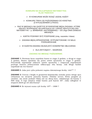KONKURS NA NAJLEPSZEGO MATEMATYKA KLAS TRZECICH W KONKURSIE MOŻE WZIĄĆ UDZIAŁ KAŻDY KONKURS TRWA OD PAŹDZIERNIKA DO KWIETNIA (Z WYŁĄCZENIEM LUTEGO) RAZ W MIESIĄCU NA GAZETCE WYWIESZONE BĘDĄ ZADANIA. KTÓRE NALEŻY ROZWIĄZAĆ NA KARTKACH A4 I ODDAĆ NAUCZYCIELOWI MATEMATYKI – p. BARBARZE JASTRZĘBSKIEJ – DO 25go DNIA DANEGO MIESIĄCA KARTKI POWINNY BYĆ PODPISANE (imię, nazwisko i klasa) ZADANIA BĘDĄ SPRAWDZONE, WYPUNKTOWANE I W MAJU PODSUMOWANE W KAŻDYM ZADANIU MUSZĄ BYĆ KONKRETNE OBLICZENIA DLA ZWYCIĘZCY – NAGRODA ZADANIA NA MIESIĄC PAŹDZIERNIK: ZADANIE 1: Pierwszy kran napełnia basen w ciągu 2 godzin, a drugi w ciągu 4 godzin. Basen opróżnia się przez otwór spustowy w ciągu 3 godzin. Pracownik zapomniał zakręcić zawór spustowy i rozpoczął napełnianie pustego basenu jednocześnie odkręcając oba krany. Jak długo będzie napełniał się ten basen? ZADANIE 2: Jaka jest cyfra jedności zapisu dziesiętnego liczby 19992000 ? ZADANIE 3: Urocza i biegła w geometrii księżniczka została przez swego ojca uwięziona na szczycie ponurej baszty. Dzielny rycerz, który pragnie ją uwolnić, nie może podejść bliżej niż na skraj lasu, oddalonego od baszty o 500 stóp. Z tego miejsca widzi basztę pod kątem 45°. Jaka odległość w stopach dzieli go od ukochanej? ZADANIE 4: Ile wynosi suma cyfr liczby 1098 – 1998 ?