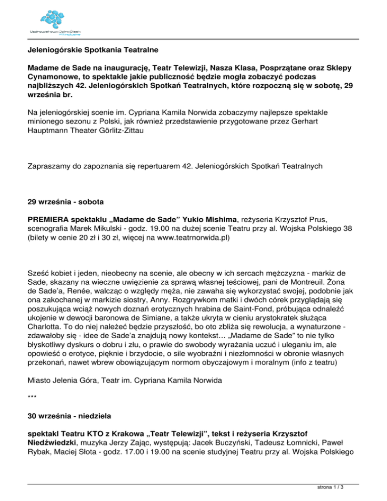 Jeleniogórskie Spotkania Teatralne Madame de Sade na inaugurację, Teatr Telewizji, Nasza Klasa, Posprzątane oraz Sklepy Cynamonowe, to spektakle jakie publiczność będzie mogła zobaczyć podczas najbliższych 42. Jeleniogórskich Spotkań Teatralnych, które rozpoczną się w sobotę, 29 września br. Na jeleniogórskiej scenie im. Cypriana Kamila Norwida zobaczymy najlepsze spektakle minionego sezonu z Polski, jak również przedstawienie przygotowane przez Gerhart Hauptmann Theater Görlitz-Zittau Zapraszamy do zapoznania się repertuarem 42. Jeleniogórskich Spotkań Teatralnych 29 września - sobota PREMIERA spektaklu „Madame de Sade” Yukio Mishima, reżyseria Krzysztof Prus, scenografia Marek Mikulski - godz. 19.00 na dużej scenie Teatru przy al. Wojska Polskiego 38 (bilety w cenie 20 zł i 30 zł, więcej na www.teatrnorwida.pl) Sześć kobiet i jeden, nieobecny na scenie, ale obecny w ich sercach mężczyzna - markiz de Sade, skazany na wieczne uwięzienie za sprawą własnej teściowej, pani de Montreuil. Żona de Sade’a, Renée, walcząc o względy męża, nie zawaha się wykorzystać swojej, podobnie jak ona zakochanej w markizie siostry, Anny. Rozgrywkom matki i dwóch córek przyglądają się poszukująca wciąż nowych doznań erotycznych hrabina de Saint-Fond, próbująca odnaleźć ukojenie w dewocji baronowa de Simiane, a także ukryta w cieniu arystokratek służąca Charlotta. To do niej należeć będzie przyszłość, bo oto zbliża się rewolucja, a wynaturzone zdawałoby się - idee de Sade’a znajdują nowy kontekst… „Madame de Sade” to nie tylko błyskotliwy dyskurs o dobru i złu, o prawie do swobody wyrażania uczuć i uleganiu im, ale opowieść o erotyce, pięknie i brzydocie, o sile wyobraźni i niezłomności w obronie własnych przekonań, nawet wbrew obowiązującym normom obyczajowym i moralnym (info z teatru) Miasto Jelenia Góra, Teatr im. Cypriana Kamila Norwida *** 30 września - niedziela spektakl Teatru KTO z Krakowa „Teatr Telewizji”, tekst i reżyseria Krzysztof Niedźwiedzki, muzyka Jerzy Zając, występują: Jacek Buczyński, Tadeusz Łomnicki, Paweł Rybak, Maciej Słota - godz. 17.00 i 19.00 na scenie studyjnej Teatru przy al. Wojska Polskiego strona 1 / 3 38 (bilety w cenie 20 zł i 30 zł, więcej na www.teatrnorwida.pl) Teatr Telewizji to komedia sensacyjna. Losy bohaterów poprzednich dwóch spektakli Krzysztofa Niedźwiedzkiego: „Atramentu dla leworęcznych” i „Świętych tego tygodnia” stają się niespodziewanie dla nich samych podstawą scenariusza jednego z odcinków telewizyjnego serialu kryminalnego - odcinka, który transmitowany jest tym razem na żywo. W spektaklu tym mamy z jednej strony sensacyjną i zagadkową fabułę, z drugiej potężną dawkę humoru, który skutecznie rozbraja narastającą atmosferę grozy, z trzeciej zaskakujące zakończenie… Krzysztof Niedźwiedzki - w 1996 roku założył istniejącą do dzisiaj grupę kabaretową Formacja Chatelet. Jest autorem tekstów i reżyserem dwóch pierwszych programów tej grupy. Współredaguje humorystyczne pismo Nowy Pompon. Zajmuje się pisaniem tekstów satyrycznych, scenariuszy telewizyjnych i sztuk teatralnych (info www.teatrkto.pl) Miasto Jelenia Góra, Teatr im. Cypriana Kamila Norwida *** 1 października - poniedziałek spektakl Teatru Na Woli im. Tadeusza Łomnickiego z Warszawy „Nasza klasa. Historia w XIV lekcjach” Tadeusz Słobodzianek, reżyseria Ondrej Spišák, II reżyser Aldona Figura, scenografia František Liptak - godz. 19.00 na dużej scenie Teatru przy al. Wojska Polskiego 38 (bilety w cenie 30 zł i 50 zł, więcej na www.teatrnorwida.pl) Niezwykła historia uczniów z jednej klasy. Razem uczą się, bawią, chuliganią, wchodzą w dorosłość. Marzą, żeby zostać lotnikiem, lekarzem, gwiazdą filmową. Czytają „Trylogię” Sienkiewicza. Chodzą na filmy z Chaplinem. Słuchają jazzu. Dlaczego chłopak, który wyciął serce z papieru i napisał miłosny wiersz, kilka lat później związał koleżance ręce sznurkiem i zagroził, że zastrzeli, jeśli będzie próbowała uciekać? Co się wydarzyło, że narodowość, religia i ideologia okazały się ważniejsze niż przyjaźń? Kiedy w koledze ze szkolnej ławki zobaczono Obcego? Co się stało z tamtą klasą? Opowieść o XX-wiecznej Polsce inspirowana prawdziwymi zdarzeniami. „Nasza klasa” Tadeusza Słobodzianka to pierwszy polski dramat uhonorowany Literacką Nagrodą „Nike” (info www.labodram.pl) Miasto Jelenia Góra, Teatr im. Cypriana Kamila Norwida *** 2 października - wtorek spektakl Teatru im. Stefana Jaracza z Łodzi „Posprzątane” Sarah Ruhl; reżyseria, strona 2 / 3 scenografia, opracowanie muzyczne Mariusz Grzegorzek - godz. 19.00 na dużej scenie Teatru przy al. Wojska Polskiego 38 (bilety w cenie 30 zł i 50 zł, więcej na www.teatrnorwida.pl) Jesteś perfekcjonistą: awansujesz, prowadzisz idealny dom, wierzysz w swoją wyjątkowość. A może przeciwnie, już dawno pożegnałeś się z ambicjami i pozory zaprowadzenia ładu we wszechświecie daje ci tylko obsesyjne sprzątanie. Albo po prostu: żyjesz z ludźmi, a jednak daleko od nich. Twoją codzienność najkrócej można określić słowem „funkcjonalna”? Jeśli choć trochę przypominasz Lane, Virginię bądź Matilde, najwyraźniej potrzebujesz pomocy. Terapia? A może wystarczy dobry spektakl? Mariusz Grzegorzek robi tragifarsę. Wielokrotnie nagradzana sztuka Sarah Ruhl w gwiazdorskiej obsadzie. Scenografia niczym z mediolańskiej galerii designu. Kontrowersyjny reżyser, którego spektakle szarpią emocje najodporniejszych widzów. Dziwność zdarzeń i postaci, miłość i śmierć, przyjaźń i samotność. Historia, która może poruszyć każdego z nas i pokazać, że z życia można czerpać garściami. A wreszcie wyrafinowane poczucie humoru - bo „dobry dowcip może posprzątać duszę”! (info z www.teatr-jaracza.lodz.pl) Miasto Jelenia Góra, Tea