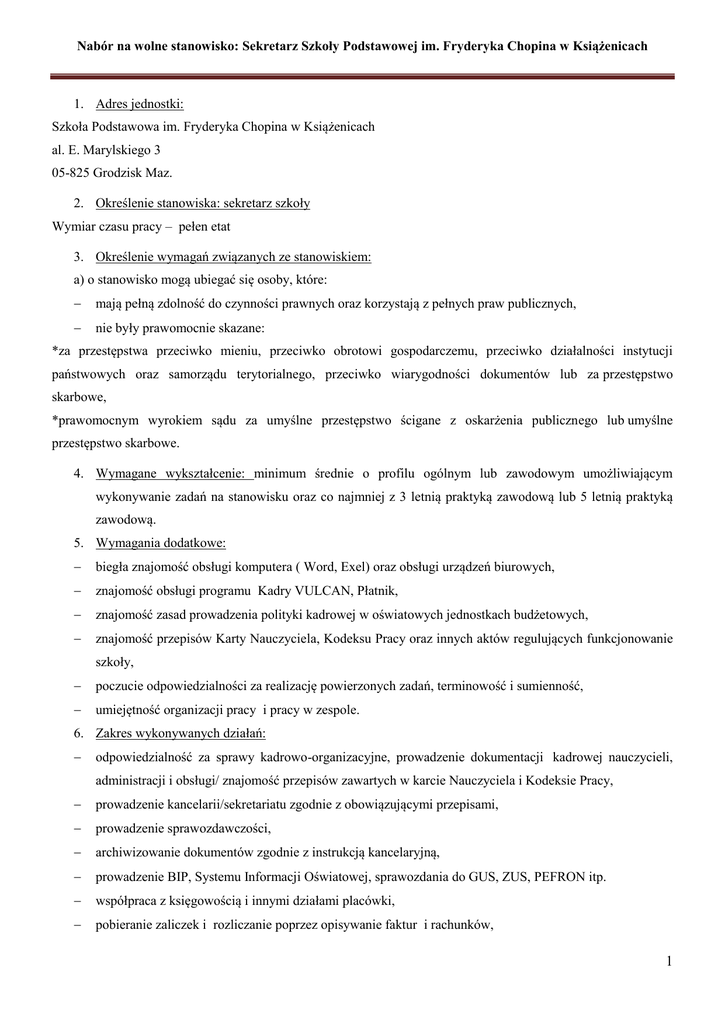 Nabór na wolne stanowisko: Sekretarz Szkoły Podstawowej im. Fryderyka Chopina w Książenicach 1. Adres jednostki: Szkoła Podstawowa im. Fryderyka Chopina w Książenicach al. E. Marylskiego 3 05-825 Grodzisk Maz. 2. Określenie stanowiska: sekretarz szkoły Wymiar czasu pracy – pełen etat 3. Określenie wymagań związanych ze stanowiskiem: a) o stanowisko mogą ubiegać się osoby, które: mają pełną zdolność do czynności prawnych oraz korzystają z pełnych praw publicznych, nie były prawomocnie skazane: *za przestępstwa przeciwko mieniu, przeciwko obrotowi gospodarczemu, przeciwko działalności instytucji państwowych oraz samorządu terytorialnego, przeciwko wiarygodności dokumentów lub za przestępstwo skarbowe, *prawomocnym wyrokiem sądu za umyślne przestępstwo ścigane z oskarżenia publicznego lub umyślne przestępstwo skarbowe. 4. Wymagane wykształcenie: minimum średnie o profilu ogólnym lub zawodowym umożliwiającym wykonywanie zadań na stanowisku oraz co najmniej z 3 letnią praktyką zawodową lub 5 letnią praktyką zawodową. 5. Wymagania dodatkowe: biegła znajomość obsługi komputera ( Word, Exel) oraz obsługi urządzeń biurowych, znajomość obsługi programu Kadry VULCAN, Płatnik, znajomość zasad prowadzenia polityki kadrowej w oświatowych jednostkach budżetowych, znajomość przepisów Karty Nauczyciela, Kodeksu Pracy oraz innych aktów regulujących funkcjonowanie szkoły, poczucie odpowiedzialności za realizację powierzonych zadań, terminowość i sumienność, umiejętność organizacji pracy i pracy w zespole. 6. Zakres wykonywanych działań: odpowiedzialność za sprawy kadrowo-organizacyjne, prowadzenie dokumentacji kadrowej nauczycieli, administracji i obsługi/ znajomość przepisów zawartych w karcie Nauczyciela i Kodeksie Pracy, prowadzenie kancelarii/sekretariatu zgodnie z obowiązującymi przepisami, prowadzenie sprawozdawczości, archiwizowanie dokumentów zgodnie z instrukcją kancelaryjną, prowadzenie BIP, Systemu Informacji Oświatowej, sprawozdania do GUS, ZUS, PEFRON itp. współpraca z księgowością i innymi działami placówki, pobieranie zaliczek i rozliczanie poprzez opisywanie faktur i rachunków, 1 Nabór na wolne stanowisko: Sekretarz Szkoły Podstawowej im. Fryderyka Chopina w Książenicach prowadzenie dokumentacji osobowej uczniów, wydawanie zaświadczeń, legitymacji uczniom i pracownikom szkoły, obsługa interesantów, udzielanie informacji, dokonywanie kontroli wewnętrznej kasy, organizowanie wraz z dyrektorem kontroli wewnętrznej gospodarki finansowej i materiałowej, przestrzeganie zasad rozliczeń pieniężnych i ochrony wartości pieniężnych, kontrolowanie realizacji obowiązku szkolnego i przedszkolnego, prowadzenie gospodarki drukami ścisłego zarachowania tj. świadectwa, legitymacje uczniowskie i pracowników, przechowywanie i nadzór nad używaniem pieczęci urzędowych, prowadzenie księgi wyjść pracowników poza obiekty szkolne, wykonywanie innych zadań zlecanych przez dyrektora. 7. Kandydat na stanowisko urzędnicze musi złożyć: list motywacyjny i życiorys (CV), wypełniony kwestionariusz osobowy dla osoby ubiegającej się o zatrudnienie, dokumenty potwierdzające kwalifikacje zawodowe, dokumenty potwierdzające okresy zatrudnienia oraz przebieg pracy zawodowej (kserokopie świadectw pracy, referencji, opinii, zaświadczeń o odbytych kursach, szkoleniach), oświadczenie kandydata, że nie był prawomocnie skazany: za przestępstwa przeciwko mieniu, przeciwko obrotowi gospodarczemu, przeciwko działalności instytucji państwowych oraz samorządu terytorialnego, przeciwko wiarygodności dokumentów lub za przestępstwo skarbowe, oświadczenie o posiadaniu pełnej zdolności do czynności prawnych, oświadczenie o korzystaniu z pełni praw publicznych, oświadczenie kandydata o wyrażeniu zgody na przetwarzanie danych osobowych do celów rekrutacji. 8. Termin składania ofert: Dokumenty należy składać w ciągu 14 dni od daty opublikowania ogłoszenia tj. do dnia 20 grudnia 2016 r. w sekretariacie szkoły w godz. od 8.00 do 15.00. Dokumenty należy złożyć w zamkniętej kopercie z dopiskiem „Nabór na stanowisko sekretarz szkoły”. Kandydaci, których oferty spełnią wymagania formalne i zostaną złożone w wyznaczonym terminie, będą zaproszenie na rozmowę kwalifikacyjną. Lista kandydatów spełniających wymogi formalne będzie umieszczona na stronie internetowej Szkoły Podstawowej w Książenicach. Dyrektor Szkoły Podstawowej im. Fryderyka Chopina w Książenicach Katarzyna Galla 2