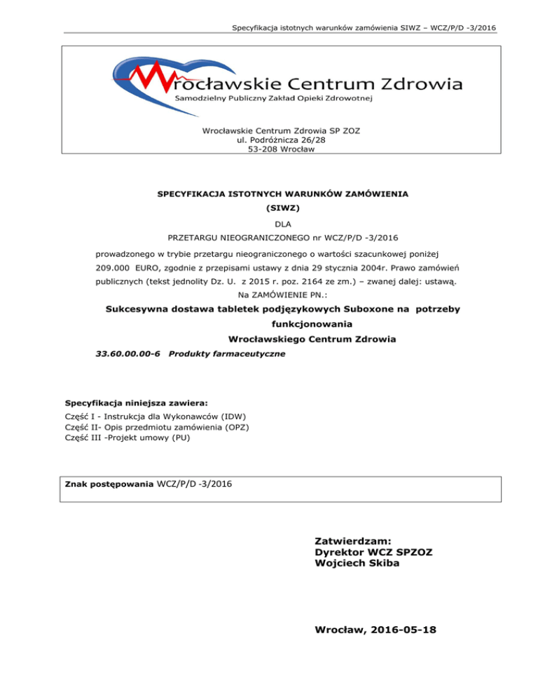 Specyfikacja istotnych warunków zamówienia SIWZ – WCZ/P/D -3/2016 Wrocławskie Centrum Zdrowia SP ZOZ ul. Podróżnicza 26/28 53-208 Wrocław SPECYFIKACJA ISTOTNYCH WARUNKÓW ZAMÓWIENIA (SIWZ) DLA PRZETARGU NIEOGRANICZONEGO nr WCZ/P/D -3/2016 prowadzonego w trybie przetargu nieograniczonego o wartości szacunkowej poniżej 209.000 EURO, zgodnie z przepisami ustawy z dnia 29 stycznia 2004r. Prawo zamówień publicznych (tekst jednolity Dz. U. z 2015 r. poz. 2164 ze zm.) – zwanej dalej: ustawą. Na ZAMÓWIENIE PN.: Sukcesywna dostawa tabletek podjęzykowych Suboxone na potrzeby funkcjonowania Wrocławskiego Centrum Zdrowia 33.60.00.00-6 Produkty farmaceutyczne Specyfikacja niniejsza zawiera: Część I - Instrukcja dla Wykonawców (IDW) Część II- Opis przedmiotu zamówienia (OPZ) Część III -Projekt umowy (PU) Znak postępowania WCZ/P/D -3/2016 Zatwierdzam: Dyrektor WCZ SPZOZ Wojciech Skiba Wrocław, 2016-05-18 Specyfikacja istotnych warunków zamówienia SIWZ – WCZ/P/D -3/2016 (załącznik A do SIWZ) SIWZ Część II Opis przedmiotu zamówienia (OPZ) 2 Specyfikacja istotnych warunków zamówienia SIWZ – WCZ/P/D -3/2016 1. Nazwa (firma) oraz adres Zamawiającego Wrocławskie Centrum Zdrowia SP ZOZ ul. Podróżnicza 26/28 53-208 Wrocław NIP: 894 24 60 800; REGON: 000313331 tel: 71 39 11 748 Faks: 71 39 11 759, adres strony internetowej: www.spzoz.wroc.pl Godziny urzędowania pn-pt. 7:30-15:00 2. OPIS PRZEDMIOTU ZAMÓWIENIA zamówienia jest: sukcesywna dostawa tabletek podjęzykowych Suboxone na potrzeby funkcjonowania Wrocławskiego Centrum Zdrowia 1. Przedmiotem 2. Wykonawca będzie dostarczał sukcesywnie lek do miejsca użytkowania tj.: l.p nazwa przychodni adres 1 Dział Farmacji ul. Wszystkich Świętych 2, Wrocław 3. Zamawiający wymaga, by oferowany lek posiadał aktualne wymagane prawem zezwolenia dopuszczające do obrotu i używania na terytorium Rzeczpospolitej Polskiej, zgodnie z wymaganiami określonymi w Ustawie z dnia 6 września 2001 Prawo farmaceutyczne (dz. U. tj. z 2008 nr 45 poz. 271 ze zm.) 4. Gwarancja: Dostarczane leki muszą posiadać min. 12 miesięczny terminem ważności, liczony od dnia odbioru leku przez Zamawiającego. 5. 1. 2. Specyfikacja techniczna przedmiotu zamówienia Rodzaj asortymentu Suboxone 2 mg/0,5 mg tabletki podjęzykowe, ilość tabletek w opakowaniu – 7 szt. Suboxone 8 mg/2 mg tabletki podjęzykowe, ilość tabletek w opakowaniu – 7 szt. Ilość opakowań 1750 1000 Uwaga: Zamawiający dopuszcza możliwość składania ofert równoważnych pod warunkiem, iż oferowany asortyment będzie o takich samych lub lepszych parametrach technicznych, jakościowych, funkcjonalnych oraz użytkowych w stosunku do podanego w Formularzu asortymentowo-cenowym stanowiącym załącznik nr 1A do IDW. Ilekroć Zamawiający wskazał w szczegółowym opisie przedmiotu zamówienia znak towarowy i/lub patent, i/lub pochodzenie to wskazaniu takiemu towarzyszą nieodłącznie wyrazy „lub równoważne". 3 Specyfikacja istotnych warunków zamówienia SIWZ – WCZ/P/D -3/2016 Jeżeli Wykonawca powołuje się na rozwiązania równoważne opisywanym przez Zamawiającego, to zgodnie z art. 30 ust. 5 ustawy z dnia 29 stycznia 2004 roku Prawo zamówień publicznych jest obowiązany wykazać, że oferowane produkty spełniają wymagania określone przez Zamawiającego. Definicja równoważności: Zamawiający dopuszcza oferty równoważne tzn. takie, w których przedmiot zamówienia spełnia wszystkie wymagania dotyczące składu chemicznego, spektrum działania, danych technicznych i jakościowych postawionych przez Zamawiającego, a od opisu przedmiotu zamówienia sporządzonego przez niego różni się znakiem towarowym, patentem lub pochodzeniem. Produkt równoważny posiada także identyczne wskazania i przeciwwskazania do stosowania. Wykonawca określi w Formularzu asortymentowo-cenowym (załącznik nr 1A do IDW) materiał równoważny, jeżeli taki będzie ofertowany przez wykonawcę z obowiązkiem podania symbolu i nazwy producenta przy każdej pozycji. Jeżeli Wykonawca nie wpisze żadnej nazwy będzie to oznaczało, ze oferuje produkt wskazany przez Zamawiającego. Zamawiający prowadzi działalność opartą na podstawowej i ambulatoryjnej specjalistycznej opiece zdrowotnej i posiada wyposażenie odpowiednie do tej specyfiki. Zamawiający Nie posiada oddziałów dziecięcych, noworodkowych, oddziałów anestezjologicznych oraz pionu żywieniowego. 4