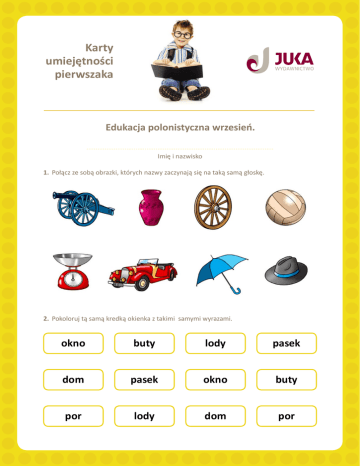 Karty umiejętności pierwszaka Edukacja polonistyczna wrzesień. Imię i nazwisko 1. Połącz ze sobą obrazki, których nazwy zaczynają się na taką samą głoskę. 2. Pokoloruj tą samą kredką okienka z takimi samymi wyrazami. okno buty lody pasek dom pasek okno buty por lody dom por Karty umiejętności pierwszaka 3. Nazwij rysunki i utwórz wyraz z pierwszych głosek. Narysuj w okienku rozwiązanie. 4. Pokoloruj żółtą kredką tylko te płatki kwiatka, w nazwie których znajduje się podana litera. lamp a am r b a r o k sk ty a u m b r a k a Pozostałe płatki pokoloruj dowolnym kolorem. a dom pa w w o d a Karty umiejętności pierwszaka 5. Połącz obrazki tak, aby nazwa kolejnego obrazka zaczynała się głoską, na którą kończy się nazwa poprzedniego. 6. Otocz czerwoną pętlą te obrazki, które związane są z latem. Karty umiejętności pierwszaka Edukacja matematyczna wrzesień. Imię i nazwisko 1. Pociąg wiezie dzieci z wakacji do domu. Pokoloruj lokomotywę na czerwono, trzy wagony na żółto, a dwa wagony na zielono. 2. Policz, ile wakacyjnych skarbów przywiozły dzieci. Narysuj w ramce pod każdym obrazkiem odpowiednią liczbę serduszek. 3. Pokoloruj piłki według poleceń. • piłkę z dwiema kropkami na czerwono; • piłkę z czterema kropkami na niebiesko; • piłkę z jedną kropką na żółto; • piłkę z trzema kropkami na zielono; • piłkę z pięcioma kropkami na brązowo; Karty umiejętności pierwszaka 4. W każdym koszyku narysuj tyle grzybów, ile wskazuje liczba kółeczek. 5. Dorysuj w każdej pętli o jeden liść klonu więcej. 6. Pokoloruj na czerwono czwarte jabłko, licząc od prawej strony, a na zielono trzecie jabłko licząc od lewej strony. • Narysuj w ramce tyle kresek, ile zostało niepokolorowanych jabłek. Karty umiejętności pierwszaka 7. Wytnij obrazki z ramki i przyklej je zgodnie z poleceniami. • słońce nad drzewem • chmurkę po prawej stronie słońca • sowę na gałęzi • pieska po lewej stronie drzewa • kotka po prawej stronie drzewa • żołędzie pod drzewem