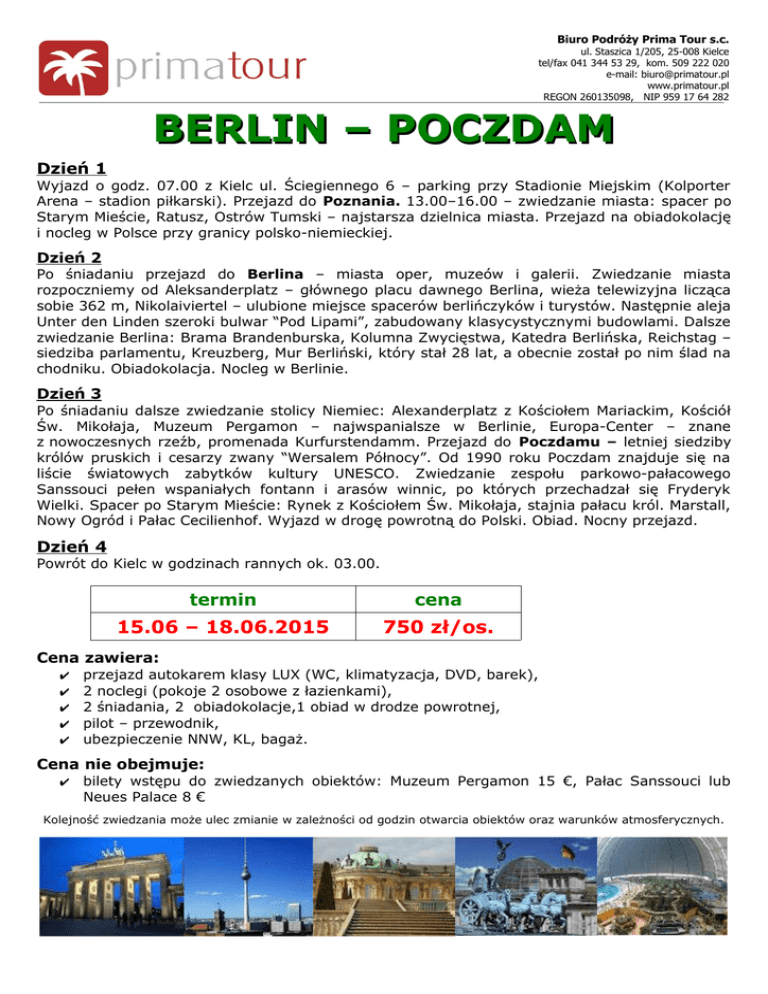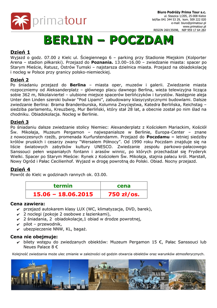 Biuro Podróży Prima Tour s.c. ul. Staszica 1/205, 25-008 Kielce tel/fax 041 344 53 29, kom. 509 222 020 e-mail: [email protected] www.primatour.pl REGON 260135098, NIP 959 17 64 282 BERLIN – POCZDAM Dzień 1 Wyjazd o godz. 07.00 z Kielc ul. Ściegiennego 6 – parking przy Stadionie Miejskim (Kolporter Arena – stadion piłkarski). Przejazd do Poznania. 13.00–16.00 – zwiedzanie miasta: spacer po Starym Mieście, Ratusz, Ostrów Tumski – najstarsza dzielnica miasta. Przejazd na obiadokolację i nocleg w Polsce przy granicy polsko-niemieckiej. Dzień 2 Po śniadaniu przejazd do Berlina – miasta oper, muzeów i galerii. Zwiedzanie miasta rozpoczniemy od Aleksanderplatz – głównego placu dawnego Berlina, wieża telewizyjna licząca sobie 362 m, Nikolaiviertel – ulubione miejsce spacerów berlińczyków i turystów. Następnie aleja Unter den Linden szeroki bulwar “Pod Lipami”, zabudowany klasycystycznymi budowlami. Dalsze zwiedzanie Berlina: Brama Brandenburska, Kolumna Zwycięstwa, Katedra Berlińska, Reichstag – siedziba parlamentu, Kreuzberg, Mur Berliński, który stał 28 lat, a obecnie został po nim ślad na chodniku. Obiadokolacja. Nocleg w Berlinie. Dzień 3 Po śniadaniu dalsze zwiedzanie stolicy Niemiec: Alexanderplatz z Kościołem Mariackim, Kościół Św. Mikołaja, Muzeum Pergamon – najwspanialsze w Berlinie, Europa-Center – znane z nowoczesnych rzeźb, promenada Kurfurstendamm. Przejazd do Poczdamu – letniej siedziby królów pruskich i cesarzy zwany “Wersalem Północy”. Od 1990 roku Poczdam znajduje się na liście światowych zabytków kultury UNESCO. Zwiedzanie zespołu parkowo-pałacowego Sanssouci pełen wspaniałych fontann i arasów winnic, po których przechadzał się Fryderyk Wielki. Spacer po Starym Mieście: Rynek z Kościołem Św. Mikołaja, stajnia pałacu król. Marstall, Nowy Ogród i Pałac Cecilienhof. Wyjazd w drogę powrotną do Polski. Obiad. Nocny przejazd. Dzień 4 Powrót do Kielc w godzinach rannych ok. 03.00. termin cena 15.06 – 18.06.2015 750 zł/os. Cena zawiera: ✔ ✔ ✔ ✔ ✔ przejazd autokarem klasy LUX (WC, klimatyzacja, DVD, barek), 2 noclegi (pokoje 2 osobowe z łazienkami), 2 śniadania, 2 obiadokolacje,1 obiad w drodze powrotnej, pilot – przewodnik, ubezpieczenie NNW, KL, bagaż. Cena nie obejmuje: ✔ bilety wstępu do zwiedzanych obiektów: Muzeum Pergamon 15 €, Pałac Sanssouci lub Neues Palace 8 € Kolejność zwiedzania może ulec zmianie w zależności od godzin otwarcia obiektów oraz warunków atmosferycznych.