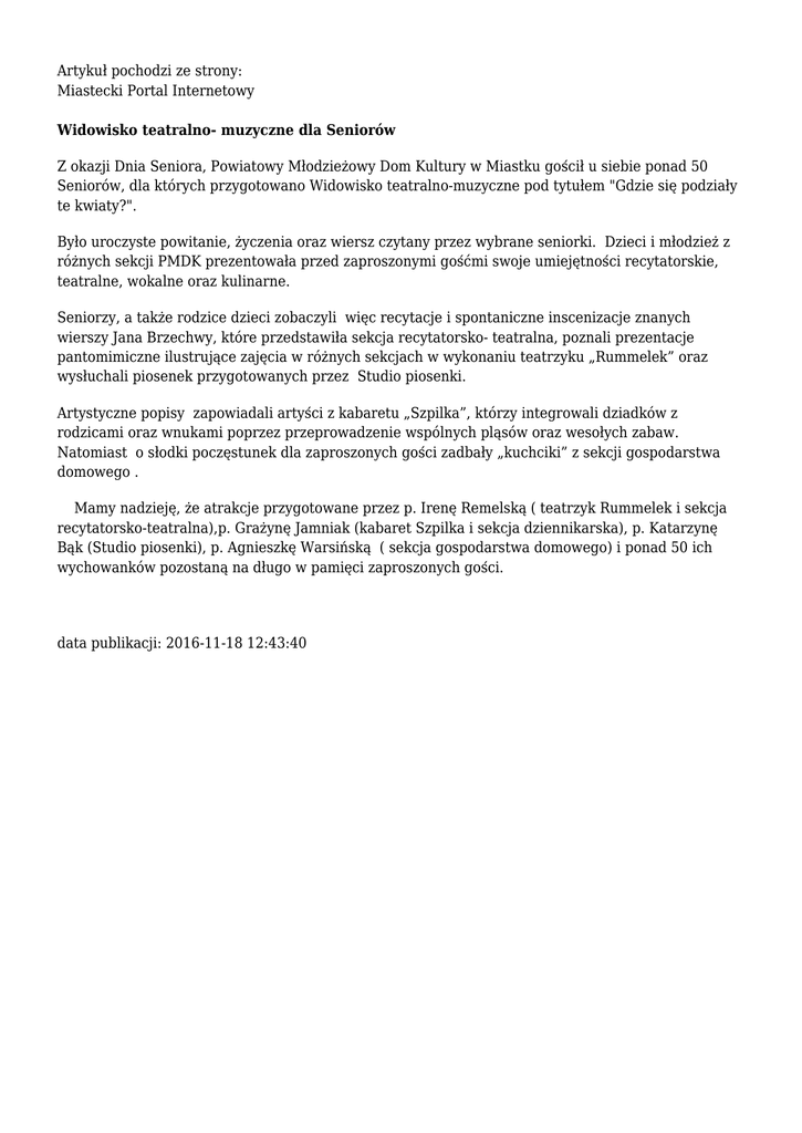 Artykuł pochodzi ze strony: Miastecki Portal Internetowy Widowisko teatralno- muzyczne dla Seniorów Z okazji Dnia Seniora, Powiatowy Młodzieżowy Dom Kultury w Miastku gościł u siebie ponad 50 Seniorów, dla których przygotowano Widowisko teatralno-muzyczne pod tytułem "Gdzie się podziały te kwiaty?". Było uroczyste powitanie, życzenia oraz wiersz czytany przez wybrane seniorki. Dzieci i młodzież z różnych sekcji PMDK prezentowała przed zaproszonymi gośćmi swoje umiejętności recytatorskie, teatralne, wokalne oraz kulinarne. Seniorzy, a także rodzice dzieci zobaczyli więc recytacje i spontaniczne inscenizacje znanych wierszy Jana Brzechwy, które przedstawiła sekcja recytatorsko- teatralna, poznali prezentacje pantomimiczne ilustrujące zajęcia w różnych sekcjach w wykonaniu teatrzyku „Rummelek” oraz wysłuchali piosenek przygotowanych przez Studio piosenki. Artystyczne popisy zapowiadali artyści z kabaretu „Szpilka”, którzy integrowali dziadków z rodzicami oraz wnukami poprzez przeprowadzenie wspólnych pląsów oraz wesołych zabaw. Natomiast o słodki poczęstunek dla zaproszonych gości zadbały „kuchciki” z sekcji gospodarstwa domowego . Mamy nadzieję, że atrakcje przygotowane przez p. Irenę Remelską ( teatrzyk Rummelek i sekcja recytatorsko-teatralna),p. Grażynę Jamniak (kabaret Szpilka i sekcja dziennikarska), p. Katarzynę Bąk (Studio piosenki), p. Agnieszkę Warsińską ( sekcja gospodarstwa domowego) i ponad 50 ich wychowanków pozostaną na długo w pamięci zaproszonych gości. data publikacji: 2016-11-18 12:43:40
