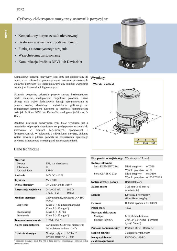 8692 Cyfrowy elektropneumatyczny ustawnik pozycyjny • Kompaktowy korpus ze stali nierdzewnej • Graficzny wyświetlacz z podświetleniem • Funkcja automatycznego strojenia • Wszechstronne zastosowanie • Komunikacja Profibus DPV1 lub DeviceNet Kompaktowy ustawnik pozycyjny typu 8692 jest dostosowany do montażu na siłowniku pneumatycznym zaworów procesowych. Ustawnik pozycyjny jest zaprojektowany, aby spałniał wymagania instalacji w środowiskach higienicznych. Wymiary Ustawnik pozycyjny odczytuje pozycję zaworu bezkontaktowo, dzięki zdalnemu, analogowemu czujnikowi położenia. Łatwa obsługa oraz wybór dodatkowych funkcji oprogramowania za pomocą lokalnej klawiatury i wyświetlacza graficznego lub podłączonego komputera. Dostępne są interfejsy komunikacyjne takie jak Profibus DPV1 lub DeviceNet, analogowe (4-20 mA, 010V). Obudowa ustawnika pozycyjnego typu 8692 wykonana jest z materiałów odpornych chemicznie co predysponuje ustawnik do stosowania w branżach higienicznych, spożywczych i farmaceutycznych. W połączeniu z siłownikami Burkerta, unikalny system zaworu z pilotem pozwala na odzyskiwanie sprężonego powietrza i zabezpiecza wnętrze przed zanieczyszczeniami. Dane techniczne Filtr powietrza wejściowego Wymienny (~0.1 mm) Materiał Korpus Obudowa Uszczelnienie PPS, stal nierdzewna PC EPDM Zasilanie 24 V DC ±10 % Tętnienie Max. 10% Sygnał sterujący 0/4-20 mA i 0 do 5/10 V Rezystancja wejściowa 0/4 do 20 mA: 0 do 5/10 V: Medium sterujące Gazy neutralne, powietrze DIN ISO 8573-1 Klasa 5 (< 40 µm rozmiar pyłu) Klasa 5 (< 10 mg/m3) Klasa 3 (< -20 °C) Klasa 5 (< 25 mg/m3) Zapylenie Kondensacja Naolejenie Rodzaje siłownika Seria ELEMENT 23xx Seria CLASSIC 27xx 180 Ω 19 kΩ Temperatura otoczenia 0 °C do +55 °C Złącza pneumatyczne Gwintowane G1/8” stal nierdzewna lub wciskane (ϕ 6mm i 1/4”) www.burkert-polska.pl Ciśnienie sterujące Niski przepływ: 0-7 bar Wysoki przepływ: 3-7 bar 1) 1) Ciśnienie sterujące musi być 0.5-1 bara powyżej minimalnego ciśnienia pilota siłownika zaworu. Niski przepływ: Wysoki przepływ: Niski przepływ: Wysoki przepływ: ϕ 70/90 ϕ 130 ϕ 80/100 ϕ 125/175/225 System detekcji pozycji Bezkontaktowy Zakres ruchu 3-28 mm (3-45 mm na zamówienie) Montaż Dowolny, preferowany siłownikeim do góry Ochrona IP 65/67 zgodnie z EN 60529 Pobór mocy < 5W Przyłącza elektryczne Multipol Przepust kablowy M12, 8- lub 4-pinowe 2×M16×1.5 (Kabel ϕ 10mm) żyła (1.5 mm2) Protokół komunikacyjny Profibus DPV1, DeviceNet Stopień ochrony 3 zgodnie z VDE 0580 Kompatybilnonść elektromagnetyczna EMV2004/108/EG 8692 Wymiary [mm] Schemat sterowania Pętla sterująca Schemat sterowania ustawnika Typu 8692 Sterowanie analogowe 1) Napięcie zasilające jest niezależne od sygnału sterującego 2) Opcja alternatywna www.burkert-polska.pl Profibus DP/DeviceNet 8692 Tabela zamówieniowa Fu nkcja ste rująca In te rfe js k om un ikacyjny Prz yłącz e e le ktrycz n e S prz ę ż e nie z wrotne S prz ę ż e n ie analogowe + 2 wyjścia cyfrowe We jście cyfrowe Num e r z am ówie n iowy Prz yłącz e G1/8” Prz yłącz e wcisk ane Nie Nie Tak 227 290 227 291 Nie Nie Tak 230 898 227 292 Nie Tak Tak – 236 957 Nie Nie Tak 226 206 227 293 4-20 mA Nie Tak 246 362 227 294 Nie Tak Tak – 227 295 Nie Nie Nie – 227 297 Nie Nie Nie 233 348 227 298 Nie Nie Nie – 227 296 Nie Nie Tak 227 274 227 275 4-20 mA Nie Tak – 227 276 Nie Nie Tak – 227 278 4-20 mA Nie Tak 227 277 227 279 Nie Nie Nie – 227 281 Nie Nie Nie – 227 282 Nie Nie Nie – 227 280 S e ria siłown ików typu 23xx roz m iar siłownik a Ø 70/90 m m Jednostronnego działania, mały przepływ Nie Nie P rofibus DP V1 Kablowe Multipol Multipol DeviceNet Dwustronnego działania, mały przepływ Nie Kablowe Nie Multipol P rofibus DP V1 Multipol DeviceNet S e ria siłown ików typu 23xx roz m iar siłownik a Ø 130 m m Jednostronnego działania, duży przepływ Nie Nie P rofibus DP V1 DeviceNet www.burkert-polska.pl Kablowe Multipol Multipol Nie Nie Tak 227 316 227 317 4-20 mA Nie Tak 233 347 227 318 Nie Nie Tak 245 016 227 319 4-20 mA Nie Tak 246 363 227 320 Nie Tak Tak – 227 321 Nie Nie Nie 231 333 227 323 Nie Nie Nie 233 349 223 777 Nie Nie Nie – 227 322 8692 Tabela zamówieniowa Fu nkcja ste rująca Inte rfe js k om un ikacyjny Prz yłącz e e le k trycz n e S prz ę ż e n ie z wrotne Sprz ę ż e nie an alogowe + 2 wyjścia cyfrowe We jście cyfrowe Nu me r z am ówie n iowy Prz yłącz e G1/8” Prz yłącz e wciskan e S e ria siłown ików typu 27xx roz m iar siłown ika Ø 80/100 m m P ojedynczego działania, niski przepływ ciśnienia Nie Nie Profibus DP V1 Kablowe Multipol Multipol DeviceNet P odwójnego działania, niski przepływ ciśnienia Nie Multipol Profibus DP V1 Kablowe Nie Multipol DeviceNet Nie Nie Tak 227 299 227 302 4-20 mA Nie Tak 227 300 227 303 Nie Tak Tak 227 301 227 305 Nie Nie Tak 227 306 227 309 4-20 mA Nie Tak 227 307 227 310 Nie Tak Tak 227 308 227 311 Nie Nie Nie – 227 313 Nie Nie Nie 247 245 227 312 Nie Nie Tak 227 283 227 284 Nie Tak Tak – 227 285 Nie Nie Tak 227 286 227 287 Nie Tak Tak – 227 288 Nie Nie Nie – 227 586 Nie Nie Nie Nie Tak 227 324 227 327 4-20 mA Nie Tak 227 325 227 328 Nie Tak Tak 227 326 227 329 Nie Nie Tak 227 330 227 333 4-20 mA Nie Tak 227 331 227 334 Nie Tak Tak 227 332 227 335 Nie Nie Nie – 227 336 Nie Nie Nie 239 114 228 231 S e ria siłown ików typu 27xx roz m iar siłown ika Ø 125/175/225 m m P ojedynczego działania, wysoki przepływ ciśnienia Nie Nie Profibus DP V1 DeviceNet www.burkert-polska.pl Kablowe Multipol Multipol Nie