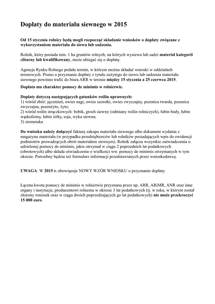 Dopłaty do materiału siewnego w 2015 Od 15 stycznia rolnicy będą mogli rozpocząć składanie wniosków o dopłaty związane z wykorzystaniem materiału do siewu lub sadzenia. Rolnik, który posiada min. 1 ha gruntów rolnych, na których wysiewa lub sadzi materiał kategorii elitarny lub kwalifikowany, może ubiegać się o dopłatę. Agencja Rynku Rolnego podała termin, w którym można składać wnioski w oddziałach terenowych. Pismo o przyznanie dopłaty z tytułu zużytego do siewu lub sadzenia materiału siewnego powinno trafić do biura ARR w terenie między 15 stycznia a 25 czerwca 2015. Dopłata ma charakter pomocy de minimis w rolnictwie. Dopłaty dotyczą następujących gatunków roślin uprawnych: 1) wśród zbóż: jęczmień, owies nagi, owies szorstki, owies zwyczajny, pszenica twarda, pszenica zwyczajna, pszenżyto, żyto; 2) wśród roślin strączkowych: bobik, groch siewny (odmiany roślin rolniczych), łubin biały, łubin wąskolistny, łubin żółty, soja, wyka siewna; 3) ziemniaka Do wniosku należy dołączyć fakturę zakupu materiału siewnego albo dokument wydania z magazynu materiału (w przypadku przedsiębiorców lub rolników posiadających wpis do ewidencji podmiotów prowadzących obrót materiałem siewnym). Rolnik załącza wszystkie zaświadczenia o udzielonej pomocy de minimis, jakie otrzymał w ciągu 2 poprzednich lat podatkowych (obrotowych) albo składa oświadczenie o wielkości ww. pomocy de minimis otrzymanych w tym okresie. Potrzebny będzie też formularz informacji przedstawianych przez wnioskodawcę. UWAGA: W 2015 r. obowiązuje NOWY WZÓR WNIOSKU o przyznanie dopłaty. Łączna kwota pomocy de minimis w rolnictwie przyznana przez np. ARR, ARiMR, ANR oraz inne organy i instytucje, producentowi rolnemu w okresie 3 lat podatkowych (tj. w roku, w którym został złożony wniosek oraz w ciągu dwóch poprzedzających go lat podatkowych) nie może przekroczyć 15 000 euro.