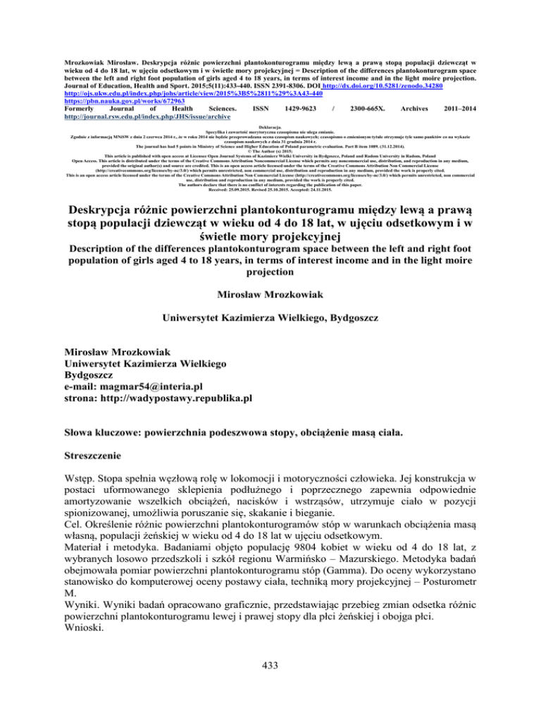 Mrozkowiak Mirosław. Deskrypcja różnic powierzchni plantokonturogramu między lewą a prawą stopą populacji dziewcząt w wieku od 4 do 18 lat, w ujęciu odsetkowym i w świetle mory projekcyjnej = Description of the differences plantokonturogram space between the left and right foot population of girls aged 4 to 18 years, in terms of interest income and in the light moire projection. Journal of Education, Health and Sport. 2015;5(11):433-440. ISSN 2391-8306. DOI http://dx.doi.org/10.5281/zenodo.34280 http://ojs.ukw.edu.pl/index.php/johs/article/view/2015%3B5%2811%29%3A43-440 https://pbn.nauka.gov.pl/works/672963 Formerly Journal of Health Sciences. ISSN 1429-9623 / 2300-665X. Archives 2011–2014 http://journal.rsw.edu.pl/index.php/JHS/issue/archive Deklaracja. Specyfika i zawartość merytoryczna czasopisma nie ulega zmianie. Zgodnie z informacją MNiSW z dnia 2 czerwca 2014 r., że w roku 2014 nie będzie przeprowadzana ocena czasopism naukowych; czasopismo o zmienionym tytule otrzymuje tyle samo punktów co na wykazie czasopism naukowych z dnia 31 grudnia 2014 r. The journal has had 5 points in Ministry of Science and Higher Education of Poland parametric evaluation. Part B item 1089. (31.12.2014). © The Author (s) 2015; This article is published with open access at Licensee Open Journal Systems of Kazimierz Wielki University in Bydgoszcz, Poland and Radom University in Radom, Poland Open Access. This article is distributed under the terms of the Creative Commons Attribution Noncommercial License which permits any noncommercial use, distribution, and reproduction in any medium, provided the original author(s) and source are credited. This is an open access article licensed under the terms of the Creative Commons Attribution Non Commercial License (http://creativecommons.org/licenses/by-nc/3.0/) which permits unrestricted, non commercial use, distribution and reproduction in any medium, provided the work is properly cited. This is an open access article licensed under the terms of the Creative Commons Attribution Non Commercial License (http://creativecommons.org/licenses/by-nc/3.0/) which permits unrestricted, non commercial use, distribution and reproduction in any medium, provided the work is properly cited. The authors declare that there is no conflict of interests regarding the publication of this paper. Received: 25.09.2015. Revised 25.10.2015. Accepted: 24.11.2015. Deskrypcja różnic powierzchni plantokonturogramu między lewą a prawą stopą populacji dziewcząt w wieku od 4 do 18 lat, w ujęciu odsetkowym i w świetle mory projekcyjnej Description of the differences plantokonturogram space between the left and right foot population of girls aged 4 to 18 years, in terms of interest income and in the light moire projection Mirosław Mrozkowiak Uniwersytet Kazimierza Wielkiego, Bydgoszcz Mirosław Mrozkowiak Uniwersytet Kazimierza Wielkiego Bydgoszcz e-mail: [email protected] strona: http://wadypostawy.republika.pl Słowa kluczowe: powierzchnia podeszwowa stopy, obciążenie masą ciała. Streszczenie Wstęp. Stopa spełnia węzłową rolę w lokomocji i motoryczności człowieka. Jej konstrukcja w postaci uformowanego sklepienia podłużnego i poprzecznego zapewnia odpowiednie amortyzowanie wszelkich obciążeń, nacisków i wstrząsów, utrzymuje ciało w pozycji spionizowanej, umożliwia poruszanie się, skakanie i bieganie. Cel. Określenie różnic powierzchni plantokonturogramów stóp w warunkach obciążenia masą własną, populacji żeńskiej w wieku od 4 do 18 lat w ujęciu odsetkowym. Materiał i metodyka. Badaniami objęto populację 9804 kobiet w wieku od 4 do 18 lat, z wybranych losowo przedszkoli i szkół regionu Warmińsko – Mazurskiego. Metodyka badań obejmowała pomiar powierzchni plantokonturogramu stóp (Gamma). Do oceny wykorzystano stanowisko do komputerowej oceny postawy ciała, techniką mory projekcyjnej – Posturometr M. Wyniki. Wyniki badań opracowano graficznie, przedstawiając przebieg zmian odsetka różnic powierzchni plantokonturogramu lewej i prawej stopy dla płci żeńskiej i obojga płci. Wnioski. 433 1. U dziewcząt o większej powierzchni plantokonturogramu lewej stopy odsetki różnic są większe niż u dziewcząt o większej powierzchni plantokonturogramu prawej stopy. 2. Wielkość odsetka różnic powierzchni stóp dziewcząt jest zbliżony do wielkości uzyskanych przez osobników obojga płci do 17 r.ż., dalej następuje gwałtowny wzrost wielkości różnic u osobników obojga płaci, posiadających większą powierzchnię plantokonturogramu lewej stopy. Keywords: plantar surface of the foot, the load weight. Abstract Admission. The rate meets the nodal role in human locomotion and motor skills. Its structure in the form of vault formed longitudinal and transverse provides adequate cushion any load, pressures and shocks, keeps the body in an upright position, to navigate, jumping and running. Objective. To determine the difference in interest plantokonturogram surface under load conditions unladen weight, the female population in age from 4 to 18 years in terms of interest income. Material and methods. The study population consisted of 9804 women aged from 4 to 18 years of randomly selected kindergartens and schools in the region of Warmia - Mazury. The research methodology consisted of measuring the area plantokonturogram feet (Gamma). Was used to evaluate the computed position to assess posture, technique of projection chamber Posturometr M. Results. The results were processed graphically showing the percentage changes of surface differences plantokonturogram left and right foot for female and both sexes. Conclusions. 1. In girls with a larger surface area of the left foot plantokonturogram interest differences are greater than girls of greater area plantokonturogram right foot. 2. The size of the percentage differences in the surface of the feet of girls is similar to the size obtained by individuals of both sexes t