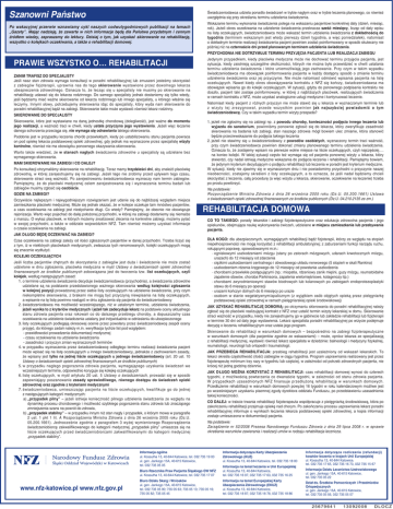 Szanowni Państwo Świadczeniodawca udziela ponadto świadczeń w trybie nagłym oraz w trybie leczenia planowego, co również uwzględnia się przy określaniu terminu udzielenia świadczenia. Po wakacyjnej przerwie wznawiamy cykl naszych codwutygodniowych publikacji na łamach „Gazety”. Mając nadzieję, że zawarte w nich informacje będą dla Państwa przydatnym i cennym źródłem wiedzy, zapraszamy do lektury. Dzisiaj o tym, jak uzyskać skierowanie na rehabilitację, wszystko o kolejkach oczekiwania, a także o rehabilitacji domowej. Wskazanie terminu wykonania świadczenia polega na wskazaniu pacjentowi konkretnej daty (dzień, miesiąc, rok). Jeżeli okres oczekiwania na udzielenie świadczenia przekracza sześć miesięcy, licząc od daty wpisu na listę oczekujących, świadczeniodawca może wskazać termin udzielenia świadczenia z dokładnością do tygodnia (terminem wskazanym jest wtedy pierwszy dzień tygodnia, a więc poniedziałek), natomiast o dokładnym terminie realizacji świadczenia pacjent powinien zostać poinformowany w sposób skuteczny nie później niż na czternaście dni przed planowanym terminem udzielenia świadczenia. PRZYCHODNIA NIE DOTRZYMUJE TERMINU PRZYJĘCIA PACJENTA LUB REALIZACJI ZABIEGU PRAWIE WSZYSTKO O… REHABILITACJI ZANIM TRAFISZ DO SPECJALISTY Jeśli nasz stan zdrowia wymaga konsultacji w poradni rehabilitacyjnej lub zmuszeni jesteśmy skorzystać z zabiegów fizjoterapii, uprawnia nas do tego skierowanie wystawione przez dowolnego lekarza ubezpieczenia zdrowotnego. Oznacza to, że lecząc się u specjalisty nie musimy po skierowanie na rehabilitację udawać się do lekarza rodzinnego. Do samego specjalisty jednak dostaniemy się tylko wtedy, jeśli będziemy mieć ważne skierowanie od lekarza rodzinnego lub innego specjalisty, u którego właśnie się leczymy. Innymi słowy, potrzebujemy skierowania idąc do specjalisty, który wyda nam skierowanie do poradni rehabilitacyjnej bądź na zabiegi. Skierowanie takie może wystawić również lekarz rodzinny. SKIEROWANIE DO SPECJALISTY Skierowanie, które jest wystawiane na daną jednostkę chorobową (dolegliwość), jest ważne do momentu jego realizacji, a ważność traci w chwili, kiedy ustała przyczyna jego wystawienia. Jeżeli więc leczenie danego schorzenia przeciąga się, nie wymaga się odnawiania takiego skierowania. Podobnie jest w przypadku leczenia chorób przewlekłych, kiedy po ustabilizowaniu stanu pacjenta powraca on pod opiekę lekarza podstawowej opieki zdrowotnej, gdy jednak ma wyznaczone przez specjalistę wizyty kontrolne, również nie ma obowiązku ponownego okazywania skierowania. Warto także wiedzieć, że w stanach nagłych świadczenia zdrowotne u specjalisty są udzielane bez wymaganego skierowania. MAM SKIEROWANIE NA ZABIEGI I CO DALEJ? Po konsultacji otrzymaliśmy skierowanie na rehabilitację. Teraz mamy trzydzieści dni, aby znaleźć placówkę zdrowotną, w której zarejestrujemy się na zabiegi. Jeżeli tego nie zrobimy przed upływem tego czasu, skierowanie straci swą ważność. Po zarejestrowaniu świadczeniodawca wyznaczy nam termin zabiegów. Pamiętajmy, że do placówki medycznej celem zarejestrowania się i wyznaczenia terminu badań lub zabiegów musimy zgłosić się osobiście. GDZIE NA ZABIEGI? Oczywiście najlepszym i najwygodniejszym rozwiązaniem jest udanie się do najbliższej względem miejsca zamieszkania placówki medycznej. Może się jednak okazać, że w kolejce oczekuje tam mnóstwo pacjentów, a czas oczekiwania na zabiegi jest niesłychanie długi. Co wtedy? Pamiętajmy, że obecnie nie obowiązuje rejonizacja. Warto więc pojechać do dalej położonej przychodni, w której na zabiegi dostaniemy się niemalże z marszu. O wykaz placówek, w których możemy zrealizować zlecenia na konkretne zabiegi, możemy pytać w swojej przychodni, a także w oddziale wojewódzkim NFZ. Tam również możemy uzyskać informacje o czasie oczekiwania na zabiegi. Jedynym przypadkiem, kiedy placówka medyczna może nie dochować terminu przyjęcia pacjenta, jest sytuacja, kiedy zaistnieją szczególne okoliczności, których nie można było przewidzieć w chwili ustalania terminu udzielenia świadczenia i które uniemożliwiają jego zachowanie. Przy czym w takim wypadku świadczeniodawca ma obowiązek poinformowania pacjenta w każdy dostępny sposób o zmianie terminu udzielenia świadczenia oraz jej przyczynie. Nie może natomiast odmówić wpisania pacjenta na listę oczekujących. Nawet kiedy okres obowiązywania kontraktu z NFZ się kończy, świadczeniodawca ma obowiązek wpisania go do kolejki oczekujących. W sytuacji, gdyby do ponownego podpisania kontraktu nie doszło, pacjent taki zostaje poinformowany, w której z najbliższych placówek, realizujących świadczenia w ramach kontraktu z NFZ, może uzyskać analogiczne usługi medyczne i kontynuować leczenie. Natomiast kiedy pacjent z różnych przyczyn nie może stawić się u lekarza w wyznaczonym terminie lub z wizyty tej zrezygnował, przede wszystkim powinien jak najszybciej powiadomić o tym świadczeniodawcę. Czy w takim wypadku termin wizyty przepada? 1. jeżeli nie zgłosimy się na zabiegi np. z powodu choroby, konieczności podjęcia innego leczenia lub wyjazdu do sanatorium, powinniśmy ponownie zgłosić się do lekarza, który zweryfikuje zasadność skierowania na badania lub zabiegi, stan naszego zdrowia mógł bowiem ulec zmianie, która stanowić będzie przeciwwskazanie do podjęcia takiego leczenia 2. jeżeli nie stawimy się u świadczeniodawcy z powodów osobistych, wyznaczony termin traci ważność, przy czym świadczeniodawca powinien dokonać zmiany planowanego terminu udzielenia świadczenia. Oznacza to, że zostajemy wpisani na pierwsze wolne miejsce na liście oczekujących, czyli najczęściej…. na koniec kolejki. W takiej sytuacji często też wymaga się od pacjenta ponownej wizyty u lekarza, który stwierdzi, czy nadal istnieją medyczne