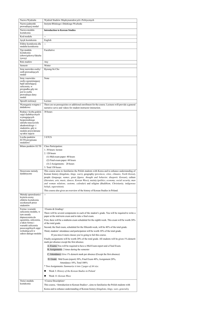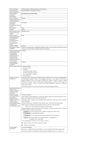 Nazwa Wydziału Wydział Studiów Międzynarodowych i Politycznych Nazwa jednostki prowadzącej moduł Instytut Bliskiego i Dalekiego Wschodu Nazwa modułu kształcenia Introduction to Korean Studies Kod modułu -- Język kształcenia English Efekty kształcenia dla modułu kształcenia -- Typ modułu kształcenia (obowiązkowy/fakulta tywny) Facultative Rok studiów Any Semestr Winter Imię nazwisko osoby/ osób prowadzących moduł Byoung-Se Cho Imię i nazwisko osoby egzaminującej bądź udzielającej zaliczenia, w przypadku gdy nie jest to osoba prowadząca dany moduł None Sposób realizacji Lecture Wymagania wstępne i dodatkowe There are no prerequisites or additional enrollment for the course. Lectures will provide a general narrative serve and videos for student-instructor interaction. Rodzaj i liczba godzin zajęć dydaktycznych wymagających bezpośredniego udziału nauczyciela akademickiego i studentów, gdy w module przewidziane są takie zajęcia 30 hours Liczba punktów ECTS przypisana modułowi 3 ETCS Bilans punktów ECTS Class Participation: 1. 30 hours: lecture 2. 120 hours (1) Mid-exam paper: 40 hours (2) Final-exam paper: 60 hours (3) 2 Assignments: 20 hours 3. Total 150 hours Stosowane metody dydaktyczne This course aims to familiarize the Polish students with Korea and to enhance understanding of Korean history (kingdoms, kings, wars), geography (provinces, cities, climates, North Korea), people (language, names, great figures, thought and behavior, diasporic Korean), culture (literature, arts, music, dances, Korean Wave), society (politics, economy, social security, man and woman relations, customs, calendar) and religion (Buddhism, Christianity, indigenous beliefs, superstition). This course also gives an overview of the history of Korean Studies in Poland. Metody sprawdzania i kryteria oceny efektów kształcenia uzyskanych przez studentów -- Forma i warunki zaliczenia modułu, w tym zasady dopuszczenia do egzaminu, zaliczenia, a także forma i warunki zaliczenia poszczególnych zajęć wchodzących w zakres danego modułu <Exams & Grading> There will be several components to each of the student’s grade. You will be required to write a paper at the mid-term exam and to take a final exam. First, there will be a midterm exam scheduled for the eighth week. This exam will be worth 30% of the total grade. Second, the final exam, scheduled for the fifteenth week, will be 40% of the total grade. Third, students’ attendance and participation will be worth 10% of the total grade. If you miss 6 more classes you’re going to fail this course. Finally assignments will be worth 20% of the total grade. All students will be given 1% demerit mark per absence except the first absence. A. Exams: You will be required to have a Mid Exam-report and a Final Exam. B. Assignments: 2 times during the semester C. Attendance: Give 1% demerit mark per absence (Except the first absence) D. Grade: Mid Exam (report) 30%, Final Exam 40%, Assignment 20%, Attendance 10%, Total 100% * Two Assignments: Summarize it into 2 pages of A4 size. Treści modułu kształcenia Week 3: History of the Korean Studies in Poland Week 11: Korean Wave <Course Description> This course, <Introduction to Korean Studies>, aims to familiarize the Polish students with Korea and to enhance understanding of Korean history (kingdoms, kings, wars, generals), geography (provinces, cities, climates, North Korea), people (language, names, great figures, thought and behavior, diasporic Korean), culture (literature, arts, music, dances, Korean Wave), society (politics, economy, social security, man and woman relations, customs, calendar) and religion (Buddhism, Christianity, indigenous beliefs, superstition). This course also gives an overview of the history of Korean Studies in Poland. <Week Topics> Week 1: (1) Orientation: Video, PPT (2) Overview of the Korean Studies (3) History of Korean Studies in Poland Week 2: Korean History-1 (Gojoseon, Three Kingdoms, Balhae) Week 3: Korean History-2 (Goryeo, Joseon, Japanese colony, South & North Korea) <Assignment I>: History of the Korean Studies in Poland Week 4: Korean Geography (provinces, cities, climates, North Korea), Week 5: Korean Language-1: http://en.wikipedia.org/wiki/Korean_language Week 6: Korean Language-2: http://en.wikipedia.org/wiki/Korean_language Week 7: Koreans (names, thought and behavior, diasporic Korean) Week 8: Mid Exam (Report, A4, 2 pages): Differences between South Korea and North Korea Week 9: Great Koreans (Kings, Generals, Women, Painters) Week 10: Korean Culture-1 (literature, fine arts) Week 11: Korean Culture-2 (music, dances, Korean Wave) <Assignment II>: Korean Wave Week 12: Korean Economy Week 13: Korean Society-1 (politics, social security, customs, calendar) Week 14: Korean Society-2 (man and woman relations, generation gap) Week 15: Korean Religion (Buddhism, Christianity, indigenous beliefs, superstition) Week 16: Final Exam: Differences between Korean Society and Polish Society Wykaz literatury podstawowej i uzupełniającej, obowiązującej do zaliczenia danego modułu <Textbook> 1. Bae, Kichan. Korea at the Crossroads: The History and Future of East Asia. Seoul: Happy Reading, 2007. <References> 1. Gieysztor, Alexander, Historical Similarities of Korea and Poland, Korea Observer 25:3 (Autumn 1994): 421-428. 2. Ahn, Byung-ook, Dominant Ideologies and Thoughts that Shaped Korean History, Korea Journal 43:4 (Winter 2003): 5-9. 3. Baik, Sun-Ki. "A Critical Reflection on 'Song of Arirang.'", The Journal of Modern Korean Studies 5 (August 1993): 1-24. 4. Baker, Don. “Introduction.” In Robert E. Buswell Jr., ed. Religions of Korea in Practice. Princeton, NJ: Princeton University Press, 2007. 5. Chin, Hong-Sop, et al. Cultural Treasures of Korea. Elizabeth, NJ: Hollym International Corp., 1993. 6. Chun, Hae-Jong. "Korean Attitudes Toward Foreigners in Earlier Times." Seoul: National Academy of Sciences, Republic of Korea, 1976. 7. Connor