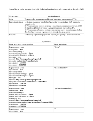 Specyfikacja testów akceptacyjnych dla funkcjonalności związanych z pobieraniem danych z SVN Nazwa testu Opis testGetBranch Test sprawdza poprawnosc pobierania branch'a z repozytorium SVN. Procedura testowa 1. Zostaje utworzony obiekt konfiguracyjny repozytorium SVN z danych wejsciowych. 2. Pobrana zostaje historia projektu z skonfigurowanego repozytorium SVN. 3. Z pobranej historii projektu wyciagnieta zostaje nazwa branch'a. 4. Pobrana nazwa brancha zostaje porownana z nazwa brancha odpowiednia dla skonfigurowanego repozytorium, która jest z gory znana. Rezultat Test zostaje wykonany poprawnie. Wynik jest zgodny z przewidywaniami. Wynik testu Dane wejsciowe - repozytorium Dane wyjsciowe Reposvnpass - pass reposvnuser - user repofileseparator - / reposrcpathpostfixregex - .java reposrcpathprefixregex - .*/java/ repotype - svn repourl - http://svn.apache.org/repos/asf/ repopath - subversion/branches/1.6.x repostartrev - 1306700 repoendrev - 1306720 “1.6.x” Reposvnpass - pass reposvnuser - user repofileseparator - / reposrcpathpostfixregex - .java reposrcpathprefixregex - .*/java/ repotype - svn repourl - http://svn.apache.org/repos/asf/ repopath - /subversion/branches/1.7.x-r1659867 repostartrev - 1306700 repoendrev - 1306720 “1.7.x-r1659867” Reposvnpass - pass “python-3-compatibility” reposvnuser - user repofileseparator - / reposrcpathpostfixregex - .java reposrcpathprefixregex - .*/java/ repotype - svn repourl - http://svn.apache.org/repos/asf/ repopath - /subversion/branches/python-3-compatibility repostartrev - 1306700 repoendrev - 1306720 Reposvnpass - pass reposvnuser - user “” repofileseparator - / reposrcpathpostfixregex - .java reposrcpathprefixregex - .*/java/ repotype - svn repourl - http://svn.apache.org/repos/asf/ repopath - subversion/trunk/ repostartrev - 1306700 repoendrev - 1306720 Nazwa testu Opis testGetTag Test sprawdza poprawnosc pobierania tag'a z repozytorium SVN. Procedura testowa 1. Zostaje utworzony obiekt konfiguracyjny repozytorium SVN z danych wejsciowych. 2. Pobrana zostaje historia projektu z skonfigurowanego repozytorium SVN. 3. Z pobranej historii projektu wyciagnieta zostaje nazwa tag'a. 4. Pobrana nazwa taga zostaje porownana z nazwa taga odpowiednia dla skonfigurowanego repozytorium, która jest z gory znana. Rezultat Test zostaje wykonany poprawnie. Wynik jest zgodny z przewidywaniami. Wynik testu Reposvnpass - pass reposvnuser - user repofileseparator - / reposrcpathpostfixregex - .java reposrcpathprefixregex - .*/java/ repotype - svn repourl - http://svn.apache.org/repos/asf/ repopath - subversion/tags/0.10.2/ repostartrev - 1306700 repoendrev - 1306720 “0.10.2” Reposvnpass - pass reposvnuser - user repofileseparator - / reposrcpathpostfixregex - .java reposrcpathprefixregex - .*/java/ repotype - svn repourl - http://svn.apache.org/repos/asf/ repopath - subversion/tags/1.1.0-rc2/ repostartrev - 1306700 repoendrev - 1306720 “1.1.0-rc2” Reposvnpass - pass reposvnuser - user repofileseparator - / reposrcpathpostfixregex - .java reposrcpathprefixregex - .*/java/ repotype - svn “1.9.0-beta1” repourl - http://svn.apache.org/repos/asf/ repopath - subversion/tags/1.9.0-beta1/ repostartrev - 1306700 repoendrev - 1306720 Reposvnpass - pass reposvnuser - user repofileseparator - / reposrcpathpostfixregex - .java reposrcpathprefixregex - .*/java/ repotype - svn repourl - http://svn.apache.org/repos/asf/ repopath - /subversion/trunk repostartrev - 1306700 repoendrev - 1306720 Nazwa testu Opis “” testData Test sprawdza poprawnosc pobierania podstawowych danych na temat rewizji (autor, komentarz, nr rewizji), Procedura testowa 1. Zostaje utworzony obiekt konfiguracyjny repozytorium SVN z danych wejsciowych. 2. Pobrana zostaje historia projektu z skonfigurowanego repozytorium SVN. 3. Z pobranej historii projektu wyciagniete zostaja rewizje na podstawie nazwy pliku. 4. Sprawdzona zostaje jedna z rewizji pod kątem autora, komentarza, daty, nr rewizji itp. Rezultat Test zostaje wykonany poprawnie. Wynik jest zgodny z przewidywaniami. Wynik testu Reposvnpass - pass reposvnuser - user repofileseparator - / reposrcpathpostfixregex - .java reposrcpathprefixregex - .*/java/ repotype - svn repourl - http://svn.apache.org/repos/asf/ repopath – tomcat/trunk/ revisionFileName org.apache.tomcat.util.net.JIoEndpoint repostartrev - 1336800 repoendrev - 1336884 Przykladowa rewizja: Author = markt Data = Thu May 10 23:07:22 CEST 2012 Nr = 1336884 Typ zmiany: „CHANGED_CONTENT” Filename = "org.apache.tomcat.util.net.JioEndpoint" Komentarz = „Fix https://issues.apache.org/bugzilla/show_bug.cgi? id=53063"”