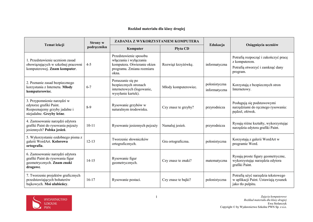 Rozkład materiału dla klasy drugiej Temat lekcji Strony w podręczniku ZADANIA Z WYKORZYSTANIEM KOMPUTERA Płyta CD Komputer Edukacja Osiągnięcia uczniów 4-5 Przedstawienie sposobu włączania i wyłączania komputera. Otwieranie okien programu. Zmiana rozmiaru okna. Rozwiąż krzyżówkę. 2. Poznanie zasad bezpiecznego korzystania z Internetu. Młody komputerowiec. 6-7 Poruszanie się po bezpiecznych stronach internetowych (logowanie, wysyłanie kartek). Młody komputerowiec. 3. Przypomnienie narzędzi w edytorze grafiki Paint. Rozpoznajemy grzyby jadalne i niejadalne. Grzyby leśne. 8-9 Rysowanie grzybów w naturalnym środowisku. Czy znasz te grzyby? przyrodnicza Posługują się podstawowymi narzędziami do ręcznego rysowania: pędzel, ołówek. 4. Zastosowanie narzędzi edytora grafiki Paint do rysowania pejzaży jesiennych? Polska jesień. 10-11 Rysowanie jesiennych pejzaży Namaluj jesień. przyrodnicza Rysują różne kształty, wykorzystując narzędzia edytora grafiki Paint. 5. Wykorzystanie ozdobnego pisma z galerii WordArt. Kolorowa ortografia. 12-13 Tworzenie słowniczków ortograficznych. Gra ortograficzna. polonistyczna Korzystają z galerii WordArt w programie Word. 6. Zastosowanie narzędzi edytora grafiki Paint do rysowania figur geometrycznych. Znam znaki drogowe. 14-15 Rysowanie figur geometrycznych. Czy znasz te znaki? matematyczna Rysują proste figury geometryczne, wykorzystując narzędzia edytora grafiki Paint. 7. Tworzenie projektów graficznych przedstawiających bohaterów bajkowych. Moi ulubieńcy. 16-17 Rysowanie postaci. Czy znasz te bajki? polonistyczna Potrafią użyć narzędzia tekstowego w aplikacji Paint. Ustawiają rysunek jako tło pulpitu. 1. Przedstawienie uczniom zasad obowiązujących w szkolnej pracowni komputerowej. Znam komputer. 1 informatyczna polonistyczna informatyczna Potrafią rozpocząć i zakończyć pracę z komputerem. Potrafią otworzyć i zamknąć dany program. Korzystają z bezpiecznych stron Internetowy. Zajęcia komputerowe Rozkład materiału dla klasy drugiej Ewa Stolarczyk Copyright © by Wydawnictwo Szkolne PWN Sp. z o.o. 8. Poznanie możliwości edytora tekstu Word. Proste formatowanie tekstu. List do Pippi. 18-19 Pisanie listu do Pippi – bohaterki książek Astrid Lingdren Malowanka gramatyczna. polonistyczna Piszą krótki tekst, formatują go. 9. Sprawdzenie swoich umiejętności w liczeniu, korzystając z Kalkulatora. Dobrze liczę! 20-21 Wykonywanie działań matematycznych, korzystając z kalkulatora. Ułóż domino matematyczne. matematyczna Potrafią korzystać z kalkulatora. 10. Zastosowanie narzędzi edytora grafiki Paint – rysowanie plakatu o higienie jamy ustnej. Dbamy o swoje zęby. 22-23 Rysowanie plakatu dotyczącego higieny jamy ustnej. Malowanka ortograficzna. przyrodnicza Rysują różne kształty, wykorzystując narzędzia edytora grafiki Paint. Korzystają z narzędzia Tekst – wstawianie tekstu. 11. Korzystanie z galerii kolorów w edytorze grafiki Paint. Świat w różowych okularach. 24-25 Projektowanie i tworzenie rysunków w różnych odcieniach jednego koloru. Kalejdoskop. plastyczna Posługują się narzędziami do rysowania. Korzystają z Pola koloru, tworzą kolory niestandardowe. 12. Baśnie Andersena – praca w programie graficznym Paint. Baśnie Andersena. 26-27 Projektowanie i tworzenie rysunków – ilustracja do baśni. Czy znasz tę baśń? plastyczna Sprawnie posługują się narzędziami z Przybornika. Zapisują pracę na dysku komputera. 13. Różne rodzaje zegarów – praca w programie graficznym Paint z wykorzystaniem lupy. Czas ucieka. 28-29 Rysowanie różnych zegarów. Rysowanie szczegółów, korzystając z lupy Która godzina? matematyczna Sprawnie posługują się narzędziami z Przybornika. 14. Rysowanie w programie Paint z wykorzystaniem narzędzia Aerograf. Sylwestrowa noc. 30-31 Rysowanie z wykorzystaniem Areografu. Kalendarz. polonistyczna Posługują się narzędziami do rysowania. Korzystają z Aerografu. 32-33 Wyszukiwanie informacji o zwierzętach w zasobach internetowych. Kolorowe zwierzęta. przyrodnicza Wyszukują informacje na stronach internetowych. 15. Poznajemy naszych przyjaciół – zwierzęta. Korzystanie z zasobów internetowych: www.otopjunior.org.pl, www.dzieci.erys.pl, www.muzeum.warszawa.pl Zwierzęta wokół nas. 2 Zajęcia komputerowe Rozkład materiału dla klasy drugiej Ewa Stolarczyk Copyright © by Wydawnictwo Szkolne PWN Sp. z o.o. 16. Poznanie możliwości edytora tekstu Word. Wpisywanie do tabeli nazw rzeczowników. Rzeczowniki. 34-35 Wstawianie tabeli. Rozpoznaj część mowy. polonistyczna Wstawiają tabelę, poruszają się po niej klawiszami strzałkowymi i klawiszem Tabulator. 17. Doskonalenie umiejętności wykorzystania narzędzi edytora grafiki. Sporty zimowe. 36-37 Wykorzystanie narzędzi do rysowania ilustracji. Czy znasz te dyscypliny sportowe? Wychowanie fizyczne Samodzielnie wykonują rysunek, wykorzystując poznane narzędzia z Przybornika. 18. Rysowanie flag państw europejskich. Wykorzystują możliwości programu Paint. Flagi. 38-39 Wstawianie figur geometrycznych. Czy znasz ten kraj? polonistyczna Sprawnie posługują się narzędziami edytora grafiki. 19. Poznanie nowych narzędzi w programie Excel. Łamigłówki. 40-41 Tworzenie różnych zadań, wykorzystując możliwości programy Excel. Łamigłówki (labirynt, kropki). polonistyczna Posługują się nowo poznanymi narzędziami programu Excel. 20. Wykorzystywanie wiadomości zawartych w Internecie. Spotkanie z Chopinem. 42-43 Spotkanie z Chopinem. Ułóż puzzle. muzyczna Potrafią skorzystać z informacji zawartych w zasobach internetowych. Kopiowanie i wklejanie tekstu i zdjęć do dokumentu tekstowego. 21. Doskonalenie umiejętności wykorzystania narzędzi edytora grafiki. Tworzenie plakatu o tematyce ekologicznej. Dbamy o naszą planetę. 44-45 Tworzenie plakatu o tematyce ekologicznej. Zabawy ekologiczne przyrodnicza Posługują się narzędziami z P