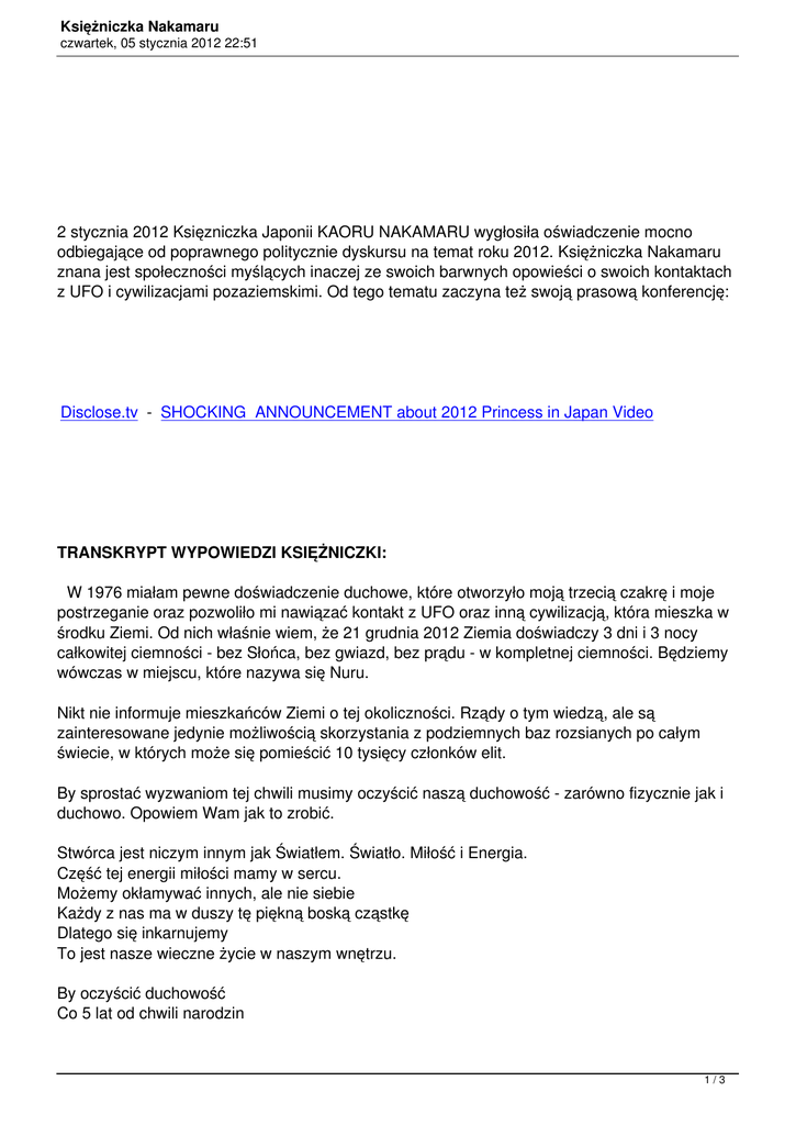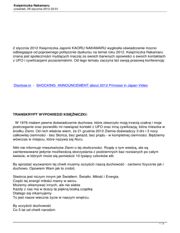 Księżniczka Nakamaru czwartek, 05 stycznia 2012 22:51 2 stycznia 2012 Księzniczka Japonii KAORU NAKAMARU wygłosiła oświadczenie mocno odbiegające od poprawnego politycznie dyskursu na temat roku 2012. Księżniczka Nakamaru znana jest społeczności myślących inaczej ze swoich barwnych opowieści o swoich kontaktach z UFO i cywilizacjami pozaziemskimi. Od tego tematu zaczyna też swoją prasową konferencję: Disclose.tv - SHOCKING ANNOUNCEMENT about 2012 Princess in Japan Video TRANSKRYPT WYPOWIEDZI KSIĘŻNICZKI: W 1976 miałam pewne doświadczenie duchowe, które otworzyło moją trzecią czakrę i moje postrzeganie oraz pozwoliło mi nawiązać kontakt z UFO oraz inną cywilizacją, która mieszka w środku Ziemi. Od nich właśnie wiem, że 21 grudnia 2012 Ziemia doświadczy 3 dni i 3 nocy całkowitej ciemności - bez Słońca, bez gwiazd, bez prądu - w kompletnej ciemności. Będziemy wówczas w miejscu, które nazywa się Nuru. Nikt nie informuje mieszkańców Ziemi o tej okoliczności. Rządy o tym wiedzą, ale są zainteresowane jedynie możliwością skorzystania z podziemnych baz rozsianych po całym świecie, w których może się pomieścić 10 tysięcy członków elit. By sprostać wyzwaniom tej chwili musimy oczyścić naszą duchowość - zarówno fizycznie jak i duchowo. Opowiem Wam jak to zrobić. Stwórca jest niczym innym jak Światłem. Światło. Miłość i Energia. Część tej energii miłości mamy w sercu. Możemy okłamywać innych, ale nie siebie Każdy z nas ma w duszy tę piękną boską cząstkę Dlatego się inkarnujemy To jest nasze wieczne życie w naszym wnętrzu. By oczyścić duchowość Co 5 lat od chwili narodzin 1/3 Księżniczka Nakamaru czwartek, 05 stycznia 2012 22:51 Możemy obejrzeć kondycję naszej świadomości I możemy co 5 lat oczyszczać to, co tego wymaga Przebaczyć i przeprosić tym, którzy nam zrobili krzywdę albo tym których my skrzywdziliśmy Robiąc to powiększamy nasze serce Do którego wkracza złote światło. W ten sposób się oczyszczamy duchowo Fizycznie by się oczyścić musimy na pierwszym miejscu zrezygnować z używania aluminium Puszki aluminiowe to skrajnie toksyczne dla nas naczynia. Potrzebne są praktyki i ćwiczenia codzienne My, ludzkie istoty jesteśmy Światłem i Miłością Mamy w sobie cząstkę Bożą Którą musimy w sobie odnaleźć I to ona się inkarnuje pozostawiając potem ciało a sama odchodzi do domu by żyć tam wiecznie. Znam swoje poprzednie życia na przestrzeni kilku tysięcy lat Także w różnych częściach świata Wspomnienia wróciły Znam języki, których się nie uczyłam Tak więc koncept inkarnacji jest prawdziwy - doświadczyłam tego. Świat się bardzo podzielił. Ogromna przepaść powstała pomiędzy ludźmi, którzy mają taką perspektywę rzeczy, jak opisuję i ludzi, którzy tego w ogóle nie widzą, nie wierzą w tego typu historie albo wręcz pozostaną w energiach ciemności. Ludzie ci narodzą się ponownie na nowej planecie, na nowej Ziemi - już po okresie zawieruchy, wojen i kataklizmów. Tak więc jesteśmy przygotowani do bardzo pięknej konferencji, która będzie miała już niedługo miejsce…. Poza wystąpieniem Księżniczki na filmie jest przekaz jego autora, który - nie przesądzając, czy słowa Księżniczki okażą się prawdą, czy nie - apeluje o pójście drogą, o której Księżniczka mówi, kodyfikując tę drogę jako wybór Miłości. "Uwierz sobie i Stwórcy. Pokochaj siebie i innych. Pamiętaj, że jesteś istotą duchową, która doświadcza fizyczności, a nie istotą fizyczną, która doświadcza duchowości. Obudź się więc, by ludzkość mogła się zjednoczyć I to rozpoczyna się od Ciebie…" 2/3 Księżniczka Nakamaru czwartek, 05 stycznia 2012 22:51 transkrypt by Andreas publikując w sieci podaj stronę źródłową - dziękuję. :) 3/3
