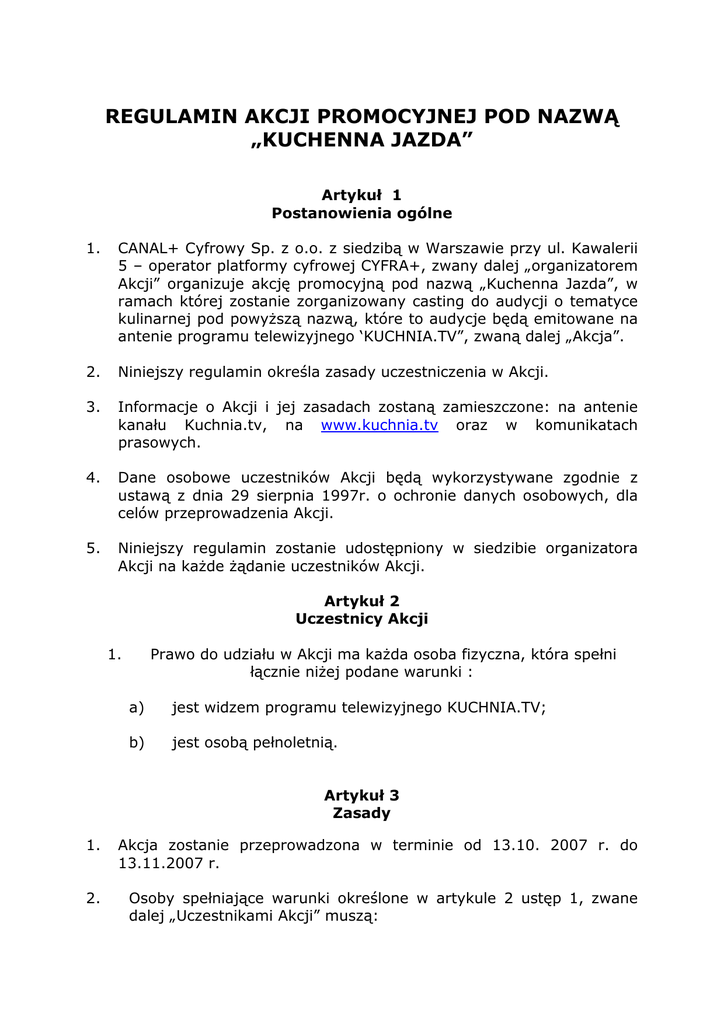 REGULAMIN AKCJI PROMOCYJNEJ POD NAZWĄ „KUCHENNA JAZDA” Artykuł 1 Postanowienia ogólne 1. CANAL+ Cyfrowy Sp. z o.o. z siedzibą w Warszawie przy ul. Kawalerii 5 – operator platformy cyfrowej CYFRA+, zwany dalej „organizatorem Akcji” organizuje akcję promocyjną pod nazwą „Kuchenna Jazda”, w ramach której zostanie zorganizowany casting do audycji o tematyce kulinarnej pod powyŜszą nazwą, które to audycje będą emitowane na antenie programu telewizyjnego ‘KUCHNIA.TV”, zwaną dalej „Akcja”. 2. Niniejszy regulamin określa zasady uczestniczenia w Akcji. 3. Informacje o Akcji i jej zasadach zostaną zamieszczone: na antenie kanału Kuchnia.tv, na www.kuchnia.tv oraz w komunikatach prasowych. 4. Dane osobowe uczestników Akcji będą wykorzystywane zgodnie z ustawą z dnia 29 sierpnia 1997r. o ochronie danych osobowych, dla celów przeprowadzenia Akcji. 5. Niniejszy regulamin zostanie udostępniony w siedzibie organizatora Akcji na kaŜde Ŝądanie uczestników Akcji. Artykuł 2 Uczestnicy Akcji 1. Prawo do udziału w Akcji ma kaŜda osoba fizyczna, która spełni łącznie niŜej podane warunki : a) jest widzem programu telewizyjnego KUCHNIA.TV; b) jest osobą pełnoletnią. Artykuł 3 Zasady 1. Akcja zostanie przeprowadzona w terminie od 13.10. 2007 r. do 13.11.2007 r. 2. Osoby spełniające warunki określone w artykule 2 ustęp 1, zwane dalej „Uczestnikami Akcji” muszą: w terminie od 13.10.2007 r. do 13.11.2007 r. przesłać, za pośrednictwem telefonu komórkowego, krótką wiadomość tekstową (SMS) pod numer 7193. PowyŜsza wiadomość musi zawierać następujące hasło: „JAZDA”; Koszt sms: 1 zł netto, 1,22 zł brutto. - - SMS zostanie zarejestrowany, a Uczestnik Akcji otrzyma SMSa zwrotnego z potwierdzeniem rejestracji oraz z kodem umoŜliwiającym zalogowanie się na stronie www.kuchnia.tv, w celu wypełnienia formularza zgłoszeniowego; - uzupełnić wszystkie rubryki formularza zgłoszeniowego, w tym udzielić zgody na przetwarzanie swoich danych osobowych w zakresie określonym w tym formularzu; - wysłać uzupełniony formularz zgłoszeniowy, za pośrednictwem poczty, na adres: Canal + Cyfrowy/ Kuchnia.tv, ul. Kawalerii 5, 00-468 Warszawa , z dopiskiem na kopercie: Kuchenna Jazda, w terminie do 16.11 2007 r. (decyduje data stempla pocztowego). 3. Wzór formularza zgłoszeniowego, o którym mowa w ustępie poprzedzającym stanowi załącznik do niniejszego regulaminu. 4. Wśród osób, które nadeślą formularze zgłoszeniowe zostanie wybranych przez organizatora Akcji nie więcej niŜ 100 osób, których dane osobowe zostaną przekazane producentowi audycji „Kuchenna Jazda” („Audycje”) w celu przeprowadzenia przez producenta castingu do Audycji, emitowanych na antenie programu telewizyjnego KUCHNIA.TV. 5. Spośród osób, których dane osobowe zostaną przekazane producentowi Audycji, producent, po przeprowadzeniu castingu, wyłoni osoby, które będą uczestniczyły w realizacji poszczególnych Audycji. Zasady uczestnictwa powyŜszych osób w realizacji Audycji zostaną określone w stosownych umowach podpisanych pomiędzy producentem a wybranymi osobami. 6. Kryteria wyboru osób uczestniczących w realizacji Audycji zaleŜą od uznania producenta. 7. Formularze zgłoszeniowe osób, które nie zostały wybrane przez organizatora Akcji, a następnie przez producenta, zostaną komisyjne zniszczone, co potwierdzi stosowny protokół zniszczenia. Warszawa, dnia 13.10. 2007 r.