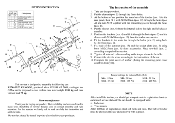 FITTING INSTRUCTION Clamp mark in acc. with ISO PN 1 L 2 + 3 31 4 R 5 58R 6 54 7 58L The instruction of the assembly Cables joining Left directional lights Rear fog lights Ground Right directional lights Right side parking lights Stoplights Left side parking lights 10 11 6 C 4 B 5 9 1 C A B D 8 6 11 4 1. Take out the spare wheel. 2. Put the element (pos. 5) through the fabric holes. 3. At the bottom of car position the main bar of the towbar (pos. 1) to the rear panel, then fit it with M10x90mm (pos. 10) through the holes (pos. A) and nuts M10 together with the connecting pieces through the holes (pos. B). 4. Put the sleeves (pos. 6) from the internal side to the right and left chassis member. 5. Position the brackets (pos. 4) and fit it through the holes (pos. C) and the sleeves with M10x90mm (pos. 10) from the towbar accessories. 6. Fit the brackets to the main bar through the holes (pos. D) using bolts M12x35mm (pos. 9). 7. Fix body of the automat (pos. 18) and the socket plate (pos. 3) using bolts M12x25mm (pos. 8) from accessories. Place tow-ball (pos. 2) according to supplied instruction. 8. Tighten all nuts and bolts according to the torque shown in the table. 9. Connect the electric wires according to the instructions of the car. 10. Complete the paint cover of towbar (during the mounting paint cover could be destroyed). 10 9 D 3 10 7 2 Torque settings for nuts and bolts (8,8): M6 - 11 Nm M8 - 25 Nm M10 - 50 Nm M12 - 87 Nm M14 - 138 Nm M16 - 210 Nm This towbar is designed to assembly in following car: RENAULT KANGOO, produced since 07.1998 till 2008, catalogue no. G27A and is prepared to tow trailers max total weight 1350 kg and max vertical load 75 kg. From manufacturer Thank you for buying our product. Their reliability has been confirmed in many tests. Reliability of towbar depends also on correct assembly and right operation. For this reasons we kindly ask to read carefully this instruction and apply to hints. The towbar should be install in points described by a car producer. NOTE After install the towbar you should get adequate note in registration book (at authorised service station).The car should be equipped with: • Indicators • Tow mirrors After 1000km of exploitation check all bolts and nuts. The ball of towbar must be always kept clear and conserve with a grease. PPUH AUTO-HAK Sp.J. Towbar accessories: Produkcja Zaczepów Kulowych Henryk & Zbigniew Nejman 76-200 SŁUPSK ul. Słoneczna 16K tel/fax (059) 8-414-414; 8-414-413 e-mail: [email protected] www. autohak.com.pl Towing hitch (without electrical set) Class: A50-X Cat. no. G27A Technical data: D-value: 7,7 kN maximum trailer weight: 1350 kg maximum vertical cup load: 75 kg Designed for: Manufacturer: RENAULT Model: KANGOO produced since 07.1998 till 2008 Approval number according to Directive 94/20/EC: e20*94/20*1093*00 Foreword This towbar is designed according to rules of safety traffic regulations. The towing hitch is a safety component and can be install only by qualified personnel. Any alteration or conversion of the towing hitch is prohibited and would lead to cancellation of design certification. Remove insulating compound and underseal from vehicle (if present) in the area of the matting surfaces of the towing hitch. The vehicle manufacturer’s specifications regarding trailer load and max. vertical cup load are decisive for driving, and values for the towing hitch cannot be exceeded. D-value formula: Max trailer weight [kg] x Max trailer weight [kg] + Max vehicle weight [kg] Max vehicle weight [kg] X 9,81 = 1000 D [kN] INSTRUCTION De montage et d’exploitation du dispositif d'attelage à boule Désignation de borne selon la norme ISO PN 1 L 2 3 + 31 4 R 5 6 7 58R 54 58L Connexion des câbles 1. 2. 3. 10 11 Pour indicateurs de direction gauche Feux de brouillard arrière Au poids du véhicule Pour indicateurs de direction droite Feux de circulation droites Pour feux de freinage Feux de circulation gauches Instructions de montage 6 C 4 B 5 9 1 C A B D 8 6 11 4 10 9 D 3 10 7 2 Le dispositif d'attelage à boule est conçu pour être monté dans la voiture: RENAULT KANGOO, produit à partir de 07.1998 au 2008, numéro de catalogue G27A et est utilisé pour tirer des remorques du poids total 1350 kg et de la pression totale sur la boule max 75 kg. Enlever la roue de secours. Mettre le joint (pos.5) dans les trous prépercés. Au dessous de véhicule, placer la poutre principale de l’attelage (pos.1) au panneau arrière, et ensuite serrer à l’aide des vis M10x90mm (pos.10) à travers des trous (pos.A) et à l’aide des écrous M10 à travers des trous (pos.B) avec les appuis. 4. Introduire les douilles d’écartement pos.6 dans les longerons du côté droit et gauche, dans les trous. (du côté inférieur). 5. Placer les appuis latéraux (pos.4) et à travers des trous (pos.C) et à travers des douilles serrer à l’aide des vis M10x90mm (pos.10). 6. Serrer la poutre de l’attelage avec les appuis latéraux à travers des trous (pos.D) à l’aide des vis M12x35mm (pos. 9). 7. Serrer le carter du mécanisme automatique (pos.7) à l’aide des vis M12x25mm (pos.8) avec la tôle sous la prise (pos.3). Fixer la boule conformément aux instructions, jointes au crochet d’attelage avec l’attache facilement démontable. 8. Serrer tous les vis aux couples de serrage, comme indiqué dans le tableau. 9. Connecter les câbles de la prise 7 – à l'installation électrique en conformité avec les instructions d'une usine automobile (recommandé la mise en œuvre d’une station-service autorisée). 10. Remplir des pertes de peinture causées durant l'installation. Couples de serrage recommandé pour les vis et les écrous 8,8: M6 - 11 Nm M 8 - 25 Nm M 10 - 50 Nm M 12 - 87 Nm M 14 - 138 Nm M16 - 210 Nm Attention DE LA PART DU FABRICANT Merci d'avoir choisi le dispositif d'attelage à boule produit par notre société. Son fiabilité a été confirmée dans de nombreux tests et par les opinions des clients