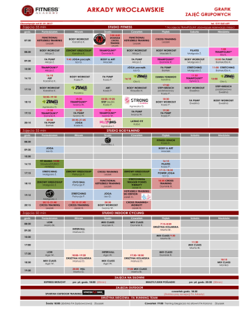ARKADY WROCŁAWSKIE GRAFIK ZAJĘĆ GRUPOWYCH Obowiązuje od 01.01.2017 tel. 519 560 649 STUDIO FITNESS Zajęcia 55 min godz. Poniedziałek 07:30 FUNCTIONAL KETTLEBELS TRAINING Leszek BODY WORKOUT Karolina K. 08:30 BODY WORKOUT Alicja Z. ZDROWY KRĘGOSŁUP Karolina K. 09:30 FA PUMP Alicja Z. 9:45 JOGA początk. Iza G. 10:30 TRAMPOLINY* Alicja Z. 16:15 16:10 ABT Karolina K. 17:15 BODY WORKOUT Karolina K. 18:20-19:10 Karolina Czwartek Piątek FUNCTIONAL KETTLEBELS TRAINING Leszek CROSS TRAINING Leszek TRAMPOLINY* Dominik R. BODY WORKOUT Alicja Z. BODY & ART Maciek 7:00-8:20 SPARTAN CROSS TRAINIG Leszek FA PUMP Kasia P. ABT Kasia P. Dominik R. 20:30 FA PUMP Bartek 20:30-21:45 JOGA Kasia K. Poniedziałek BODY WORKOUT Maciek K. PILATES Małgosia Ż. 9:00 TRAMPOLINY* Ela K. FA PUMP Alicja Z. TRAMPOLINY* Dominik R. BODY WORKOUT Małgosia Ż. 10:00 FA PUMP Bartek/Ela K. JOGA początk. Iza G. FA PUMP Bartek STRETCHING Małgosia Ż. 11:00 STRETCHING Bartek/Ela K. ZUMBA TONING® Karolina Agnieszka G. Agnieszka T. 12:00 Ola S. BODY WORKOUT Ewelina STEP+BRZUCH podstawowy Ewelina 18:30 BODY WORKOUT Kasia P. FA PUMP Ewelina BODY WORKOUT Ewelina Sobota Niedziela Sobota Niedziela 19:30 FA PUMP Kasia P. FA PUMP Iwona W. LATINO FIT Kuba STUDIO BODY&MIND Wtorek Środa Czwartek Piątek FITNESS SENIOR Kasia K. 08:30 Dominika J. JOGA Iza G. BODY & ART Maciek 16:15 FIT MAMA 14:00 Sławka(STUDIO FITNESS) 17:15 STRETCHING Małgosia Ż. ZDROWY KRĘGOSŁUP Patrycja P. 16:15 PILATES Kasia P. 17:15-18:30 POWER JOGA Iza G. 18:15 ZDROWY KRĘGOSŁUP Małgosia Ż. OVO BALL Patrycja P. FUNCTIONAL KETTLEBELS TRAINING Leszek STRETCHING Patrycja P. JOGA Iza G. STRETCHING& TRIGGER POINTS THERAPY Jarek H. KETTLEBELS TRAINING SKI EDITION Jarek H. 20:15-21:40 CROSS TRAINING Jarek H. 20:30 BODY WORKOUT Iwona W. CROSS TRAINING+ MOBILITY Jarek H. 09:30 11:30 TRAMPOLINY* Sylwia S. 17:30 STEP+BRZUCH podstawowy Kasia P. BODY WORKOUT Klaudia H. 19:30 TRAMPOLINY* Iwona W. 20:30 Zajęcia 55 min godz. Niedziela Ola S. 19:30 FA PUMP Iwona W. 19:30 TRAMPOLINY* Sobota 16:10 18:30-19:20 STEP średni Kasia P. Agnieszka G. 20:15 BODY WORKOUT Kasia P. Środa 18:30 TRAMPOLINY* Iwona W. 18:15 19:15 Wtorek * Na zajęcia TRAMPOLINY obowiązuje rezerwacja miejsc! 10:30 19:15 20:15 Małgosia J. 20:15-21:40 CROSS TRAINING Leszek Poniedziałek 08:30 LOW Marta Br. Leszek ZDROWY KRĘGOSŁUP Jarek H. Wtorek Środa Czwartek MIX CLASS Maciek K. MIX CLASS Dominik R. Piątek 7:15-8:50 DRUŻYNA KOLARSKA Marta Br. INTERVALL Mariusz D. 09:30 18:30 CROSS TRAINING Dominik R. STUDIO INDOOR CYCLING Zajęcia 50 min godz. CROSS TRAINING MIX CLASS 9:30 Marta Br. 10:30 11:30 MIX CLASS Marta Bi. 17:00 17:30 LOW Aga W. 18:30 MIX CLASS Aga W. 18:00-19:20 DRUŻYNA KOLARSKA Mariusz D. INTERVALL Aga W. MIX CLASS Aga W. 20:00 HILL Marta G. 19:30 17:30-18:50 DRUŻYNA KOLARSKA Mariusz D. MIX CLASS Dominik R. 18:15 MIX CLASS Monika 19:00 MIX CLASS Marta Br. ZAJĘCIA NA SIŁOWNI EXPRESS BRZUCHY pn- pt, godz. 18:00 (20min) BRAZYLYJSKIE POŚLADKI pn- pt, godz. 20:30 (30min) ZAJĘCIA OUTDOOR czwartek godz. 18:30 (Zbiórka przy recepcji FA Arkady) SPARTAN OUTDOOR TRAINING DRUŻYNA BIEGOWA- FA RUNNING TEAM Środa 18:00 (zbiórka FA Szybowcowa) Zbyszek Czwartek 19:00 Trening biegacza na siłowni FA Korona Zbyszek ZAJĘCIA WZMACNIAJĄCE ABT ARKADY WROCŁAWSKIE BODY & ART Trening szczególnie ukierunkowany na kształtowanie dolnych partii ciała (brzuch, pośladki, uda). ABT to jednocześnie trening wprowadzający i przygotowujący organizm do wysiłku fizycznego (układ sercowo-naczyniowy, mięśniowy i kostno-więzadłowy). Podczas zajęć skupiamy się na nauce kroków podstawowych (wydłużona rozgrzewka), technice wykonywania podstawowych ćwiczeń wzmacniających (będących niezbędnym elementem wprowadzającym do efektywnego treningu fitness). Koncentracja podczas treningu na pracy dolnych partii ciała, da efekt jędrnych pośladków, zgrabnych nóg i smukłej talii. Zajęcia dla wszystkich. ZAJĘCIA BODY & MIND GRAFIK ZAJĘĆ GRUPOWYCH Współczesna fitness`owa odmiana jogi. Body & ART łączy w sobie elementy jogi, fizjoterapii, elementów Pilates oraz klasycznych technik oddechowych. Celem ćwiczeń jest stopniowe zapewnianie odpowiedniego funkcjonowania całego ciała, poprzez wzmocnienie i stabilizację wszystkich mięśni zaangażowanych w ruch. Zwiększona świadomość i celowe wdrażanie oddychania przynoszą ciału relaks w trakcie ćwiczenia jak i po jego zakończeniu. Lekcja przeznaczona dla osób aktywnych, chcących zadbać o swoją sylwetkę, a jednocześnie uzyskać wszystkie zdrowotne i relaksujące efekty praktyki jogi. W zależności od zaawansowania grupy, dzielimy zajęcia na poziom początkujący i zaawansowany. BODY WORKOUT PILATES Wszechstronny trening wzmacniający i kształtujący całe ciało. Podczas treningu bazujemy na podstawowych ćwiczeniach, które stopniowo ( poziomami) przekształcamy w bardziej złożone kombinacje, angażujących coraz to więcej grup mięśniowych. Płynność łączenia ćwiczeń, oraz niejednokrotnie praca oparta na treningu interwałowym stawia wyzwanie dla układów krążenia i oddechowego. Dzięki takiemu połączeniu trening doskonałe wyszczupla, kształtuje piękną i smukłą sylwetkę. Stosowanie dodatkowego sprzętu (stepy, hantle, gumy oporowe) lub odpowiednich skurczów mięśniowych, zwiększa zaangażowanie mięśni głębokich. Doskonały trening stanowiący kolejny poziom po zajęciach ABT. Polecany dla wszystkich. System ćwiczeń opracowany przez Josepha Pilatesa, obejmujący harmonijną współpracę umysłu i ciała, jako skuteczny sposób na płaski brzuch, mocniejsze plecy i szczupłą sylwetkę. Doskonały trening dla osób z bólami kręgosłupa. Zajęcia polegają na wykonywaniu serii ruchów w sposób płynny i kontrolowany, przy jednoczesnym angażowaniu ciała i umysłu. Pilates nie tylko poprawia sylwetkę, lecz także zwiększa elastyczność ciała. Pomaga przywrócić naturalną równowagę w 