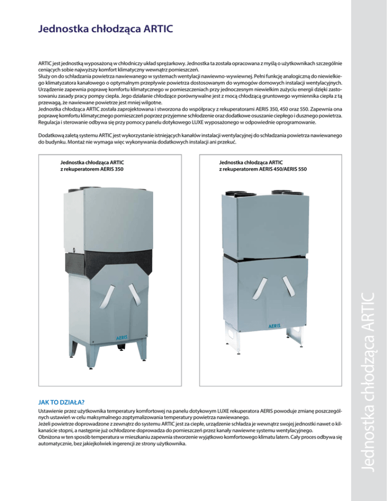 Jednostka chłodząca ARTIC ARTIC jest jednostką wyposażoną w chłodniczy układ sprężarkowy. Jednostka ta została opracowana z myślą o użytkownikach szczególnie ceniących sobie najwyższy komfort klimatyczny wewnątrz pomieszczeń. Służy on do schładzania powietrza nawiewanego w systemach wentylacji nawiewno-wywiewnej. Pełni funkcję analogiczną do niewielkiego klimatyzatora kanałowego o optymalnym przepływie powietrza dostosowanym do wymogów domowych instalacji wentylacyjnych. Urządzenie zapewnia poprawę komfortu klimatycznego w pomieszczeniach przy jednoczesnym niewielkim zużyciu energii dzięki zastosowaniu zasady pracy pompy ciepła. Jego działanie chłodzące porównywalne jest z mocą chłodzącą gruntowego wymiennika ciepła z tą przewagą, że nawiewane powietrze jest mniej wilgotne. Jednostka chłodząca ARTIC została zaprojektowana i stworzona do współpracy z rekuperatorami AERIS 350, 450 oraz 550. Zapewnia ona poprawę komfortu klimatycznego pomieszczeń poprzez przyjemne schłodzenie oraz dodatkowe osuszanie ciepłego i dusznego powietrza. Regulacja i sterowanie odbywa się przy pomocy panelu dotykowego LUXE wyposażonego w odpowiednie oprogramowanie. Dodatkową zaletą systemu ARTIC jest wykorzystanie istniejących kanałów instalacji wentylacyjnej do schładzania powietrza nawiewanego do budynku. Montaż nie wymaga więc wykonywania dodatkowych instalacji ani przekuć. Jednostka chłodząca ARTIC z rekuperatorem AERIS 450/AERIS 550 Jak to działa? Ustawienie przez użytkownika temperatury komfortowej na panelu dotykowym LUXE rekuperatora AERIS powoduje zmianę poszczególnych ustawień w celu maksymalnego zoptymalizowania temperatury powietrza nawiewanego. Jeżeli powietrze doprowadzone z zewnątrz do systemu ARTIC jest za ciepłe, urządzenie schładza je wewnątrz swojej jednostki nawet o kilkanaście stopni, a następnie już ochłodzone doprowadza do pomieszczeń przez kanały nawiewne systemu wentylacyjnego. Obniżona w ten sposób temperatura w mieszkaniu zapewnia stworzenie wyjątkowo komfortowego klimatu latem. Cały proces odbywa się automatycznie, bez jakiejkolwiek ingerencji ze strony użytkownika. Jednostka chłodząca ARTIC Jednostka chłodząca ARTIC z rekuperatorem AERIS 350 Wymiary zestawu ARTIC z rekuperatorem AERIS 350 wysokość: 1848 mm, szerokość: 725 mm, głębokość: 556 mm. Wymiary zestawu ARTIC z rekuperatorem AERIS 450/AERIS 550 wysokość: 1735 mm, szerokość: 725 mm, głębokość: 556 mm. Informacje ogólne • jednostka chłodząca wyposażona w pompę ciepła • zintegrowany system chłodzący • czynnik chłodniczy: R134a (0,2 m3; 0,5 kg) • rozwiązanie zapewniające obniżenie temperatury powietrza nawiewanego oraz obniżenie nadmiernej wilgotności w budynku • niskie zużycie energii • połączenie z rekuperatorem AERIS za pomocą adaptera. PROGRAMOWANIE Jednostka chłodząca ARTIC Programowanie urządzenia odbywa się poprzez sterownik LUXE rekuperatora. DANE TECHNICZNE: Obudowa:................................................................................................................................................ metalowa płyta uszczelniająca malowana proszkowo Panel frontowy: ......................................................................................................................kompozytowy Sterowanie................................................................................................................................ panel LUXE Parametry elektyczne: Zasilanie..................................................................................................................................... 230V/50Hz. Pobór prądu (normalny):..................................................................................................... 4,7 A Pobór prądu (maksymalny):............................................................................................... 5,5 A Współczynnik mocy cos α:.................................................................................................0,75 Pobór mocy (normalny):...................................................................................................... 0,80 kW Pobór mocy (maksymalny):................................................................................................ 0,95 kW Parametry jednostki chłodzącej ARTIC 350 w połączeniu z rekuperatorem AERIS 350: Wydajność zestawu:.............................................................................................................. 300 m3/h Moc chłodnicza:...................................................................................................................... 1,8 kW Pobór mocy przez ARTIC:.................................................................................................... 0,83 kW COP (sprawność):....................................................................................................................2,2 Parametry jednostki chłodzącej ARTIC 550 w połączeniu z rekuperatorem AERIS 450/AERIS 550: Wydajność zestawu:.............................................................................................................. 500 m3/h Moc chłodnicza:...................................................................................................................... 2,3 kW Pobór mocy przez ARTIC:.................................................................................................... 0,76 kW COP (sprawność):....................................................................................................................3,0 SCHEMAT I ZASADA DZIAŁANIA Jednostka ARTIC wyposażona jest w skompresowany system chłodzenia. Elektrycznie załączany kompresor P tłoczy czynnik chłodniczy od skraplacza L przez rurkę kapilary K i parownik M i powraca do skraplacza. W skraplaczu L czynnik chłodniczy przechodzi z formy gazowej w płynną (skraplanie). Przy skraplaniu uwalnia się energia cie