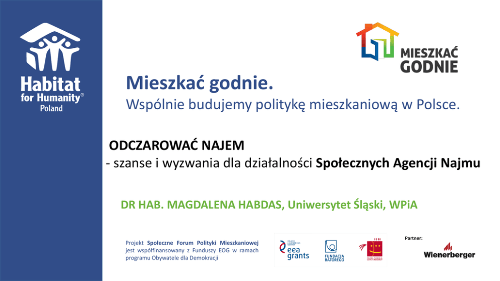 Mieszkać godnie. Wspólnie budujemy politykę mieszkaniową w Polsce. ODCZAROWAĆ NAJEM - szanse i wyzwania dla działalności Społecznych Agencji Najmu DR HAB. MAGDALENA HABDAS, Uniwersytet Śląski, WPiA Projekt Społeczne Forum Polityki Mieszkaniowej jest współfinansowany z Funduszy EOG w ramach programu Obywatele dla Demokracji Partner: Problematyczny rynek mieszkaniowy - Rynek polski – deficyt mieszkaniowy, wieloletnie promowanie własności jako sposobu zaspokajania potrzeb mieszkaniowych, wspieranie nabywania własności przez młodych (Rodzina na Swoim /2007-2013/; Mieszkanie dla Młodych /od 2014/). - TBS’y –pozytywnie oceniane w Polsce i zagranicą, lecz przerwa w finansowaniu, naciski na wykup mieszkań, problematyczne uzasadnienie partycypacji, - Nieświadoma segregacja najemców – najemcy socjalni, komunalni, z TBS’ów: dość konsekwentny podział według dochodów, niezamierzona gettoizacja/gentryfikacja Projekt Społeczne Forum Polityki Mieszkaniowej jest współfinansowany z Funduszy EOG w ramach programu Obywatele dla Demokracji Partner: Problematyczny rynek mieszkaniowy - Mało rozwinięty rynek prywatny najmu - Uprzedzenia wynajmujących i najemców: często podyktowane doświadczeniami historycznymi, lecz także wynikające z silnej ochrony praw lokatora, przy utrudnionym egzekwowaniu praw wynajmujących (nieefektywność postępowań sądowych, brak przyspieszonych trybów, szybkich sądów w sprawach lokatorskich) - Konieczność promowania innych sposobów zaspokajania potrzeb mieszkaniowych: – nie tylko własność, nie zawsze własność Projekt Społeczne Forum Polityki Mieszkaniowej jest współfinansowany z Funduszy EOG w ramach programu Obywatele dla Demokracji Partner: Problematyczny rynek mieszkaniowy - ODCZAROWANIE NAJMU – stworzenie gwarancji prawidłowego wykonywania umowy - minimalizowanie ryzyka dla wynajmującego (otrzymywanie czynszu, prawidłowe użytkowanie mieszkania) i najemcy (trwałość/bezpieczeństwo najmu, ochrona prywatności/miru domowego, niewygórowany czynsz) - im większe ryzyko związane z najmem, tym większe czynsze, mniejsza dostępność i atrakcyjność najmu Projekt Społeczne Forum Polityki Mieszkaniowej jest współfinansowany z Funduszy EOG w ramach programu Obywatele dla Demokracji Partner: Społeczne Agencje Najmu – próba odczarowania najmu 1. 2. 3. 4. 5. 6. Pozyskiwanie mieszkań do wynajęcia po czynszach niższych niż rynkowe, wyższe niż komunalne; Zaspokajanie potrzeb osób zbyt bogatych na najem komunalnych, zbyt biednych na własność i najem rynkowy, Uruchomienie zasobów prywatnych, które ze względu na ryzyko najmu nie są udostępniane na rynku, Profesjonalne zarządzanie najmem Uwzględnianie interesów zarówno wynajmującego, jak i najemcy Brak gettoizacji, rozmieszczenie lokatorów w tkance miejskiej Projekt Społeczne Forum Polityki Mieszkaniowej jest współfinansowany z Funduszy EOG w ramach programu Obywatele dla Demokracji Partner: Społeczne Agencje Najmu – próba odczarowania najmu 1. 2. - GWARANCJE DLA WŁAŚCICIELA: Terminowość otrzymywania czynszu Utrzymanie lokalu w należytym stanie Nadzór nad lokatorem (wsparcie lokatora) Wsparcie prawne Zarządzanie najmem GWARANCJE DLA NAJEMCY Umiarkowany czynsz (czynsz społeczny) Dobry standard mieszkania Pewność najmu/zamieszkania Brak dyskryminacji ze względu na sytuację osobistą Projekt Społeczne Forum Polityki Mieszkaniowej jest współfinansowany z Funduszy EOG w ramach programu Obywatele dla Demokracji Partner: Społeczne Agencje Najmu – nie ma nic za darmo 1. - - W zamian za zminimalizowanie ryzyka związanego z najmem SAN oczekuje od właściciela: Zgodzenie się na otrzymywanie czynszu niższego niż rynkowy (o około 30-40%) Oddanie lokalu w dobrym stanie technicznym/użytkowym Oddanie lokalu (wynajęcie go SAN, który podnajmie lokatorowi) na dłuższy czas określony (np. 10 lat) Brak ingerowania w dobór lokatora i w korzystanie przez lokatora z mieszkania 2. W zamian za zminimalizowanie ryzyka związanego z najmem SAN oczekuje od lokatora: - Terminowego płacenia czynszu, - Prawidłowego korzystania z lokalu - Współpracowania z pracownikami SAN (dopuszczanie kontroli, informowanie o problemach z płatnością czynszu, współpraca przy rozwiązywaniu problemów) Projekt Społeczne Forum Polityki Mieszkaniowej jest współfinansowany z Funduszy EOG w ramach programu Obywatele dla Demokracji Partner: Społeczne Agencje Najmu – wyzwania 1. 2. 3. 4. Uruchomienie jako inicjatywa oddolna (bottom-up approach), a zatem początkowe pozyskiwanie środków w ramach sektora pozarządowego (darowizny, środki unijne, itp.) Kim będą założyciele SAN (gminy, podmioty prywatne /istniejące, nowe?/) W jaki sposób dokonywać selekcji osób chętnych na najem w ramach SAN? Konieczność identyfikacji środków publicznych, które można efektywniej wykorzystać poprzez wspieranie SAN, aniżeli innych, doraźnych, zwykle adresowanych do arbitralnie wybranych grup beneficjentów? Projekt Społeczne Forum Polityki Mieszkaniowej jest współfinansowany z Funduszy EOG w ramach programu Obywatele dla Demokracji Partner: Społeczne Agencje Najmu – Innowacyjny instrument na rynku mieszkaniowym SAN nie jest odpowiedzią na wszystkie wyzwania związane z ograniczoną dostępnością mieszkań i deficytem mieszkaniowym SAN pozwala na efektywne wykorzystanie istniejących, lecz niewykorzystywanych zasobów prywatnych SAN wprowadza potrzebną alternatywę dla własności mieszkania (np. większa elastyczność w poszukiwaniu pracy, dostosowywania mieszkania do potrzeb zmieniającej się rodziny, unikanie zbyt wczesnego i dużego zadłużania się) SAN odczarowuje najem, minimalizując ryzyko najmu i umożliwiając budowanie zaufania pomiędzy stronami najmu. Projekt Społeczne Forum Polityki Mieszkaniowej jest współfinansowany z Funduszy EOG w ramach programu Obywatele dla Demokracji Partner: