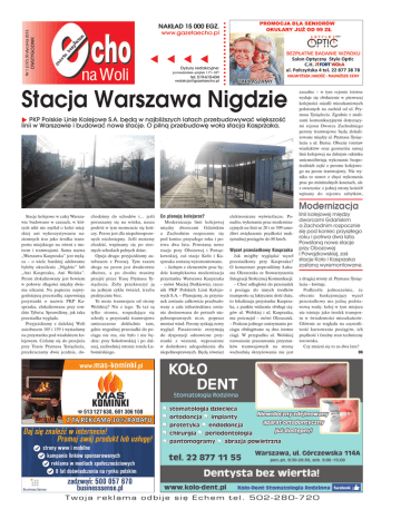 www.gazetaecho.pl DWUTYGODNIK Nr 1 (137) 30 stycznia 2015 NAKŁAD 15 000 EGZ. na Woli Dyżury redakcyjne: poniedziałek–piątek 1100–1800 tel. 519-610-434 [email protected] Stacja Warszawa Nigdzie PKP Polskie Linie Kolejowe S.A. będą w najbliższych latach przebudowywać większość linii w Warszawie i budować nowe stacje. O pilną przebudowę woła stacja Kasprzaka. zasadne – w tym rejonie istotne wydaje się obsłużenie w pierwszej kolejności osiedli mieszkaniowych położonych na zachód od ul. Prymasa Tysiąclecia. Zgodnie z analizami komunikacyjnymi dotyczącymi rejonu Dworca Zachodniego perony tramwajowe będą zlokalizowane między al. Prymasa Tysiąclecia a ul. Bema. Obecny rozstaw wiaduktów oraz geometria samej linii kolejowej na dalszym odcinku uniemożliwiają wykonanie bezpośrednich zejść z peronu kolejowego na peron tramwajowy. Nie wynika to nawet z chęci wykonania prac po minimalnych kosztach, ale z otoczenia: z jednej strony kościół wpisany do rejestru zabytków, Modernizacja Stacje kolejowe w całej Warszawie budowano w czasach, w których nikt nie myślał o kolei miejskiej ani wykorzystywaniu naziemnych tras jako środka transportu miejskiego na równi z metrem i tramwajami. Sama nazwa „Warszawa Kasprzaka” jest myląca – o wiele bardziej adekwatne byłoby określenie „Nigdzie” lub „Ani Kasprzaka, Ani Wolska”. Peron zlokalizowany jest bowiem w połowie długości między dwiema ulicami. Na papierze najwygodniejszą przesiadkę zapewniają przystanki o nazwie PKP Kasprzaka, zlokalizowane przy rondzie Tybetu. Sprawdźmy, jak taka przesiadka wygląda. Przyjeżdżamy z dalekiej Woli autobusem 105 i 159 i wysiadamy na przystanku pod wiaduktem kolejowym. Cofamy się do przejścia przy Trasie Prymasa Tysiąclecia, przekraczamy dwie jezdnie, do- chodzimy do schodów i… jeśli poruszamy się na wózku, nasza podróż w tym momencie się kończy. Peron jest dla niepełnosprawnych niedostępny. Jeśli możemy chodzić, wspinamy się po stromych schodach pełnych dziur. Opcja druga: przyjeżdżamy autobusem z Prostej. Tym razem droga na peron jest dwukrotnie dłuższa, a po drodze musimy przejść przez Trasę Prymasa Tysiąclecia. Żeby przekroczyć ją na jednym cyklu świateł, trzeba praktycznie biec. To może tramwajem od strony Wolskiej? Nic z tego. Tu też są tylko strome, rozpadające się schody a przystanki tramwajowe umieszczono dokładnie tam, gdzie wygodnej przesiadki do pociągu nie ma, nie było i nie będzie: przy Sokołowskiej i po dalszej, zachodniej stronie ronda Lubomirskiego. Co planują kolejarze? Modernizacja linii kolejowej między dworcami Gdańskim a Zachodnim rozpocznie się pod koniec przyszłego roku i potrwa dwa lata. Powstaną nowe stacje przy Obozowej i Powązkowskiej, zaś stacje Koło i Kasprzaka zostaną wyremontowane. – Jednym z elementów prac będzie kompleksowa modernizacja przystanku Warszawa Kasprzaka – mówi Maciej Dutkiewicz, rzecznik PKP Polskich Linii Kolejowych S.A. – Planujemy, że przystanek zostanie całkowicie przebudowany a cała infrastruktura zostanie dostosowana do potrzeb niepełnosprawnych m.in. poprzez montaż wind. Perony zyskają nowy wygląd. Pasażerowie otrzymają do dyspozycji odnowione przystanki z wiatami, wyposażone w dodatkowe udogodnienia dla niepełnosprawnych. Będą również elektroniczne wyświetlacze. Ponadto, wykonanie prac modernizacyjnych na linii nr 20 i nr 509 umożliwi zwiększenie prędkości maksymalnej pociągów do 80 km/h. Węzeł przesiadkowy Kasprzaka Jak mógłby wyglądać węzeł przesiadkowy przy Kasprzaka? O komentarz poprosiliśmy Łukasza Oleszczuka ze Stowarzyszenia Integracji Stołecznej Komunikacji: – Choć odległości do przesiadek z pociągu do innych środków transportu są faktycznie dość duże, to lokalizacja przystanku Kasprzaka, z punktu widzenia obsługi ciągów ul. Wolskiej i ul. Kasprzaka, ma potencjał – mówi Oleszczuk. – Podczas jednego zatrzymania pociągu obsługiwane są dwa istotne ciągi. W przypadku ul. Wolskiej rozważanie przesuwania przystanków tramwajowych na stronę wschodnią skrzyżowania nie jest linii kolejowej między dworcami Gdańskim a Zachodnim rozpocznie się pod koniec przyszłego roku i potrwa dwa lata. Powstaną nowe stacje przy Obozowej i Powązkowskiej, zaś stacje Koło i Kasprzaka zostaną wyremontowane. z drugiej strony al. Prymasa Tysiąclecia – kwituje. Podkreśla jednocześnie, że obecnie funkcjonujący węzeł przesiadkowy ma jedną podstawową wadę: kolej w tym miejscu nie istnieje jako środek transportu w świadomości mieszkańców. Głównie ze względu na częstotliwość kursowania pociągów, ich prędkość i fatalny stan techniczny torowiska. Czy zmieni się to za dwa lata? Twoja reklama odbije się Echem tel. 502-280-720 DG Zapraszamy do współpracy mieszkańców. Nie zwracamy materiałów niezamawianych. Zastrzegamy sobie prawo do skracania i adiustowania nadesłanych materiałów oraz opatrywania ich własnym tytułem. Nie odpowiadamy za treść reklam i ogłoszeń. Wydawca: Wydawnictwo Prasowe Ostoja 2012 sp. z o.o. adres redakcji: 03-026 Warszawa, ul. Bohaterów 18a Druk: Edytor Sp. z o.o., Olsztyn telefon dla czytelników: 519 610 435, 22 614 58 28 telefon dla reklamodawców: 502 280 720, 22 614 58 03 e-mail: [email protected] Aneta Skubida – świeża krew na Woli Aneta Skubida, jedyna niezależna radna dzielnicy wybrana z listy Stowarzyszenia Mieszkańców „Wola Zmian”, deklaruje, że zamierza słuchać tylko mieszkańców. W dzieciństwie nie myślała o polityce czy działalności społecznej – chciała zostać… maklerem giełdowym. – Kiedy miałam pięć lat, dostałam w prezencie grę, która tak się nazywała. Bardzo spodobała mi się ta nazwa, choć do końca nie wiedziałam, kim ów makler jest i czym się zajmuje. To jednak spowodowało, że zainteresowałam się matematyką, która stała się moim ulubionym szkolnym przedmiotem. Poza tym zaws