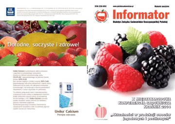 ISSN 2299-0593 www.polskiesadownictwo.pl Wydanie specjalne Informator Biuletyn Związku Sadowników Rzeczpospolitej Polskiej Informator Wydanie specjalne X międzynarodowa KONFERENCJA SADOWNICZA KRAŚNIK 2014 „Aktualności w produkcji owoców jagodowych i pestkowych” ISSN 2299-0593 www.polskiesadownictwo.pl Wydanie specjalne Informator Biuletyn Związku Sadowników Rzeczpospolitej Polskiej Informator Wydanie specjalne X międzynarodowa KONFERENCJA SADOWNICZA KRAŚNIK 2014 „Aktualności w produkcji owoców jagodowych i pestkowych” WWW.POLSKIESADOWNICTWO.PL Szanowni Państwo Spotykamy się już po raz dziesiąty na konferencji poświęconej produkcji owoców miękkich organizowanej w Kraśniku. Związek Sadowników RP realizuje ją przy współudziale starosty kraśnickiego, Uniwersytetu Przyrodniczego w Lublinie, Sadowniczego Zakładu Doświadczalnego IO w Brzeznej. Konferencję patronatem objęli minister rolnictwa i rozwoju wsi – Stanisław Kalemba oraz marszałek województwa lubelskiego – Krzysztof Hetman. Od ubiegłego roku konferencja zyskała nową jakość. Dzięki doskonałej współpracy ze starostą kraśnickim, Andrzejem Majem, mogliśmy podnieść jakość oraz rangę tej imprezy. Nowa lokalizacja pozwoliła nam rozwinąć skrzydła. Możliwości ekspozycyjne oraz wieloletnie doświadczenie pozwalają nam na stwierdzenie, że jest ona jedną z najważniejszych imprez branżowych w kraju. Z każdym rokiem staramy się podnosić jej poziom. Tak jest i w tym roku. Głównym punktem programu konferencji jest wystąpienie naszego honorowego gościa Antonio Domingueza – prezydenta IRO Światowej Organizacji Producentów Malin. Wiedza i doświadczenie Antonio Domingueza pozwala mi na stwierdzenie, że będzie to jeden z najważniejszych wykładów w dotychczasowej historii naszej konferencji. To doskonała okazja do zapoznania się zarówno z najnowszymi trendami w produkcji na świecie, jak i z sytuacją panującą na rynkach zbytu. Mając na uwadze planowaną w maju br. Światową Konferencję Producentów Malin w Chinach, będziemy mieli wyjątkową możliwość dotarcia do wiedzy, jaka będzie tam prezentowana, bez konieczności wyjeżdżania z kraju. Ponadto w tej jubileuszowej konferencji swoje referaty wygłoszą Prelegenci należący do polskiej elity nauki sadowniczej. Gwarantują Oni najwyższą jakość nowoczesnej wiedzy z dziedziny technologii i ekonomiki produkcji. W dalszym ciągu konferencja ma formę otwartą. Wstęp jest bezpłatny. Pozwala to na sięgnięcie po najnowszą wiedzę również tym, których nie stać na wysiłek finansowy w postaci opłaty wstępu. W produkcji owoców miękkich, a zwłaszcza malin, drobnych producentów w naszym regionie jest wielu. Owoce z małych plantacji stanowią pokaźną część surowca trafiającego do przetwórców. W sytuacji zmieniających się przepisów, szczególnie sanitarnych, nie możemy bagatelizować tej grupy plantatorów. Życząc Państwu owocnych obrad, mamy nadzieję, że sprostamy wszystkim oczekiwaniom. W celu uatrakcyjnienia imprezy zapraszamy również na pokazy kulinarne, jakie odbywać się będą w części handlowej. Promować się tam będą firmy i placówki gastronomiczne zajmujące się przetwarzaniem i produkcją wyrobów z użyciem tak powszechnie obecnych na naszym rynku owoców. Z wyrazami szacunku Wiceprezes Związku Sadowników RP Tomasz Solis X Międzynarodowa konferencja sadownicza w Kraśniku „Aktualności w produkcji owoców jagodowych i pestkowych” 31 stycznia – 1 lutego 2014 Organizatorzy: współOrganizator: Sadowniczy Zakład Doświadczalny IO Brzezna Partnerzy medialni: Partnerzy: Starosta Kraśnicki Ptronat honorowy: Minister Rolnictwa i Rozwoju Wsi Sponsor główny: Patronat branżowy: Marszałek Województwa Lubelskiego Patronat medialny: Opieka medialna: WWW.POLSKIESADOWNICTWO.PL Spis treści 1 Powitanie uczestników Konferencji – Tomasz Solis 3 Wykorzystanie potencjału drogą do realnego sukcesu – Andrzej Maj 4 Pracownik sezonowy w sadownictwie – co dalej? Kto będzie zrywał owoce? – Mirosław Maliszewski 6 Jak prawidłowo liczyć koszty produkcji na przykładzie maliny – Dariusz Paszko 10 Preparaty aminokwasowe w żywieniu roślin jagodowych i pestkowych – Zbigniew Jarosz, Paweł Krawiec, Kamil Jobda 12 Rokitnik – gatunek uprawiany w świecie i przyszłościowo w Polsce – Stanisław Pluta 17 Najważniejsze choroby i szkodniki maliny. Zalecenia w ochronie oparte na najnowszych rozwiązaniach Bayer CropScience – Tomasz Gasparski 20 Maliny w szkockiej technologii – Mariusz Podymniak 23 A może jeżyna…? – Jan Danek, Agnieszka Orzeł, Katarzyna Król-Dyrek 25 Wstępna ocena wybranych odmian i klonów maliny wyhodowanych w SZD Brzezna – Wojciech Zaweracz, Agnieszka Faron-Szpilowska, Joanna Szczygieł-Wysocka Wydawca: Związek Sadowników Rzeczpospolitej Polskiej ul. J. Piłsudskiego 59 05-600 Grójec tel./faks: 48 664 37 79 e-mail: [email protected] www.polskiesadownictwo.pl Hortpress Sp. z o.o. ul. Rakowiecka 32 02-532 Warszawa tel. 22 826 16 26 e-mail: [email protected] www.hortpress.com 2 28 Podstawowe zasady prowadzenia fertygacji gatunków jagodowych na przykładzie maliny – Andrzej Grenda 31 Malina czarna – przydatność owoców i uprawa – Mirosława Baranowska-Krauze, Agnieszka Orzeł, Marta Kula 33 Produkcja sadzonek maliny typu longcane (długopędowych) – Agnieszka Orzeł, Katarzyna Król-Dyrek 36 Wyniki doświadczeń wdrożeniowych w uprawach maliny i borówki amerykańskiej w sezonie 2013 – Paweł Krawiec, Michał Pniak, Zbigniew Jarosz 45 Pożyteczni drapieżcy w uprawach jagodowych – Katarzyna Golan 49 Omacnica jarzębinianka zagraża aronii czarnoowocowej – Edyta Górska-Drabik 51 Próba charakterystyki rynku truskawek, malin i czarnych porzeczek – Grzegorz Klimek 61 Czy Polska może być krajem winnic? – Magdalena Kapłan 65 Winiarstwo w praktyce – Stowarzyszenie Winiarzy Małopolskiego Przełomu Wis