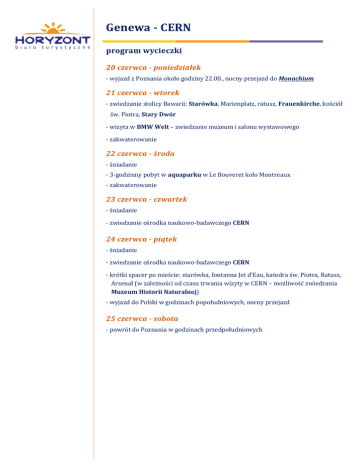 Genewa - CERN program wycieczki 20 czerwca - poniedziałek - wyjazd z Poznania około godziny 22.00., nocny przejazd do Monachium 21 czerwca - wtorek - zwiedzanie stolicy Bawarii: Starówka, Marienplatz, ratusz, Frauenkirche, kościół św. Piotra, Stary Dwór - wizyta w BMW Welt – zwiedzanie muzeum i salonu wystawowego - zakwaterowanie 22 czerwca - środa - śniadanie - 3-godzinny pobyt w aquaparku w Le Bouveret koło Montreaux - zakwaterowanie 23 czerwca - czwartek - śniadanie - zwiedzanie ośrodka naukowo-badawczego CERN 24 czerwca - piątek - śniadanie - zwiedzanie ośrodka naukowo-badawczego CERN - krótki spacer po mieście: starówka, fontanna Jet d’Eau, katedra św. Piotra, Ratusz, Arsenał (w zależności od czasu trwania wizyty w CERN – możliwość zwiedzania Muzeum Historii Naturalnej) - wyjazd do Polski w godzinach popołudniowych, nocny przejazd 25 czerwca - sobota - powrót do Poznania w godzinach przedpołudniowych Zakres świadczeń Niniejsza oferta obejmuje następujące świadczenia: Najwyższej jakości autokar z klimatyzacją Transport nowoczesnym autokarem – klimatyzacja – barek z napojami – DVD, wygodne fotele WAŻNE: Obsadę stanowią doświadczeni na trasach europejskich kierowcy. Noclegi – 2 noclegi ze śniadaniami w hotelu Formule 1: pokoje 2-osobowe, łóżka piętrowe, łazienki na piętrach – nocleg ze śniadaniem w schronisku młodzieżowym w Monachium: pokoje 4-6 osobowe z łazienkami – sprawdzone, bezpieczne miejsca dla grup szkolnych Bilety wstępu do zwiedzanych obiektów – opłacone wstępy dla wszystkich uczestników – potwierdzone wszystkie niezbędne rezerwacje Wyżywienie – wyżywienie według programu wycieczki (możliwość zamówienia dodatkowych posiłków) – spełniamy życzenia osób będących na specjalnej diecie – prosimy o kontakt Stała opieka doświadczonego pilota – najbardziej doświadczeni w wyjazdach zagranicznych piloci – doskonała znajomość języków obcych – w trakcie wycieczki pilot dba o organizację całego wyjazdu oraz udziela informacji krajoznawczych w odwiedzanych miejscach Pakiet bezpieczeństwa – program wycieczki przygotowany w taki sposób, by zapewnić maksymalne bezpieczeństwo uczestnikom – ubezpieczenie kosztów leczenia za granicą na sumę 10 000€ – ubezpieczenie następstw nieszczęśliwych wypadków za granicą na sumę 2 000€ – ubezpieczenie bagażu podróżnego na sumę 200€ Całkowite koszty wyjazdu dla jednej osoby: Liczba uczestników Cena 44 uczniów + 4 opiekunów 1050zł + 32CHF 40 uczniów + 4 opiekunów 1110zł + 32 CHF