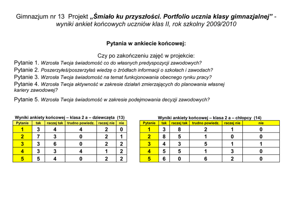 Gimnazjum nr 13 Projekt „Śmiało ku przyszłości. Portfolio ucznia klasy gimnazjalnej” wyniki ankiet końcowych uczniów klas II, rok szkolny 2009/2010 Pytania w ankiecie końcowej: Czy po zakończeniu zajęć w projekcie: Pytanie 1. Wzrosła Twoja świadomość co do własnych predyspozycji zawodowych? Pytanie 2. Poszerzyłeś/poszerzyłaś wiedzę o źródłach informacji o szkołach i zawodach? Pytanie 3. Wzrosła Twoja świadomość na temat funkcjonowania obecnego rynku pracy? Pytanie 4. Wzrosła Twoja aktywność w zakresie działań zmierzających do planowania własnej kariery zawodowej? Pytanie 5. Wzrosła Twoja świadomość w zakresie podejmowania decyzji zawodowych? Wyniki ankiety końcowej – klasa 2 a – dziewczęta (13) Wyniki ankiety końcowej – klasa 2 a – chłopcy (14) Pytanie tak raczej tak trudno powiedz. raczej nie nie Pytanie tak raczej tak trudno powiedz. raczej nie nie 1 2 3 4 5 3 7 3 3 5 4 3 6 3 4 4 0 0 4 0 2 2 2 1 2 0 1 2 2 2 1 2 3 4 5 3 8 4 5 6 8 5 3 5 0 2 1 5 1 6 1 0 1 3 2 0 0 1 0 0 Wyniki ankiety końcowej – klasa 2 b – dziewczęta (15 Pytanie tak 1 2 3 4 5 1 4 2 2 4 raczej tak trudno powiedz. raczej nie 8 4 2 3 3 6 4 5 3 3 0 2 5 5 2 Wyniki ankiety końcowej – klasa 2 b – chłopcy (15) nie Pytanie tak 0 1 1 2 3 1 2 3 4 5 7 5 5 4 6 Wyniki ankiety końcowej – klasa 2 c – dziewczęta (16) Pytanie tak 1 2 3 4 5 7 11 4 5 7 raczej tak trudno powiedz. raczej nie 7 4 9 8 8 2 1 2 2 1 0 0 1 1 0 tak 1 2 3 4 5 1 9 2 3 3 raczej tak trudno powiedz. raczej nie 9 9 8 6 11 5 1 7 7 5 2 0 2 1 0 2 5 3 4 3 3 2 2 3 3 2 1 2 2 1 nie 1 2 3 2 2 Wyniki ankiety końcowej – klasa 2 c – chłopcy (17) nie Pytanie tak 0 0 0 0 0 1 2 3 4 5 9 8 4 7 7 Wyniki ankiety końcowej – klasa 2 d – dziewczęta (19) Pytanie raczej tak trudno powiedz. raczej nie raczej tak trudno powiedz. raczej nie 4 8 7 6 6 3 0 5 3 4 1 1 0 1 0 nie 0 0 1 0 0 Wyniki ankiety końcowej – klasa 2 d – chłopcy (10) nie Pytanie tak 2 0 0 2 0 1 2 3 4 5 2 4 4 3 2 raczej tak trudno powiedz. raczej nie 4 4 4 3 4 3 2 2 2 3 0 0 0 1 1 nie 1 0 0 1 0 Wyniki ankiety końcowej – klasa 2 e – dziewczęta (11) Pytanie tak 1 2 3 4 5 0 3 1 4 3 raczej tak trudno powiedz. raczej nie 3 4 4 3 4 3 2 3 2 2 3 2 1 2 2 Wyniki ankiety końcowej – klasa 2 e – chłopcy (16) nie Pytanie tak 2 0 2 0 0 1 2 3 4 5 8 7 5 8 11 Wyniki ankiety końcowej – klasa 2 f – dziewczęta (11) Pytanie tak 1 2 3 4 5 3 5 5 6 2 raczej tak trudno powiedz. raczej nie 6 2 2 2 3 0 1 2 2 3 0 3 0 0 1 tak 1 2 3 4 5 3 3 3 2 2 raczej tak trudno powiedz. raczej nie 3 3 1 4 4 0 0 2 0 0 0 0 0 0 0 4 4 9 5 2 2 3 1 0 1 1 1 0 1 0 nie 1 1 1 2 2 Wyniki ankiety końcowej – klasa 2 f – chłopcy (16) nie Pytanie tak 2 0 2 3 0 1 2 3 4 5 3 5 3 4 7 Wyniki ankiety końcowej – klasa 2 g – dziewczęta (6) Pytanie raczej tak trudno powiedz. raczej nie raczej tak trudno powiedz. raczej nie 9 6 6 8 4 3 3 5 3 5 1 2 2 1 0 nie 0 0 0 0 0 Wyniki ankiety końcowej – klasa 2 g – chłopcy (12) nie Pytanie tak 0 0 0 0 0 1 2 3 4 5 4 3 4 5 6 raczej tak trudno powiedz. raczej nie 5 4 1 3 5 2 4 3 4 1 1 1 2 0 0 nie 0 0 2 0 0 Ankieta łączna podsumowująca klasy 2 Gimnazjum nr 13 Pytania w ankiecie końcowej: Czy po zakończeniu zajęć w projekcie: Pytanie 1. Wzrosła Twoja świadomość co do własnych predyspozycji zawodowych? Pytanie 2. Poszerzyłeś/poszerzyłaś wiedzę o źródłach informacji o szkołach i zawodach? Pytanie 3. Wzrosła Twoja świadomość na temat funkcjonowania obecnego rynku pracy? Pytanie 4. Wzrosła Twoja aktywność w zakresie działań zmierzających do planowania własnej kariery zawodowej? Pytanie 5. Wzrosła Twoja świadomość w zakresie podejmowania decyzji zawodowych? Wyniki ankiety końcowej klasa 2 – dziewczęta (91) Wyniki ankiety końcowej klasa 2 – chłopcy (100) Pytanie tak raczej tak trudno powiedz. raczej nie nie Pytanie tak raczej tak 1 2 3 4 5 18 42 20 25 26 40 29 32 29 37 20 10 21 18 14 7 8 11 10 7 6 2 7 9 7 1 2 3 4 5 36 40 29 36 45 36 36 33 34 24 trudno powiedz. raczej nie 18 15 23 16 23 7 6 7 9 4 nie 3 3 8 5 4 klasy 2 - chłopcy 45 40 35 30 25 20 15 10 5 0 liczba uczniów liczba uczniów klasy 2 - dziewczęta 1 2 3 4 50 40 30 20 10 0 1 5 2 3 raczej tak trudno powiedz. 5 numery pytań numery pytań tak 4 raczej nie tak nie raczej tak trudno powiedz. raczej nie nie klasy 2 łącznie Wyniki ankiety końcowej łączne klas 2 (191) Pytanie tak raczej tak trudno powiedz. raczej nie nie 1 2 3 4 5 54 82 49 61 71 76 65 65 63 61 38 25 44 34 37 14 14 18 19 11 9 5 15 14 11 100 80 liczba uczniów 60 40 20 0 1 tak raczej tak 2 3 numery pytań trudno powiedz. 4 raczej nie 5 nie