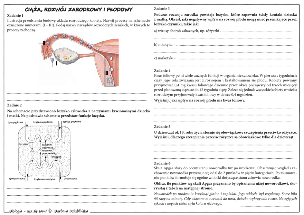 CIĄŻA, ROZWÓJ ZARODKOWY I PŁODOWY Zadanie 1 Ilustracja przedstawia budowę układu rozrodczego kobiety. Nazwij procesy na schemacie oznaczone numerami (I - III). Podaj nazwy narządów rozrodczych żeńskich, w których te procesy zachodzą. Zadanie 3 Podczas rozwoju zarodka powstaje łożysko, które zapewnia ścisły kontakt dziecka z matką. Określ, jaki negatywny wpływ na rozwój płodu mogą mieć przenikające przez łożysko czynniki, takie jak: a) wirusy chorób zakaźnych, np. różyczki - ............................................................................... .......................................................................................................................................................... b) nikotyna - ................................................................................................................................... .......................................................................................................................................................... c) narkotyki - .................................................................................................................................. .......................................................................................................................................................... .......................................................................................................................................................... Zadnie 2 Na schemacie przedstawiono łożysko człowieka z naczyniami krwionośnymi dziecka i matki. Na podstawie schematu przedstaw funkcje łożyska. .......................................................................................................................................................... Zadanie 4 Kwas foliowy pełni wiele ważnych funkcji w organizmie człowieka. W pierwszy tygodniach ciąży jego rola związana jest z rozwojem i kształtowaniem się płodu. Kobiety powinny przyjmować 0,4 mg kwasu foliowego dziennie przez okres począwszy od trzech miesięcy przed planowaną ciążą aż do 12 tygodnia ciąży. Zaleca się jednak wszystkie kobiety w wieku rozrodczym przyjmowały kwas foliowy w dawce 0,4 mg/dzień. Wyjaśnij, jaki wpływ na rozwój płodu ma kwas foliowy. .......................................................................................................................................................... .......................................................................................................................................................... .......................................................................................................................................................... Zadanie 5 U dziewcząt ok 13. roku życia stosuje się obowiązkowe szczepienia przeciwko różyczce. Wyjaśnij, dlaczego szczepienia przeciw różyczce są obowiązkowe tylko dla dziewcząt. .......................................................................................................................................................... .......................................................................................................................................................... .......................................................................................................................................................... .......................................................................................................................................................... .......................................................................................................................................................... Biologia - ucz się sam! C Barbara Dziublińska .......................................................................................................................................................... Zadanie 6 Skala Apgar służy do oceny stanu noworodka tuż po urodzeniu. Obserwując wygląd i zachowanie noworodka przyznaje się od 0 do 2 punktów w pięciu kategoriach. Po zsumowaniu punktów formułuje się ogólne wnioski dotyczące stanu zdrowia noworodka. Oblicz, ile punktów wg skali Apgar przyznano by opisanemu niżej noworodkowi, skorzystaj z tabeli na następnej stronie. Noworodek po urodzeniu krzyknął głośno i zapłakał. Jego oddech był regularny. Serce biło 95 razy na minutę. Gdy włożono mu cewnik do nosa, dziecko wykrzywiło twarz. Na zgiętych rękach i nogach skóra była koloru różowego. ...................................................... Kryteria oceny Punktacja 0 1 2 Kolor skóry sina, blada tułów różowy, barwa kończyn sina różowa Czynność serca brak poniżej 100 uderzeń/minutę ponad 100 uderzeń/minutę Reakcja na bodźce wprowadzenie cewnika do nosa brak reakcji grymas twarz krzyk, kichanie, kaszel Napięcie mięśni brak, wiotkie słabe prawidłowe, kończyny zgięte brak nieregularne, słaby krzyk prawidłowe, głośny krzyk Oddychanie Zadanie 7 Przeanalizuj schemat i odpowiedz na pytania: a) Który schemat (A czy B) przedstawia bliźnięta jednojajowe, a który dwujajowe? c) Zaprojektuj tabelę, w której porównasz płeć bliźniąt, ich podobieństwo oraz ilość łożysk, które wykształcają się w trakcie ciąży u bliźniąt jednojajowych i dwujajowych. Zadanie 8 W tabeli zawarto dane dotyczące zwiększenia się długości ciała płodu (wartości średnie) w trakcie trwania ciąży. Przedstaw dane liczbowe w formie wykresu liniowego ilustrującego zależność zwiększania się długości ciała dziecka od czasu trwania ciąży. wiek [tygodnie] długość ciała [cm] 8 2 12 6 16 11 20 16 .......................................................................................................................................................... 24 30 ..........................................................................................................................