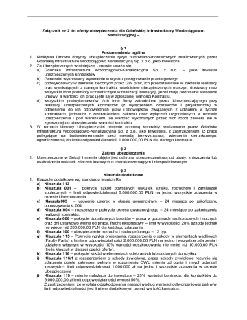 Załącznik nr 2 do oferty ubezpieczenia dla Gdańskiej Infrastruktury WodociągowoKanalizacyjnej – §1 Postanowienia ogólne 1. Niniejsza Umowa dotyczy ubezpieczenia ryzyk budowlano-montażowych realizowanych przez Gdańską Infrastrukturę Wodociągowo Kanalizacyjną Sp. z o.o. jako Inwestora 2. Za Ubezpieczonych w niniejszej Umowie uważa się: a) Gdańska Infrastruktura Wodociągowo-Kanalizacyjna Sp. z o.o. – jako inwestor ubezpieczonych kontraktów b) Generalni wykonawcy wyłonienie w wyniku postępowanie przetargowego c) podwykonawcy w zakresie zleconych przez GW prac, ich przedstawiciele w zakresie realizacji prac wynikających z danego kontraktu, właściciele ubezpieczonych maszyn, dostawcy oraz wszystkie inne podmioty uczestniczące w realizacji inwestycji, jeżeli mają podpisane stosowne umowy, a wartości ich prac ujęte są w zgłoszonej wartości Kontraktu. d) wszystkich podwykonawców i/lub inne firmy zatrudnione przez Ubezpieczającego przy realizacji ubezpieczonych kontraktów (z wyłączeniem dostawców i projektantów) w odniesieniu do ich odpowiednich praw i obowiązków związanych z udziałem w tychże kontraktach, jednakże z zastrzeżeniem zakresu oraz wyłączeń uzgodnionych w umowie ubezpieczenia i pod warunkiem, że wartość wykonanych przez nich robót zawiera się w zgłoszonej do ubezpieczenia wartości kontraktu. 3. W ramach Umowy Ubezpieczyciel obejmie ochroną kontrakty realizowane przez Gdańska Infrastruktura Wodociągowo-Kanalizacyjna Sp. z o.o. jako Inwestora, z zastrzeżeniem, iż prace polegające na budowie/remoncie sieci metodą bezwykopową, wiercenia kierunkowego, ograniczone są do limitu odpowiedzialności: 1.000.000,00 PLN dla danego kontraktu. §2 Zakres ubezpieczenia 1. Ubezpieczone w Sekcji I mienie objęte jest ochroną ubezpieczeniową od utraty, zniszczenia lub uszkodzenia wskutek zdarzeń losowych o charakterze nagłym i niespodziewanym. §3 Klauzule dodatkowe 1. Klauzule dodatkowe wg standardu Munich Re a) Klauzula 112 b) Klauzula 001 – pokrycie szkód powstałych wskutek strajku, rozruchów i zamieszek społecznych – limit odpowiedzialności 5.000.000,00 PLN na jedno wszystkie zdarzenia w okresie Ubezpieczenia c) Klauzula 003 – usuwanie usterek w okresie gwarancyjnym – 24 miesiące po zakończeniu obowiązywania kl. 004, d) Klauzula 004 – rozszerzone pokrycie okresu gwarancyjnego – 24 miesiące po zakończeniu realizacji kontraktu, e) Klauzula 006 – pokrycie dodatkowych kosztów – praca w godzinach nadliczbowych i nocnych oraz dni ustawowo wolne od pracy, fracht ekspresowy – limit w wysokości 20% szkody jednak nie więcej niż 200.000,00 PLN dla każdego zdarzenia, f) Klauzula 100 – ubezpieczenie rozruchu i ruchu próbnego – 12 tyg. g) Klauzula 115 – Pokrycie ryzyka projektanta, rozszerzenie o szkody w elementach wadliwych (Faulty Parts) z limitem odpowiedzialności 2.000.000,00 PLN na jedno i wszystkie zdarzenia i udziałem własnym w wysokości 10% wartości odszkodowania nie mniej niż 10.000,00 PLN (treść klauzuli w dalszej części oferty), h) Klauzula 116 – pokrycie szkód w elementach odebranych lub oddanych do użytku, i) Klauzula 116/1 z rozszerzeniem o szkody żywiołowe, przez szkody żywiolowe rozumie się zdarzenia objęte zakresem pełnym w rozumieniu OWU mienia od ognia i innych zdarzeń losowych – limit odpowiedzialności 1.000.000 zł na jedno i wszystkie zdarzenia w okresie Ubezpieczenia j) Klauzula 119 – mienie należące do inwestora – 25% wartości kontraktu, dla kontraktów do 5.000.000,00 zł limit odpowiedzialności wynosi 50%. Z zastrzeżeniem, że wypłata odszkodowania nastąpi według wartości odtworzeniowej zaś w/w limit odpowiedzialności jest limitem dodatkowym ponad wartość kontraktu. k) Klauzula 200 Ryzyko producenta – klauzula ma zastosowanie wyłącznie do fabrycznie nowych maszyn i urządzeń, l) Klauzula 201 - okres gwarancyjny (24 miesięcy), limit 1.000.000,00 PLN, udział własny w wysokości 10% wartości odszkodowania nie mniej niż 10.000,00 PLN m) Klauzula 218 Ubezpieczenie kosztów odnalezienia przecieku podczas kładzenia rurociągów z limitem odpowiedzialności 100.000,00 PLN na jedno i wszystkie zdarzenia i udziałem własnym w wysokości 10% wartości odszkodowania nie mniej niż 10.000,00 PLN n) Klauzula wzrostu wartości kontraktu – max o 30% o) Klauzula przedłużenia okresu ubezpieczenia – 90 dni, p) Klauzula wynagrodzenia rzeczoznawców - limit odpowiedzialności: 50.000,00 PLN na zdarzenie pod warunkiem, że wynagrodzenie dla rzeczoznawców nie przekroczy średnich stawek obowiązujących na rynku dla tego typu usług. q) Klauzula odtworzenie planów i dokumentów, limit 50.000,00 PLN, r) Klauzula 113– transport lądowy na terenie RP z limitem 250.000,00 PLN na jeden środek transportu. s) Klauzula 013 – Składowanie mienia poza terenem budowy – limit odpowiedzialności: 1.000.000,00 PLN na jedno i wszystkie zdarzenia w okresie ubezpieczenia. 2. Pozostałe klauzule dodatkowe a) Klauzula likwidacji drobnych szkód, b) Klauzula 72 godzin, c) Klauzula przewłaszczenia mienia, d) Klauzula wypowiedzenia umowy e) Klauzula określająca system wyliczenia zwrotu składek i dopłat składek z tytułu realizowanych doubezpieczeń f) Klauzula płatności składki i czasu ochrony g) Klauzula automatycznego odtworzenia wysokości sumy ubezpieczenia po szkodzie h) Klauzula kosztów dodatkowych, i) Klauzula stałości warunków umowy i taryf ubezpieczeniowych j) Klauzula niezawiadomienia w terminie o szkodzie, k) Klauzula potrącania rat, l) Klauzula zgłaszania szkód, m) Klauzula ubezpieczenia w okresie przestoju (standstill cover) n) Klauzula regresowa o) Klauzula ubezpieczenia dodatkowych kosztów oczyszczenia, konserwacji itp. p) Pokrycie kosztów poszukiwania wycieku w rurociągu. §4 Suma ubezpieczenia 1. Wysokość sumy ubezpieczenia w odniesieniu do Sekcji I (mienie): a) 18.000.000,00 PLN jako maksymalna wartość pojedynczego 