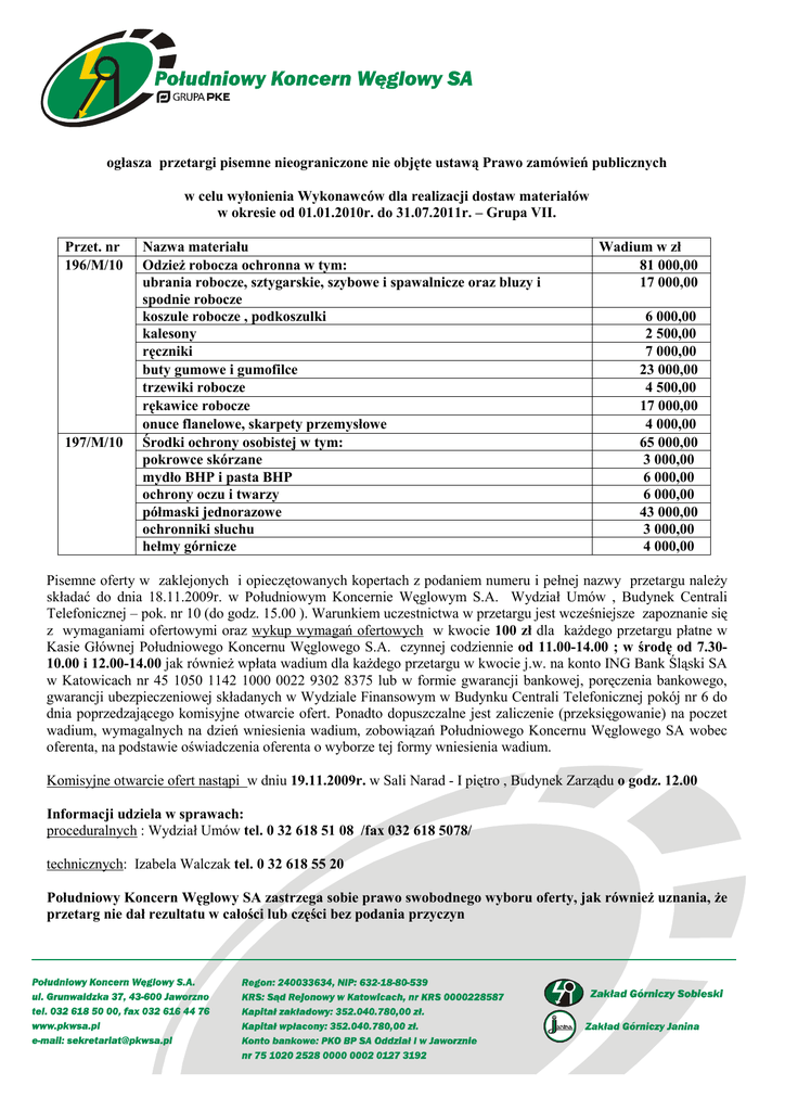 ogłasza przetargi pisemne nieograniczone nie objęte ustawą Prawo zamówień publicznych w celu wyłonienia Wykonawców dla realizacji dostaw materiałów w okresie od 01.01.2010r. do 31.07.2011r. – Grupa VII. Przet. nr 196/M/10 197/M/10 Nazwa materiału OdzieŜ robocza ochronna w tym: ubrania robocze, sztygarskie, szybowe i spawalnicze oraz bluzy i spodnie robocze koszule robocze , podkoszulki kalesony ręczniki buty gumowe i gumofilce trzewiki robocze rękawice robocze onuce flanelowe, skarpety przemysłowe Środki ochrony osobistej w tym: pokrowce skórzane mydło BHP i pasta BHP ochrony oczu i twarzy półmaski jednorazowe ochronniki słuchu hełmy górnicze Wadium w zł 81 000,00 17 000,00 6 000,00 2 500,00 7 000,00 23 000,00 4 500,00 17 000,00 4 000,00 65 000,00 3 000,00 6 000,00 6 000,00 43 000,00 3 000,00 4 000,00 Pisemne oferty w zaklejonych i opieczętowanych kopertach z podaniem numeru i pełnej nazwy przetargu naleŜy składać do dnia 18.11.2009r. w Południowym Koncernie Węglowym S.A. Wydział Umów , Budynek Centrali Telefonicznej – pok. nr 10 (do godz. 15.00 ). Warunkiem uczestnictwa w przetargu jest wcześniejsze zapoznanie się z wymaganiami ofertowymi oraz wykup wymagań ofertowych w kwocie 100 zł dla kaŜdego przetargu płatne w Kasie Głównej Południowego Koncernu Węglowego S.A. czynnej codziennie od 11.00-14.00 ; w środę od 7.3010.00 i 12.00-14.00 jak równieŜ wpłata wadium dla kaŜdego przetargu w kwocie j.w. na konto ING Bank Śląski SA w Katowicach nr 45 1050 1142 1000 0022 9302 8375 lub w formie gwarancji bankowej, poręczenia bankowego, gwarancji ubezpieczeniowej składanych w Wydziale Finansowym w Budynku Centrali Telefonicznej pokój nr 6 do dnia poprzedzającego komisyjne otwarcie ofert. Ponadto dopuszczalne jest zaliczenie (przeksięgowanie) na poczet wadium, wymagalnych na dzień wniesienia wadium, zobowiązań Południowego Koncernu Węglowego SA wobec oferenta, na podstawie oświadczenia oferenta o wyborze tej formy wniesienia wadium. Komisyjne otwarcie ofert nastąpi w dniu 19.11.2009r. w Sali Narad - I piętro , Budynek Zarządu o godz. 12.00 Informacji udziela w sprawach: proceduralnych : Wydział Umów tel. 0 32 618 51 08 /fax 032 618 5078/ technicznych: Izabela Walczak tel. 0 32 618 55 20 Południowy Koncern Węglowy SA zastrzega sobie prawo swobodnego wyboru oferty, jak równieŜ uznania, Ŝe przetarg nie dał rezultatu w całości lub części bez podania przyczyn