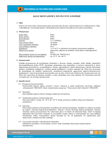 porządzona zgodnie z Rozporządzeniem REACH 1907/2006 z późniejszymi zmianami Sporządzona zgodnie z Rozporządzeniem (WE) nr 1907/2006 z późniejszymi zmianami KLEJ MONTAŻOWY FIX PŁYNNY GWÓŹDŹ 1. Opis Gotowy do użycia klej o konsystencji pasty przeznaczony do prac wykończeniowych w budownictwie. Daje wodoodporną i wytrzymałą spoinę o doskonałej przyczepności początkowej do typowych podłoży. 2. Właściwości Kolor kleju: Kolor spoiny: Konsystencja: Gęstość: Czas otwarty kleju: Czas wstępnego wiązania: Czas pełnego wiązania: Wydajność: Właściwości spoiny: Wytrzymałość spoiny na rozciąganie: Odporność spoiny na temperaturę: biały; biały; pasta; 1,2 ± 0,05kg/L; 10 minut; 30 minut; 24 h; 1,5-3 m²/L w zależności od rodzaju i porowatości podłoża; elastyczna, odporna na działanie wody (klasa wodoodporności D3); 30 MPa (ok. 300 kG/cm²); od -15 ºC do +60 ºC. 3. Zastosowanie Produkt przeznaczony do przyklejania elementów z drewna, metalu, ceramiki, szkła, sklejki, materiałów drewnopodobnych, korka, PCW, styropianu, poliuretanu oraz materiałów z tworzyw sztucznych tj. listwy dekoracyjne przysufitowe i przypodłogowe, ekrany zagrzejnikowe, płytki dekoracyjne, listewki drewniane, plafony, wykładziny podłogowe i ścienne, panele podłogowe i ścienne, laminaty itp. Może być stosowany do przyklejania do podłoży betonowych, cementowo-wapiennych, gipsowych, gipsowo-kartonowych, kamiennych i innych porowatych powierzchni oraz do płyt wiórowych, pilśniowych, kompozytowych, itp. Może być stosowany do klejenia ociepleń z wełny mineralnej oraz waty szklanej. Do stosowania zarówno wewnątrz jak i na zewnątrz pomieszczeń. 4. Sposób użycia 4.1. Przygotowanie powierzchni Powierzchnie klejone należy oczyścić z kurzu i tłuszczu w miarę możliwości wyrównać, odtłuścić „Denaturatem” DRAGON. Stare wymalowania usunąć np. "Zmywaczem farb i lakierów" DRAGON. 4.2. Narzędzia Klej nakładać poprzez króciec dozujący dołączony do kartusza. 4.3. Temperatura podczas wykonywania prac Prace prowadzić w temp. od +10 ºC do +25 ºC (temp. powietrza, podłoża, kleju oraz klejonych elementów). 4.4. Zalecenia Klej nanieść punktowo lub pasmami na podłoże lub element przyklejany. Dodatkowo nałożyć po kropli na rogach i końcach klejonych przedmiotów. Złączyć i mocno docisnąć klejone przedmioty. Klejone elementy można pozycjonować bez odrywania przez 10 minut od nałożenia kleju. Jeżeli występują naprężenia lub mocowane elementy są szczególnie ciężkie należy je unieruchomić do czasu pełnego utwardzenia. Pełną wytrzymałość spoina uzyskuje po ok. 24 godzinach. Po zakończeniu prac opakowanie z klejem szczelnie zamknąć. 4.5. Czyszczenie narzędzi i zabrudzonych elementów Zabrudzone narzędzia i świeże plamy czyścić wodą. Zaschnięty klej można usunąć jedynie mechanicznie. data aktualizacji: 04-11-2014 r. Strona 1 z 2 porządzona zgodnie z Rozporządzeniem REACH 1907/2006 z późniejszymi zmianami Sporządzona zgodnie z Rozporządzeniem (WE) nr 1907/2006 z późniejszymi zmianami 4.6. Rozcieńczanie kleju Nie zaleca się rozcieńczania kleju. 4.7. Ograniczenia i uwagi Przed zastosowaniem sprawdzić odporność materiału na działanie kleju. 5. Gramatura Kod towaru DKMF300 DKMF300/BG-RO Pojemność 300 ml 300 ml Typ opakowania kartusz kartusz 6. Okres ważności 2 lata. 7. Uwagi Warunki transportowania i magazynowania: Transportować i przechowywać w szczelnie zamkniętym, oryginalnym opakowaniu w temp. od +5 ºC do +30 ºC. Chronić przed dziećmi. Pozostałe uwagi: W trakcie prowadzenia prac oraz po ich zakończeniu pomieszczenie należy intensywnie wietrzyć aż do zaniku charakterystycznego zapachu. Nie klei PP, PE, PTFE. Przemrożony klej trwale traci swoje właściwości. Mieszanina ta nie spełnia kryteriów klasyfikacji jako niebezpieczna zgodnie z rozporządzeniem dyrektywy 1999/45/WE Parlamentu Europejskiego i Rady z dnia 31 maja 1999 r. w sprawie zbliżenia przepisów ustawowych, wykonawczych i administracyjnych Państw Członkowskich odnoszących się do klasyfikacji, pakowania i etykietowania preparatów niebezpiecznych, w związku z czym nie jest dla niej sporządzona karta charakterystyki zgodnie z Rozporządzeniem (WE) Nr 1907/2006 Parlamentu Europejskiego i Rady z dnia 18 grudnia 2006 roku w sprawie rejestracji, oceny, udzielania zezwoleń i stosowanych ograniczeń w zakresie chemikaliów (REACH), utworzenia Europejskiej Agencji Chemikaliów, zmieniające dyrektywę 1999/45/WE oraz uchylające rozporządzenie Rady (EWG) nr 793/93 i rozporządzenie Komisji (WE) nr 1488/94, jak również dyrektywę Rady 76/769/EWG i dyrektywy Komisji 91/155/EWG, 93/67/EWG, 93/105/WE i 2000/21/WE z późniejszymi zmianami. data aktualizacji: 04-11-2014 r. Strona 2 z 2