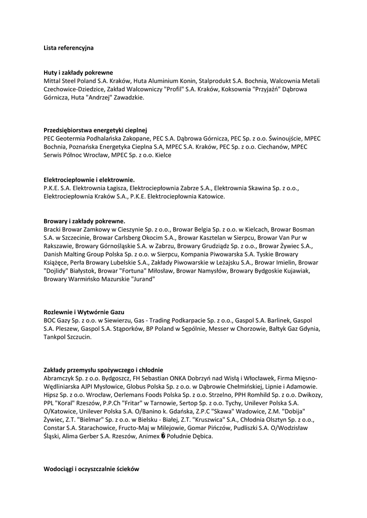 Lista referencyjna Huty i zakłady pokrewne Mittal Steel Poland S.A. Kraków, Huta Aluminium Konin, Stalprodukt S.A. Bochnia, Walcownia Metali Czechowice-Dziedzice, Zakład Walcowniczy "Profil" S.A. Kraków, Koksownia "Przyjaźo" Dąbrowa Górnicza, Huta "Andrzej" Zawadzkie. Przedsiębiorstwa energetyki cieplnej PEC Geotermia Podhalaoska Zakopane, PEC S.A. Dąbrowa Górnicza, PEC Sp. z o.o. Świnoujście, MPEC Bochnia, Poznaoska Energetyka Cieplna S.A, MPEC S.A. Kraków, PEC Sp. z o.o. Ciechanów, MPEC Serwis Północ Wrocław, MPEC Sp. z o.o. Kielce Elektrociepłownie i elektrownie. P.K.E. S.A. Elektrownia Łagisza, Elektrociepłownia Zabrze S.A., Elektrownia Skawina Sp. z o.o., Elektrociepłownia Kraków S.A., P.K.E. Elektrociepłownia Katowice. Browary i zakłady pokrewne. Bracki Browar Zamkowy w Cieszynie Sp. z o.o., Browar Belgia Sp. z o.o. w Kielcach, Browar Bosman S.A. w Szczecinie, Browar Carlsberg Okocim S.A., Browar Kasztelan w Sierpcu, Browar Van Pur w Rakszawie, Browary Górnośląskie S.A. w Zabrzu, Browary Grudziądz Sp. z o.o., Browar Żywiec S.A., Danish Malting Group Polska Sp. z o.o. w Sierpcu, Kompania Piwowarska S.A. Tyskie Browary Książęce, Perła Browary Lubelskie S.A., Zakłady Piwowarskie w Leżajsku S.A., Browar Imielin, Browar "Dojlidy" Białystok, Browar "Fortuna" Miłosław, Browar Namysłów, Browary Bydgoskie Kujawiak, Browary Warmiosko Mazurskie "Jurand" Rozlewnie i Wytwórnie Gazu BOC Gazy Sp. z o.o. w Siewierzu, Gas - Trading Podkarpacie Sp. z o.o., Gaspol S.A. Barlinek, Gaspol S.A. Pleszew, Gaspol S.A. Stąporków, BP Poland w Sępólnie, Messer w Chorzowie, Bałtyk Gaz Gdynia, Tankpol Szczucin. Zakłady przemysłu spożywczego i chłodnie Abramczyk Sp. z o.o. Bydgoszcz, FH Sebastian ONKA Dobrzyo nad Wisłą i Włocławek, Firma MięsnoWędliniarska AJPI Mysłowice, Globus Polska Sp. z o.o. w Dąbrowie Chełmioskiej, Lipnie i Adamowie. Hipsz Sp. z o.o. Wrocław, Oerlemans Foods Polska Sp. z o.o. Strzelno, PPH Romhild Sp. z o.o. Dwikozy, PPL "Koral" Rzeszów, P.P.Ch "Fritar" w Tarnowie, Sertop Sp. z o.o. Tychy, Unilever Polska S.A. O/Katowice, Unilever Polska S.A. O/Banino k. Gdaoska, Z.P.C "Skawa" Wadowice, Z.M. "Dobija" Żywiec, Z.T. "Bielmar" Sp. z o.o. w Bielsku - Białej, Z.T. "Kruszwica" S.A., Chłodnia Olsztyn Sp. z o.o., Constar S.A. Starachowice, Fructo-Maj w Milejowie, Gomar Pioczów, Pudliszki S.A. O/Wodzisław Śląski, Alima Gerber S.A. Rzeszów, Animex � Południe Dębica. Wodociągi i oczyszczalnie ścieków O.Ś. Rybarzowice, PWiK Brzeg, RPWiK Sp. z o.o. w Chrzanowie, Sądeckie Wodociągi Sp. z o.o., ZPWiK Sp. z o.o. Zabrze, ZWiK Jędrzejów, ZWiK Sp. z o.o. Rabka, MPWiK Sp. z o.o. Leszno, PWiK Sp. z o.o. Rybnik, Wodociągi Kieleckie Sp. z o.o., PWiK Sp. z o.o. Suwałki, Wodociągi Kieleckie Sp. z o.o., PWiK Sosnowiec, PWiK Skawina, O.Ś. Krzeszowice (Rudno), PWiK Wodzisław Śląski Mleczarnie Cz.S.M. "Mleczgal", OSM Chmielnik, R.S.M. Racibórz, S.M. Świecka w Świeciu, OSM Krzepice, OSM Opatów, OSM Zamośd, Spomlek Radzyo Podlaski, OSM Skierniewice, OSM Koło. Zakłady chemiczne i pokrewne. Brenntag Polska Sp. z o.o. O/Zgierz, C.F. Gomma Poland Sp. z o.o. Częstochowa, Cementownia Nowa Huta w Krakowie, PCC Rokita AGRO S.A., Brzeg Dolny, Z.CH. Rokita S.A., Brzeg Dolny, TBD Dębica, Tikkurila Dębica, ZACHEM S.A. w Bydgoszczy, ZTS ERG S.A. w Pustkowie, ESSE Quatro we Włocławku, Saniec Koło S.A. O/Włocławek, Reckitt Benckiser Nowy Dwór Mazowiecki, P.P.S "ARHOS" S.A. Racibórz, Polmos S.A. Kraków. Centra handlowe i dystrybucyjne Vos Silo Logistic w Płocku, Annopol w Warszawie, Makro Cash And Carry Poland S.A. w Krakowie, Poznaniu, Sosnowcu, Ząbkach K/Warszawy, C.H. "Rondo" w Bydgoszczy, C.H. "Osowa" w Gdaosku, C.H. "Fort Wola" w Warszawie. Hotele Atrium Hotel Kraków, ORBIS Hotel "ARIA" Sosnowiec , ORBIS Hotel "NOVOTEL" Katowice, ORBIS Hotel "Warszawa" Katowice, ORBIS Hotel "Magura" Bielsko- Biała, ORBIS Hotel "Wanda" Kraków, ORBIS Hotel Częstochowa, ORBIS Hotel "GRAND" Warszawa, ORBIS Hotel "Mercure-Patria" Częstochowa, ORBIS Hotel "Mercure Unia" w Lublinie, ORBIS "Novotel Bronowice" Kraków, ORBIS Hotel "Francuski" Kraków, ORBIS Hotel "Mrogovia" Mrągowo, ORBIS Hotel "Silesia" Katowice, Ponad 300 Spółdzielni Mieszkaniowych Ponad 500 Firm Instalacyjnych.