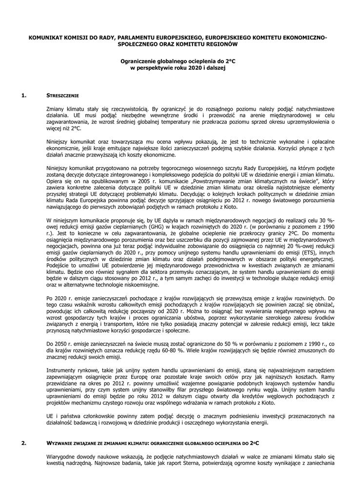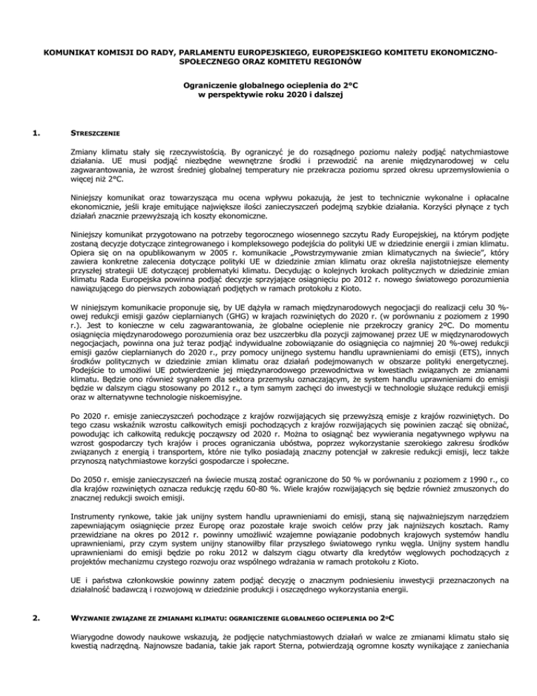 KOMUNIKAT KOMISJI DO RADY, PARLAMENTU EUROPEJSKIEGO, EUROPEJSKIEGO KOMITETU EKONOMICZNOSPOŁECZNEGO ORAZ KOMITETU REGIONÓW Ograniczenie globalnego ocieplenia do 2°C w perspektywie roku 2020 i dalszej 1. STRESZCZENIE Zmiany klimatu stały się rzeczywistością. By ograniczyć je do rozsądnego poziomu naleŜy podjąć natychmiastowe działania. UE musi podjąć niezbędne wewnętrzne środki i przewodzić na arenie międzynarodowej w celu zagwarantowania, Ŝe wzrost średniej globalnej temperatury nie przekracza poziomu sprzed okresu uprzemysłowienia o więcej niŜ 2°C. Niniejszy komunikat oraz towarzysząca mu ocena wpływu pokazują, Ŝe jest to technicznie wykonalne i opłacalne ekonomicznie, jeśli kraje emitujące największe ilości zanieczyszczeń podejmą szybkie działania. Korzyści płynące z tych działań znacznie przewyŜszają ich koszty ekonomiczne. Niniejszy komunikat przygotowano na potrzeby tegorocznego wiosennego szczytu Rady Europejskiej, na którym podjęte zostaną decyzje dotyczące zintegrowanego i kompleksowego podejścia do polityki UE w dziedzinie energii i zmian klimatu. Opiera się on na opublikowanym w 2005 r. komunikacie „Powstrzymywanie zmian klimatycznych na świecie”, który zawiera konkretne zalecenia dotyczące polityki UE w dziedzinie zmian klimatu oraz określa najistotniejsze elementy przyszłej strategii UE dotyczącej problematyki klimatu. Decydując o kolejnych krokach politycznych w dziedzinie zmian klimatu Rada Europejska powinna podjąć decyzje sprzyjające osiągnięciu po 2012 r. nowego światowego porozumienia nawiązującego do pierwszych zobowiązań podjętych w ramach protokołu z Kioto. W niniejszym komunikacie proponuje się, by UE dąŜyła w ramach międzynarodowych negocjacji do realizacji celu 30 %owej redukcji emisji gazów cieplarnianych (GHG) w krajach rozwiniętych do 2020 r. (w porównaniu z poziomem z 1990 r.). Jest to konieczne w celu zagwarantowania, Ŝe globalne ocieplenie nie przekroczy granicy 2ºC. Do momentu osiągnięcia międzynarodowego porozumienia oraz bez uszczerbku dla pozycji zajmowanej przez UE w międzynarodowych negocjacjach, powinna ona juŜ teraz podjąć indywidualne zobowiązanie do osiągnięcia co najmniej 20 %-owej redukcji emisji gazów cieplarnianych do 2020 r., przy pomocy unijnego systemu handlu uprawnieniami do emisji (ETS), innych środków politycznych w dziedzinie zmian klimatu oraz działań podejmowanych w obszarze polityki energetycznej. Podejście to umoŜliwi UE potwierdzenie jej międzynarodowego przewodnictwa w kwestiach związanych ze zmianami klimatu. Będzie ono równieŜ sygnałem dla sektora przemysłu oznaczającym, Ŝe system handlu uprawnieniami do emisji będzie w dalszym ciągu stosowany po 2012 r., a tym samym zachęci do inwestycji w technologie słuŜące redukcji emisji oraz w alternatywne technologie niskoemisyjne. Po 2020 r. emisje zanieczyszczeń pochodzące z krajów rozwijających się przewyŜszą emisje z krajów rozwiniętych. Do tego czasu wskaźnik wzrostu całkowitych emisji pochodzących z krajów rozwijających się powinien zacząć się obniŜać, powodując ich całkowitą redukcję począwszy od 2020 r. MoŜna to osiągnąć bez wywierania negatywnego wpływu na wzrost gospodarczy tych krajów i proces ograniczania ubóstwa, poprzez wykorzystanie szerokiego zakresu środków związanych z energią i transportem, które nie tylko posiadają znaczny potencjał w zakresie redukcji emisji, lecz takŜe przynoszą natychmiastowe korzyści gospodarcze i społeczne. Do 2050 r. emisje zanieczyszczeń na świecie muszą zostać ograniczone do 50 % w porównaniu z poziomem z 1990 r., co dla krajów rozwiniętych oznacza redukcję rzędu 60-80 %. Wiele krajów rozwijających się będzie równieŜ zmuszonych do znacznej redukcji swoich emisji. Instrumenty rynkowe, takie jak unijny system handlu uprawnieniami do emisji, staną się najwaŜniejszym narzędziem zapewniającym osiągnięcie przez Europę oraz pozostałe kraje swoich celów przy jak najniŜszych kosztach. Ramy przewidziane na okres po 2012 r. powinny umoŜliwić wzajemne powiązanie podobnych krajowych systemów handlu uprawnieniami, przy czym system unijny stanowiłby filar przyszłego światowego rynku węgla. Unijny system handlu uprawnieniami do emisji będzie po roku 2012 w dalszym ciągu otwarty dla kredytów węglowych pochodzących z projektów mechanizmu czystego rozwoju oraz wspólnego wdraŜania w ramach protokołu z Kioto. UE i państwa członkowskie powinny zatem podjąć decyzję o znacznym podniesieniu inwestycji przeznaczonych na działalność badawczą i rozwojową w dziedzinie produkcji i oszczędnego wykorzystania energii. 2. WYZWANIE ZWIĄZANE ZE ZMIANAMI KLIMATU: OGRANICZENIE GLOBALNEGO OCIEPLENIA DO 2ºC Wiarygodne dowody naukowe wskazują, Ŝe podjęcie natychmiastowych działań w walce ze zmianami klimatu stało się kwestią nadrzędną. Najnowsze badania, takie jak raport Sterna, potwierdzają ogromne koszty wynikające z zaniechania podjęcia działań. Są to koszty gospodarcze, lecz takŜe o charakterze społecznym i środowiskowym, a ponoszone one będą przede wszystkim przez najuboŜszą ludność, zarówno w krajach rozwijających się, jak i rozwiniętych. Bierność pociągnie za sobą powaŜne konsekwencje dla bezpieczeństwa na poziomie lokalnym i światowym. Większość rozwiązań jest juŜ znana, teraz zaś poszczególne rządy muszą podjąć środki polityczne w celu rozpoczęcia ich stosowania. Ekonomiczne koszty związane z walką ze zmianami klimatu są nie tylko moŜliwe do poniesienia, lecz mogą równieŜ przynosić znaczne korzyści dotyczące innych aspektów. Celem UE jest ograniczenie wzrostu średniej globalnej temperatury do maksymalnie 2ºC w stosunku do poziomu sprzed okresu uprzemysłowienia. Pozwoli to na ograniczenie negatywnego wpływu wywieranego przez zmiany klimatu oraz prawdopodobieństwa wystąpienia rozległych i nieodwracalny